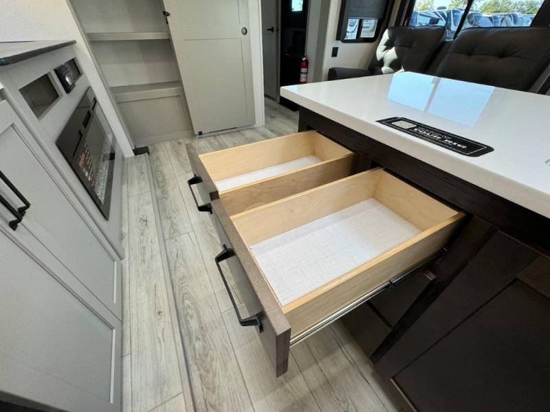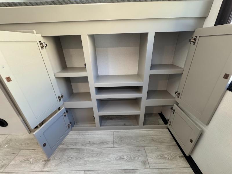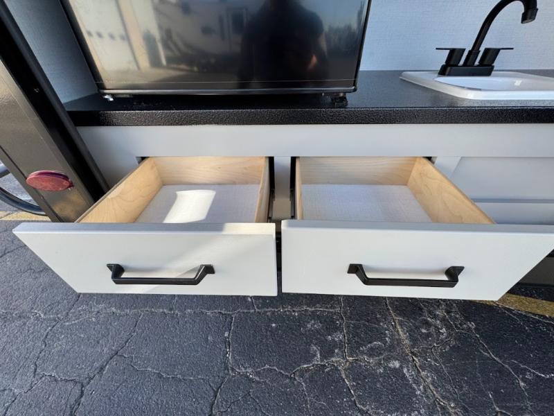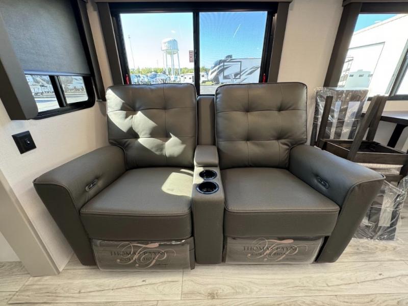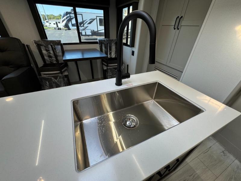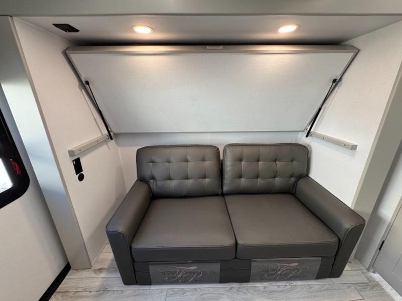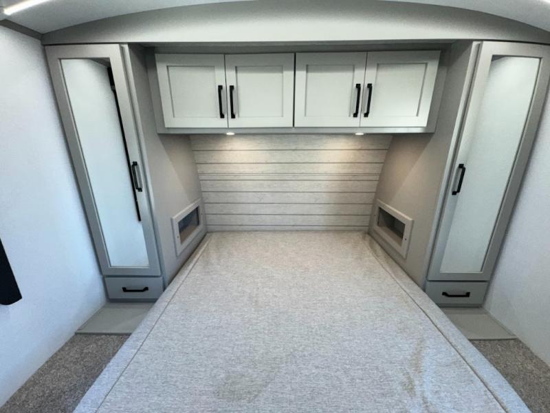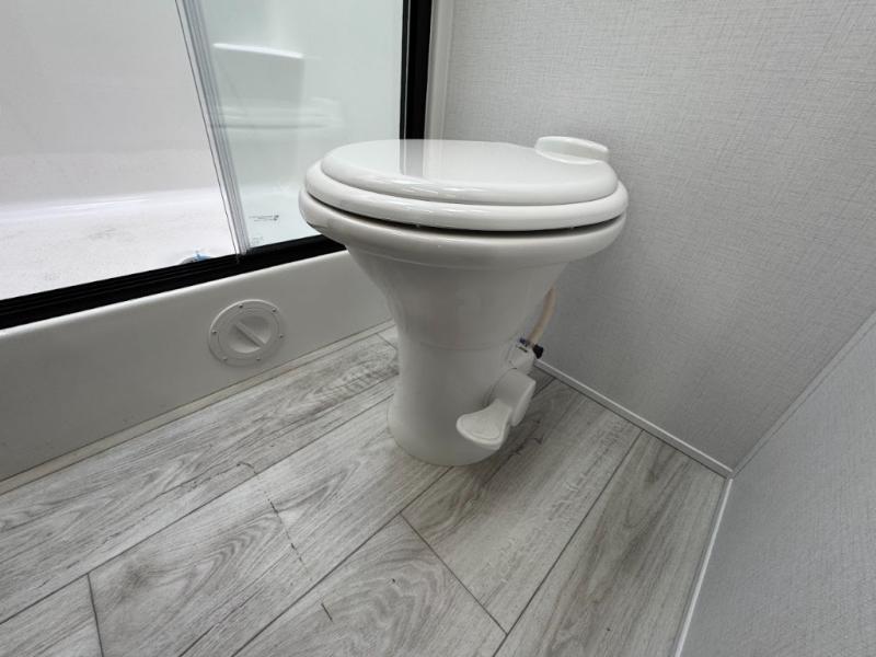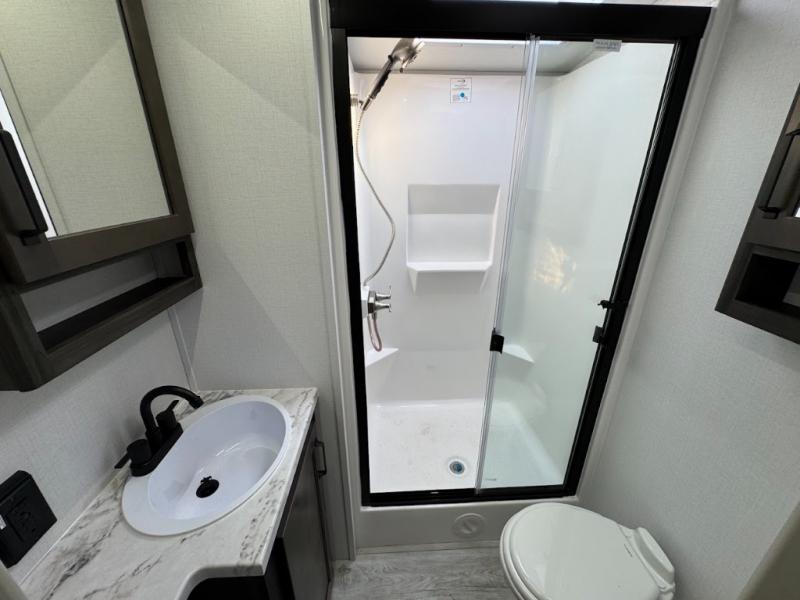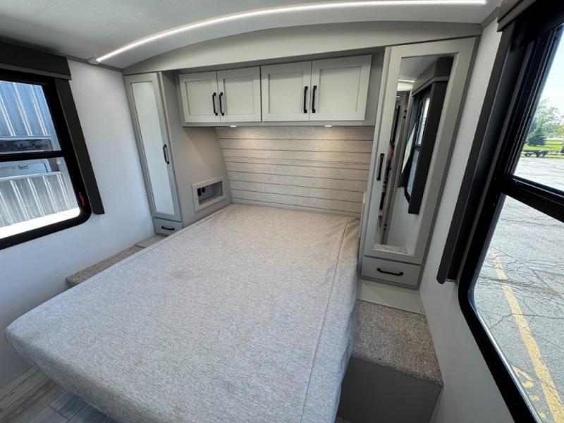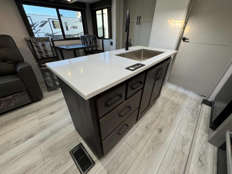 When you enjoy entertaining guests and relaxing both inside and outside at the campgrounds, this trailer has you covered! There is a 20' awning along the exterior, a drop frame pass-through storage to carry larger gear like camping chairs, outdoor tables, fishing poles and such, plus an outside kitchen to make a few meals. The inside is spacious with dual opposing slides in the main living and kitchen area, and the private bunkhouse has a slide out with a sofa sleeper and bunk above. There is a second bunk above an entertainment center that your guests will surely appreciate. You will have a queen bed in the front bedroom, and the full bathroom will keep everyone refreshed. The kitchen has full amenities, plus a kitchen island with a skylight for more natural lighting, a sofa sleeper and booth dinette.