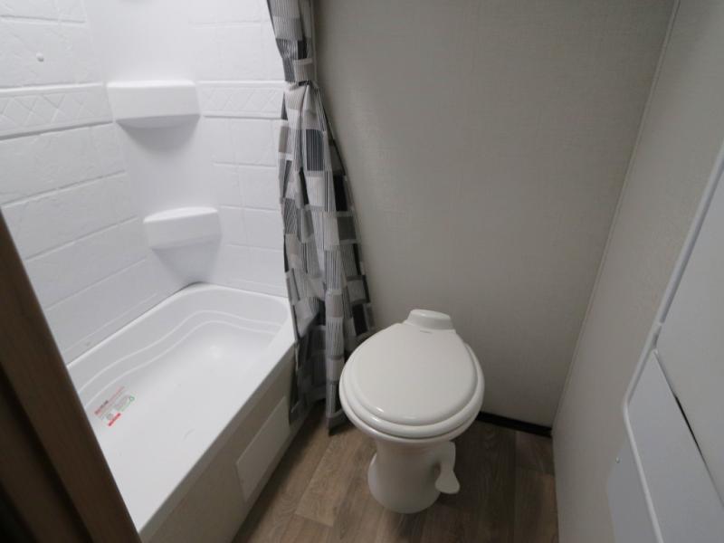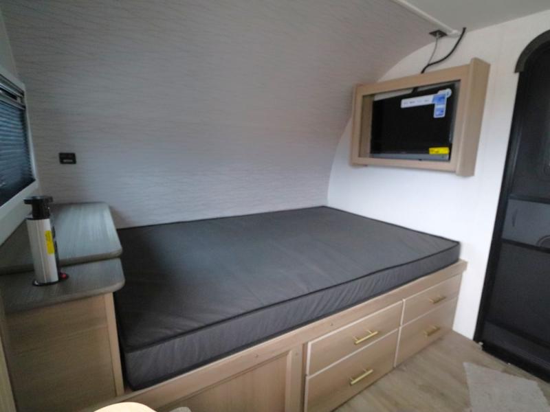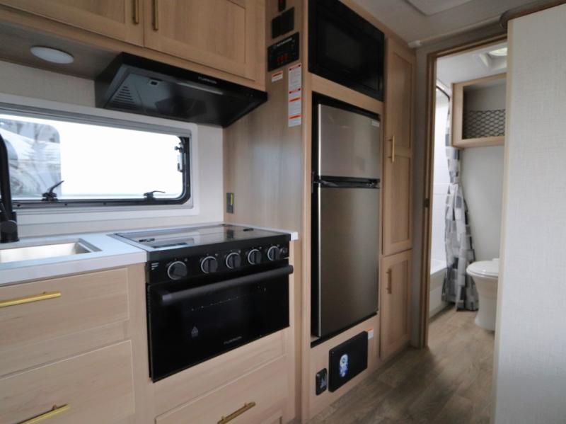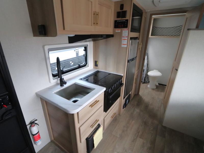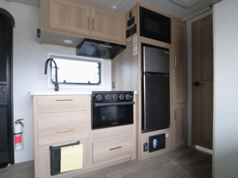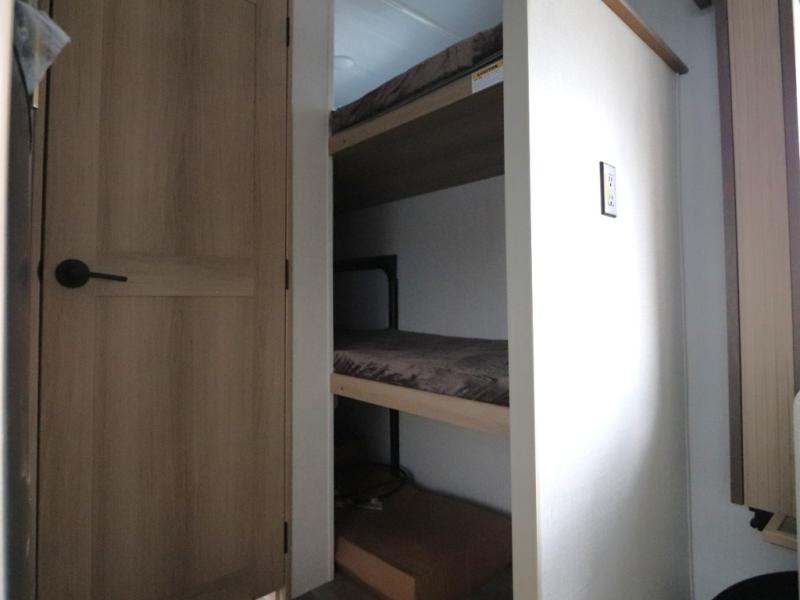 Camping will be an adventure for five or six campers featuring a single slide for added space. A full bed up front features drawers beneath for your clothing, plus flip-up storage and USB ports. With the 32" HDTV on the wall at the foot of the bed you can easily catch a movie before you fall asleep or it can easily be viewed from the comfort of the theater dinette with pivoting tables within the slide out. Two more campers will enjoy the set of 26" x 74" bunk beds along the roadside back corner with flip-up bottom bunk for easy storage beneath. The opposite rear corner houses the full bath with a shower, toilet, and flip-down bath sink. Cooking will be super convenient with a three-burner cooktop, a sink for cleaning up, and there is also a microwave located above the refrigerator for your perishables. On the outside, a 14' awning provides added living space where you can set up your camp chairs and be protected from the sun and rain, plus there is an exterior Suburban griddle to cook burgers outdoors!