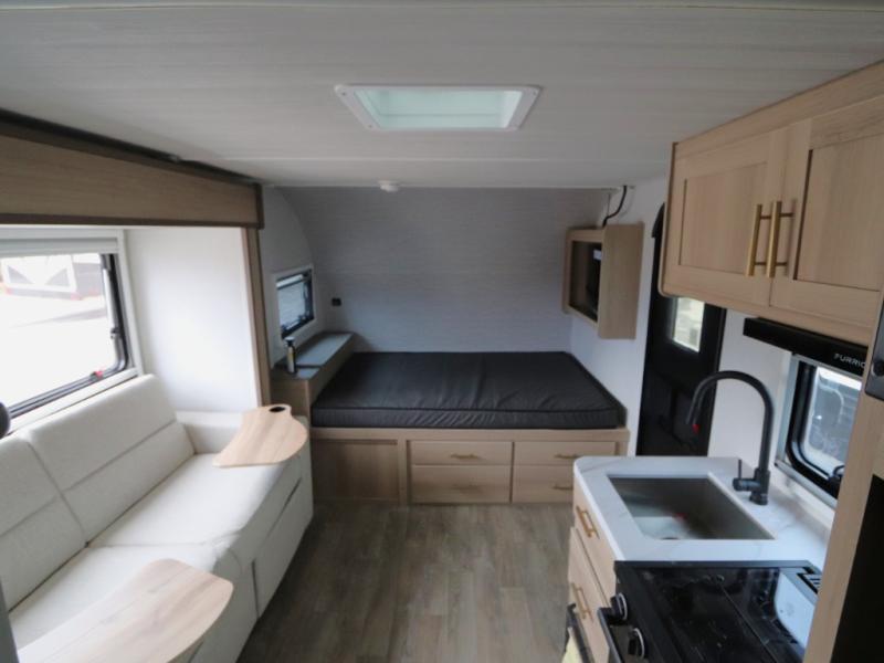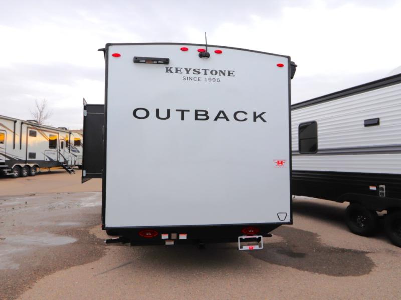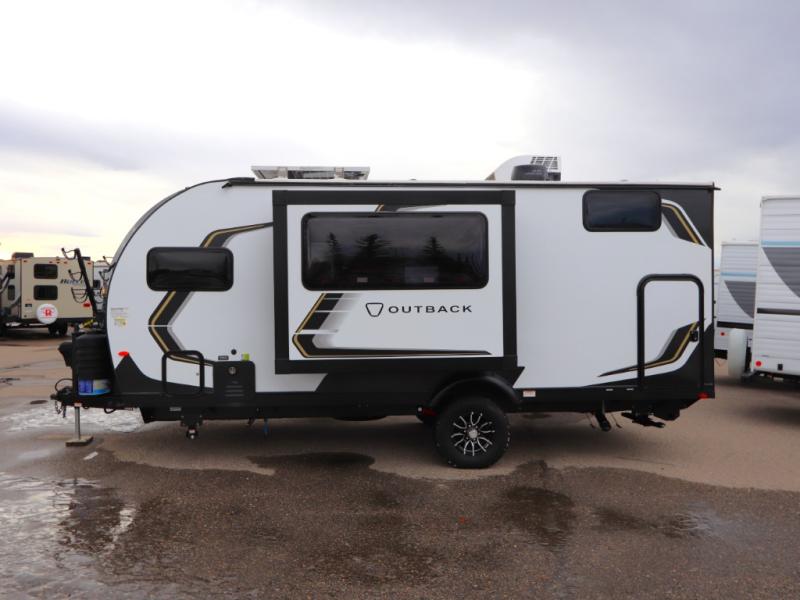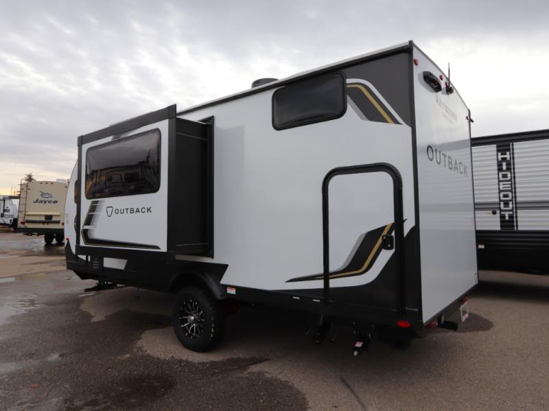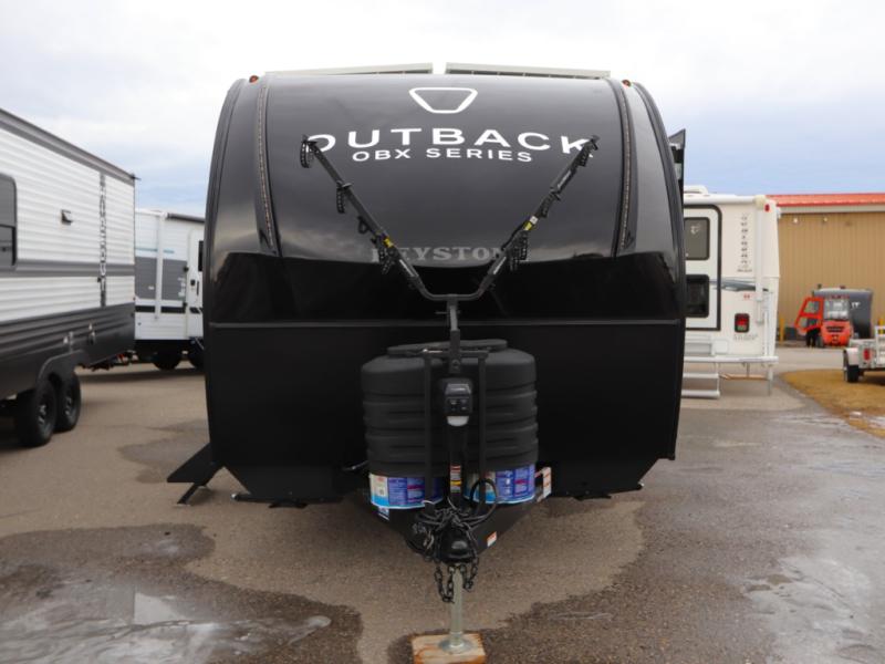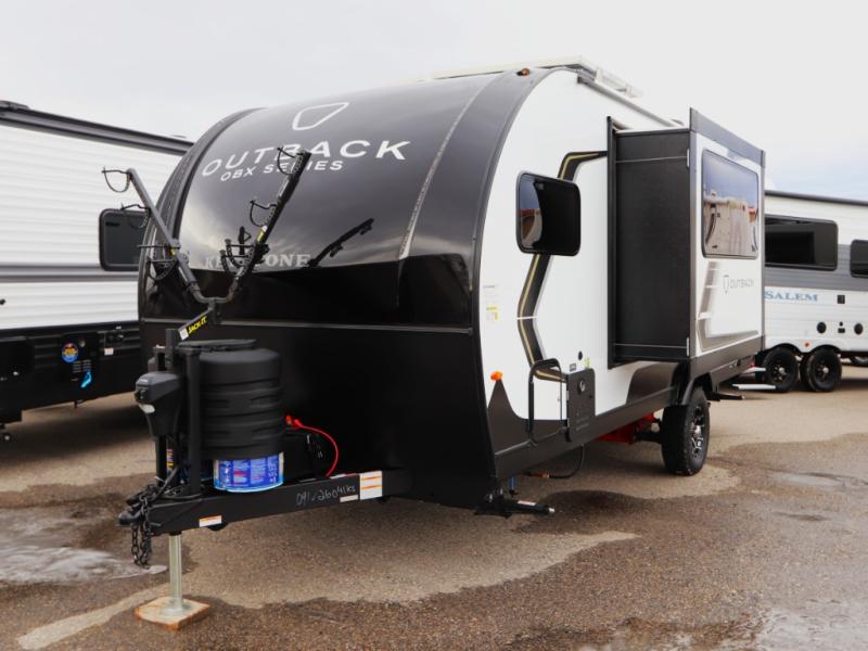 Built for maximum exploration and all types of camping, you are going to love the Outback OBX travel trailers. Each feature a pinched rolled laminated gel-coated fiberglass exterior, fully walkable 3/8" roof decking, plus a one-piece polypropylene heated and enclosed underbelly. There is also a power tongue jack outside, along with an outside shower, solar prep, and back-up camera prep. Inside, you'll enjoy hardwood cabinetry, fiber-glass backed linoleum flooring with no carpet, pressed kitchen countertops, and many more comforts. The on demand hot water heater will provide even more comfort, along with the 18k BTU A/C with a variable speed compressor.