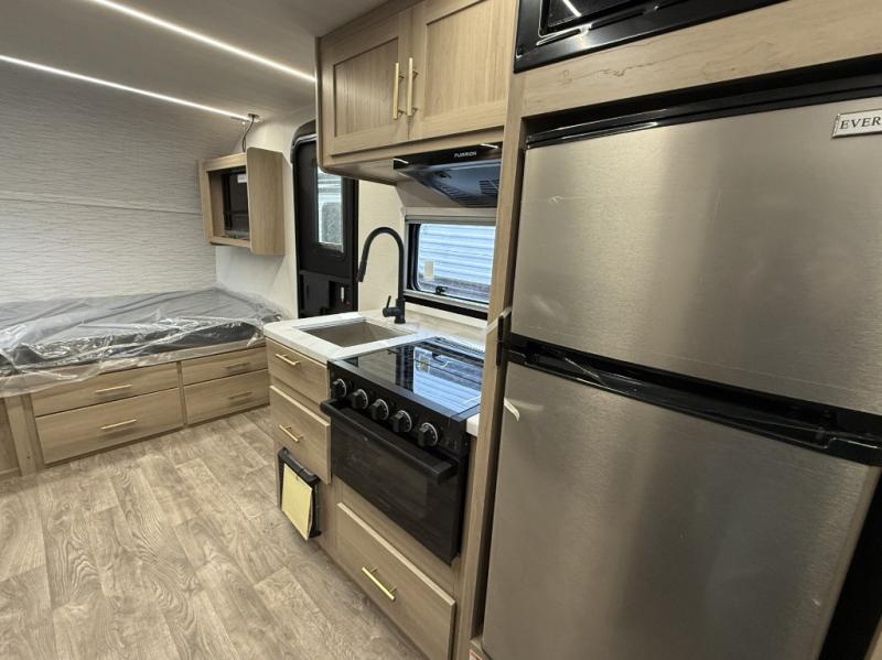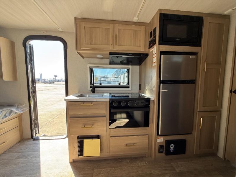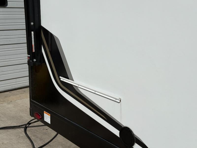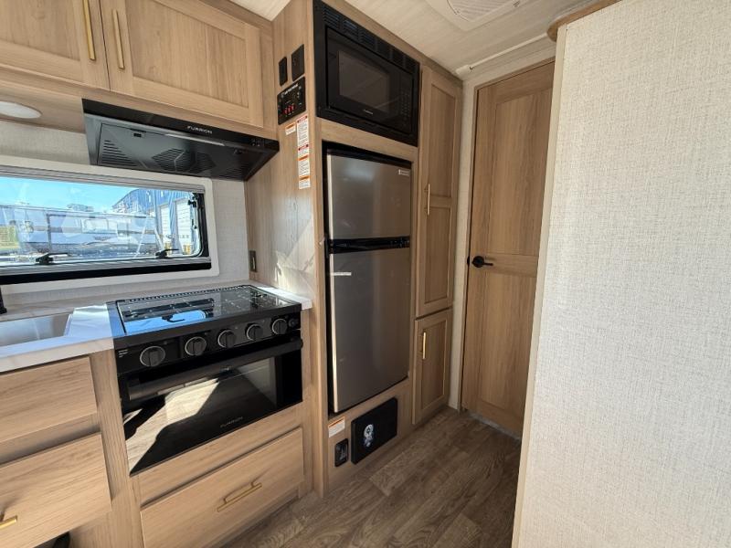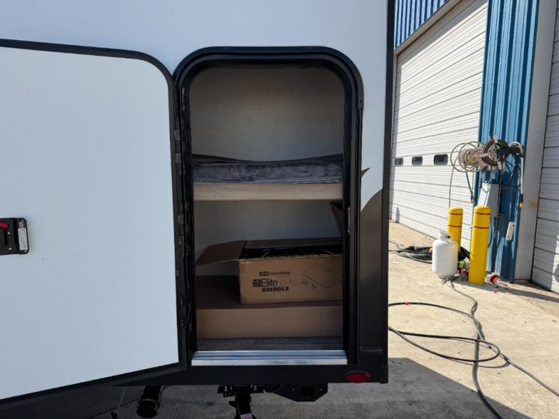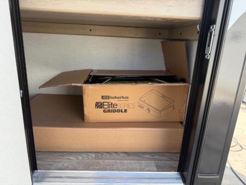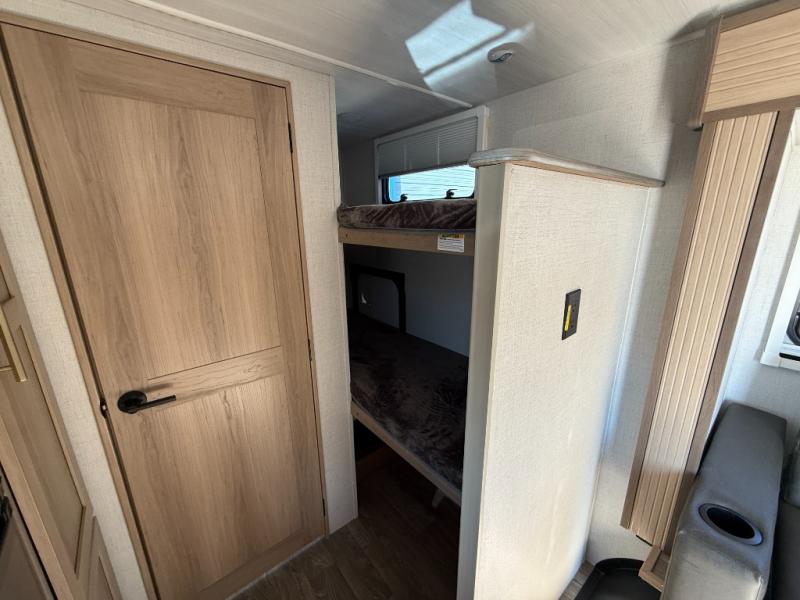 Camping will be an adventure for five or six campers featuring a single slide for added space. A full bed up front features drawers beneath for your clothing, plus flip-up storage and USB ports. With the 32" HDTV on the wall at the foot of the bed you can easily catch a movie before you fall asleep or it can easily be viewed from the comfort of the theater dinette with pivoting tables within the slide out. Two more campers will enjoy the set of 26" x 74" bunk beds along the roadside back corner with flip-up bottom bunk for easy storage beneath. The opposite rear corner houses the full bath with a shower, toilet, and flip-down bath sink. Cooking will be super convenient with a three-burner cooktop, a sink for cleaning up, and there is also a microwave located above the refrigerator for your perishables. On the outside, a 14' awning provides added living space where you can set up your camp chairs and be protected from the sun and rain, plus there is an exterior Suburban griddle to cook burgers outdoors!