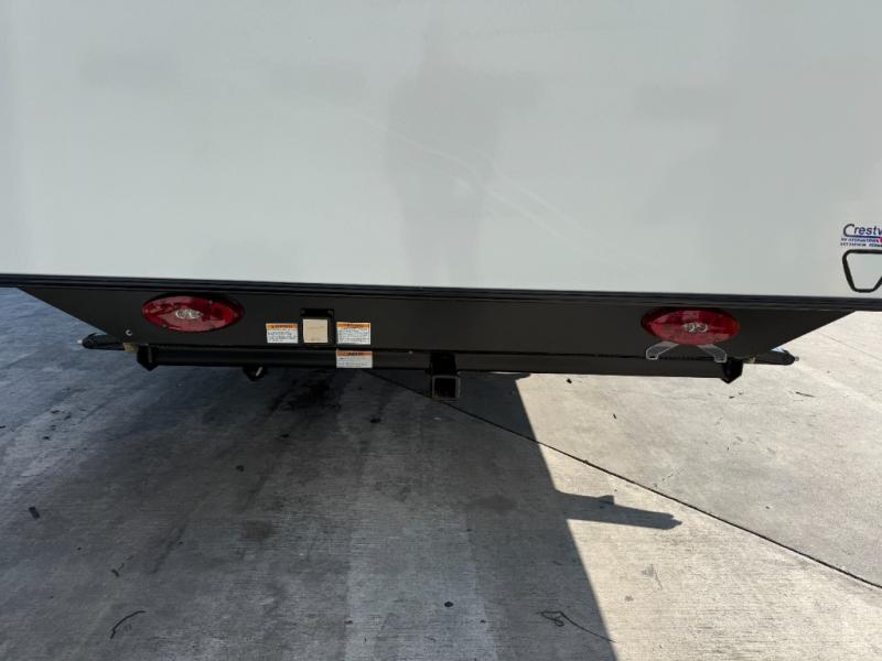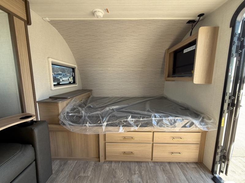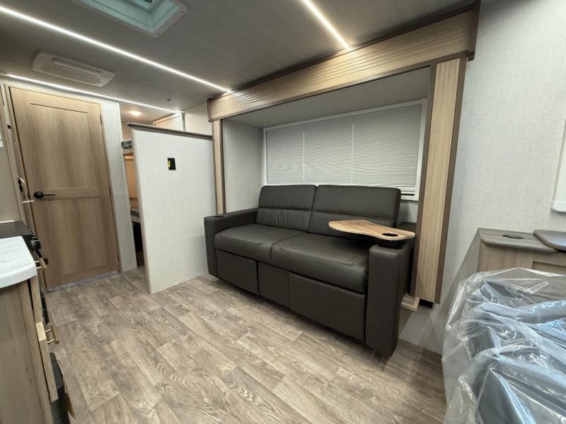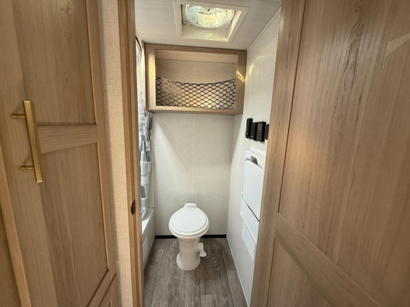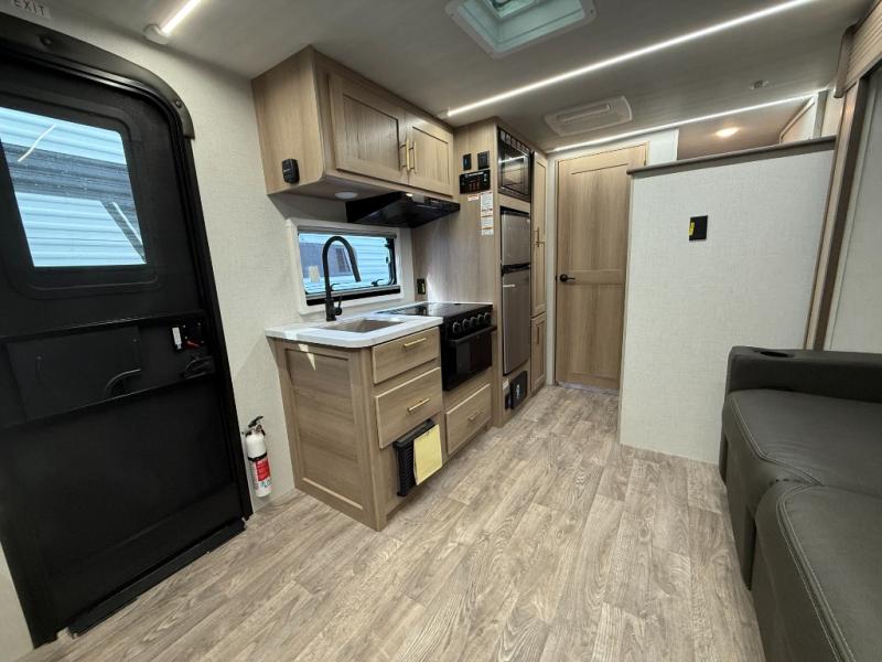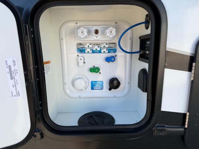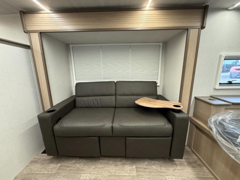 Camping will be an adventure for five or six campers featuring a single slide for added space. A full bed up front features drawers beneath for your clothing, plus flip-up storage and USB ports. With the 32" HDTV on the wall at the foot of the bed you can easily catch a movie before you fall asleep or it can easily be viewed from the comfort of the theater dinette with pivoting tables within the slide out. Two more campers will enjoy the set of 26" x 74" bunk beds along the roadside back corner with flip-up bottom bunk for easy storage beneath. The opposite rear corner houses the full bath with a shower, toilet, and flip-down bath sink. Cooking will be super convenient with a three-burner cooktop, a sink for cleaning up, and there is also a microwave located above the refrigerator for your perishables. On the outside, a 14' awning provides added living space where you can set up your camp chairs and be protected from the sun and rain, plus there is an exterior Suburban griddle to cook burgers outdoors!