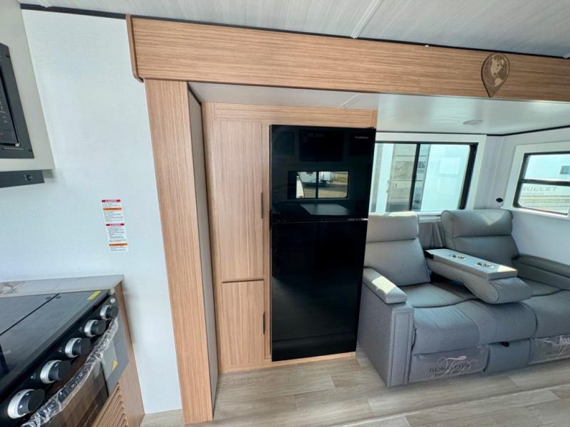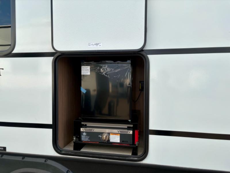 Are you looking to upgrade from a tent to a travel trailer? This dual axle unit may be the one! Since there are dual entry doors, you can enter in through the front master bedroom with a queen bed or the rear kitchen with ample counter space. Your crew can relax on the tri-fold sofa, play a game at the do-more dinette, or visit outdoors under the 19' awning. There is also an outdoor kitchen here for a sunrise breakfast! The walk-thru bath is easily accessible for everyone to use, and you'll find plenty of storage space throughout, including a large pantry, overhead compartments, and dual bedroom wardrobes and nightstands.
