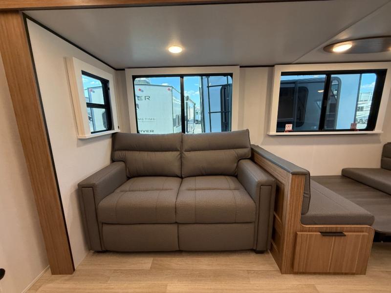 Pack your bags and hitch up this travel trailer! The dual entry doors make it easy to enter and exit especially from the rear private bedroom which has a king bed slide plus a dresser and a wardrobe. The bedroom also has an entrance into the dual entry bathroom where you will find a spacious shower to freshen up in each morning. After a fun day outdoors, you can relax on the tri-fold sofa across from the entertainment center with a fireplace or you can play a game or two at the Do-More dinette table. You can also choose the optional luxury cinema theater seating in place of the sofa and the optional free-standing dinette in place of the standard dinette depending on your needs. The chef will enjoy all of the space provided with the front kitchen with generous counter space!