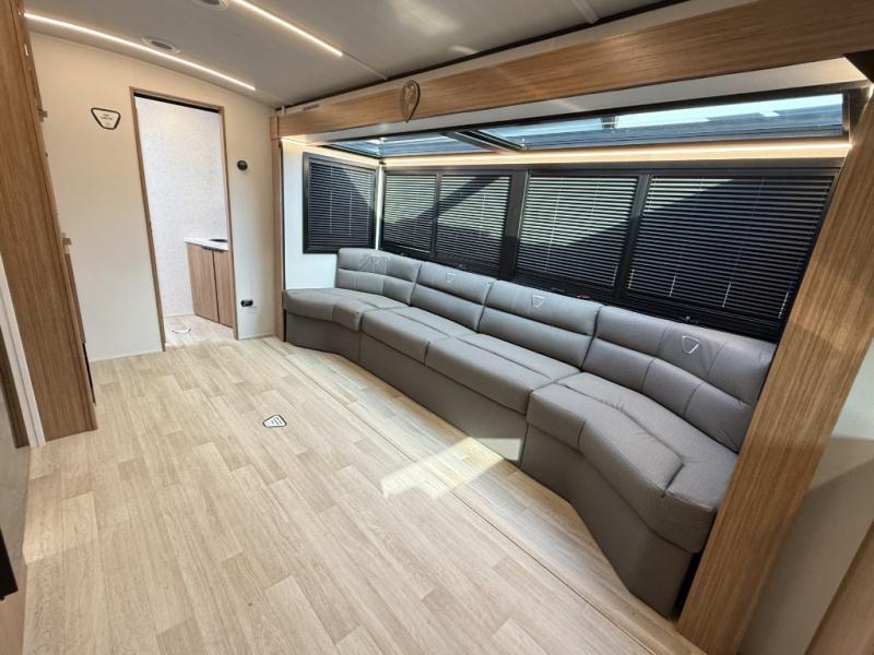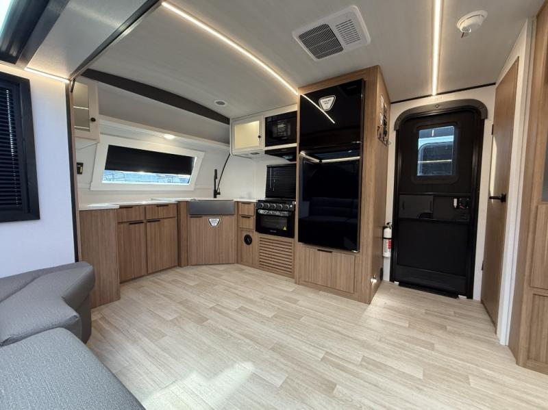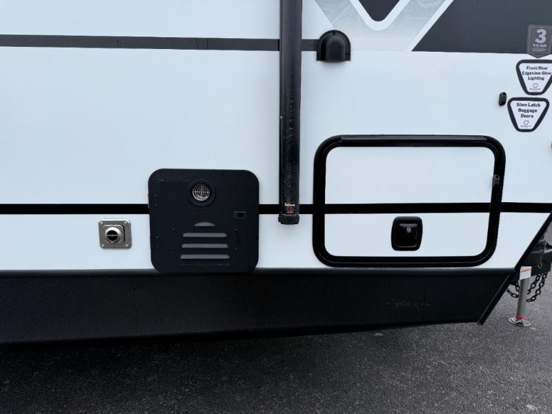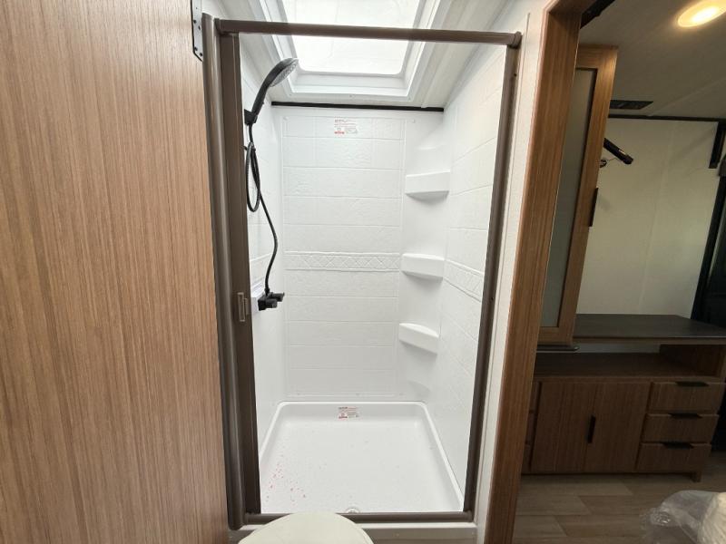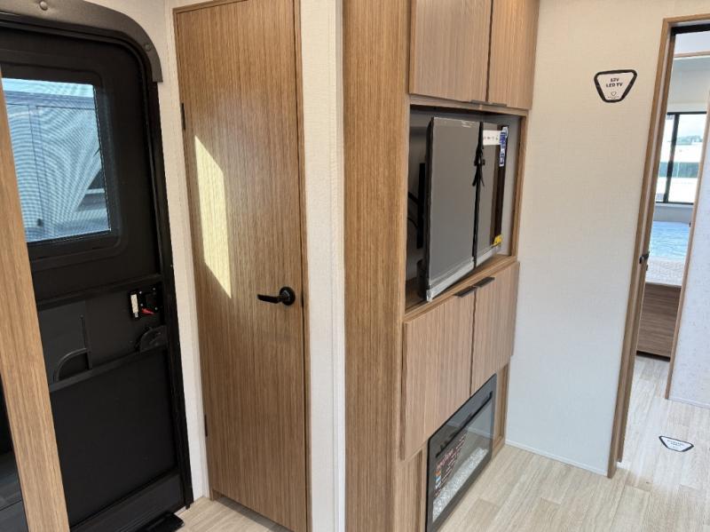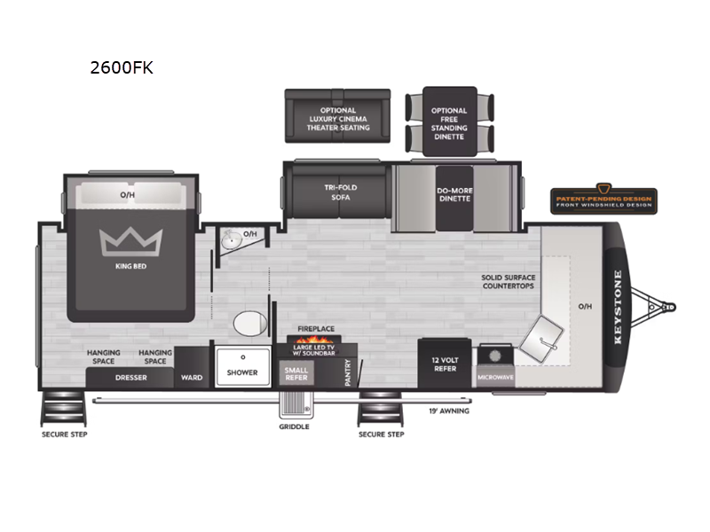 Pack your bags and hitch up this travel trailer! The dual entry doors make it easy to enter and exit especially from the rear private bedroom which has a king bed slide plus a dresser and a wardrobe. The bedroom also has an entrance into the dual entry bathroom where you will find a spacious shower to freshen up in each morning. After a fun day outdoors, you can relax on the tri-fold sofa across from the entertainment center with a fireplace or you can play a game or two at the Do-More dinette table. You can also choose the optional luxury cinema theater seating in place of the sofa and the optional free-standing dinette in place of the standard dinette depending on your needs. The chef will enjoy all of the space provided with the front kitchen with generous counter space!