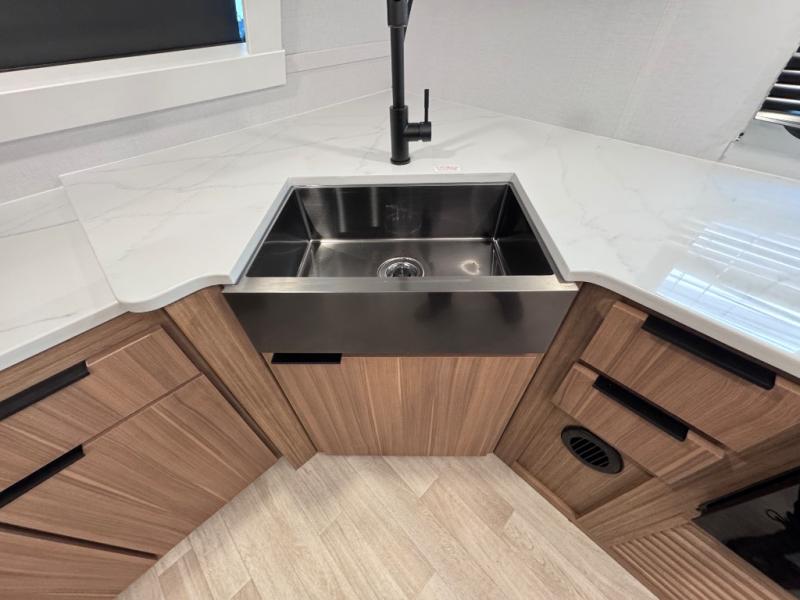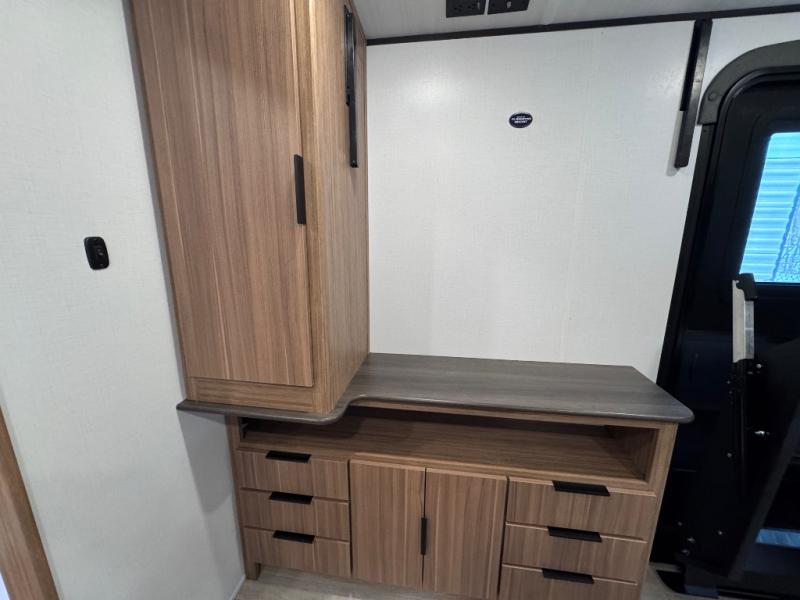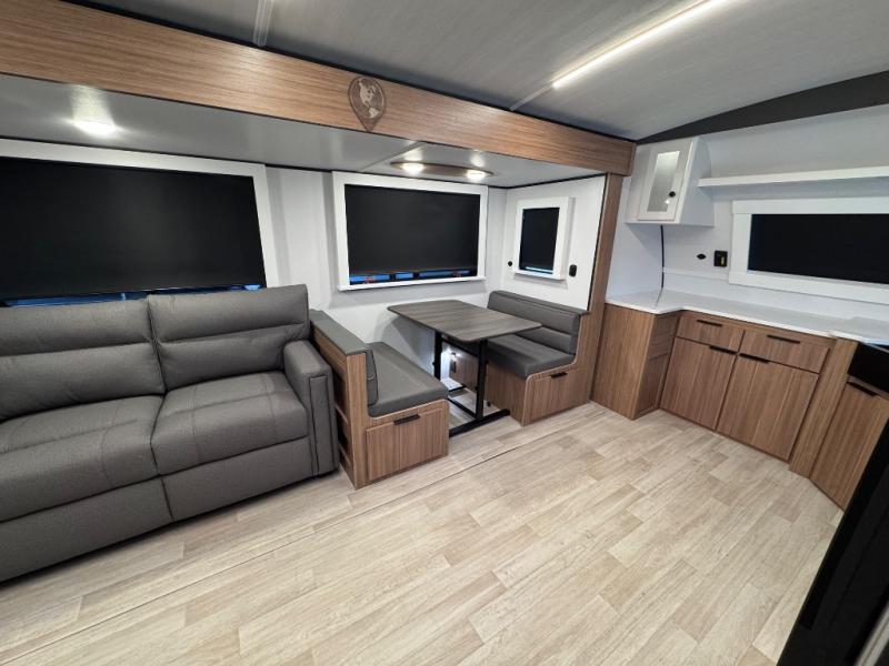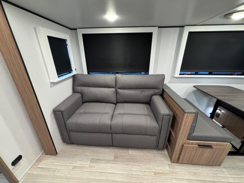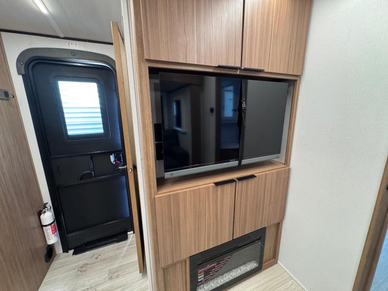 Pack your bags and hitch up this travel trailer! The dual entry doors make it easy to enter and exit especially from the rear private bedroom which has a king bed slide plus a dresser and a wardrobe. The bedroom also has an entrance into the dual entry bathroom where you will find a spacious shower to freshen up in each morning. After a fun day outdoors, you can relax on the tri-fold sofa across from the entertainment center with a fireplace or you can play a game or two at the Do-More dinette table. You can also choose the optional luxury cinema theater seating in place of the sofa and the optional free-standing dinette in place of the standard dinette depending on your needs. The chef will enjoy all of the space provided with the front kitchen with generous counter space!
