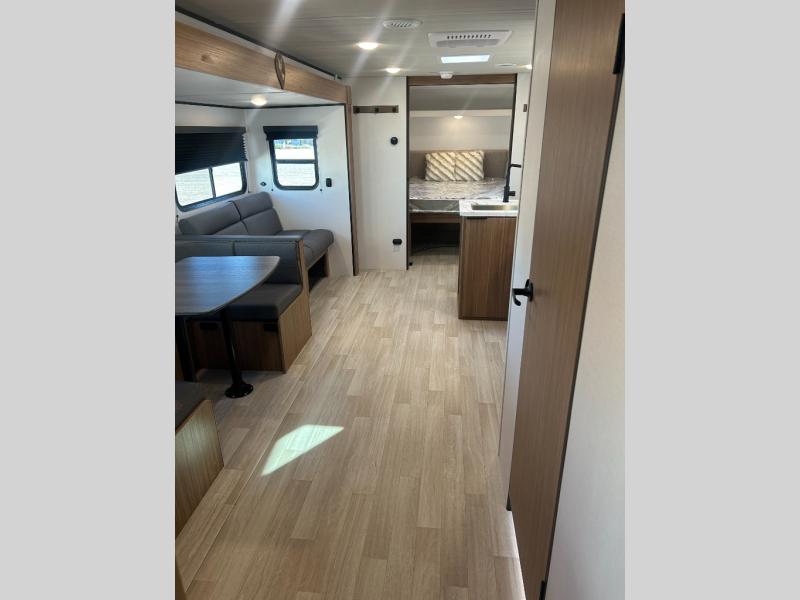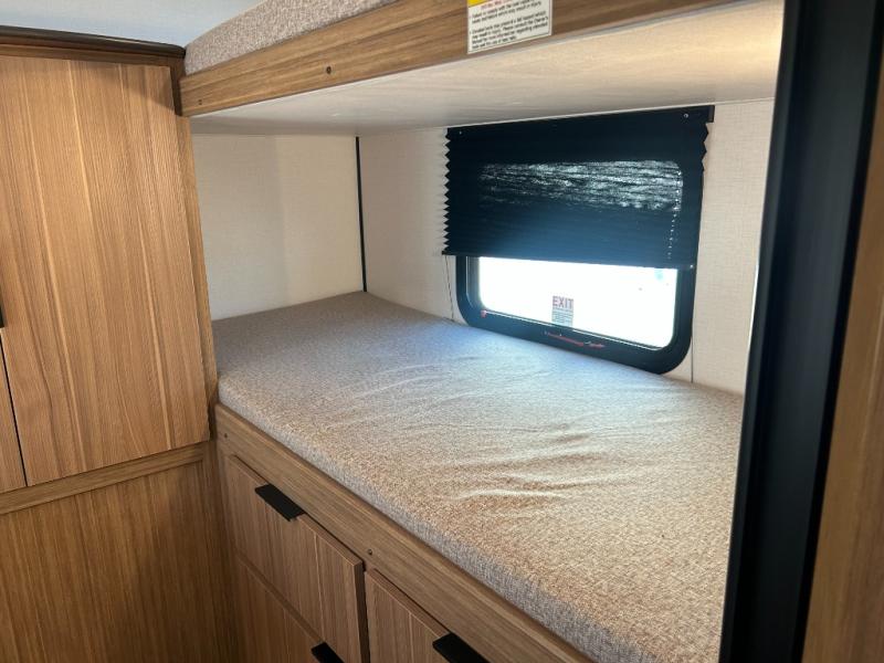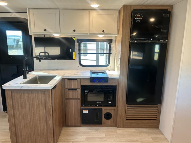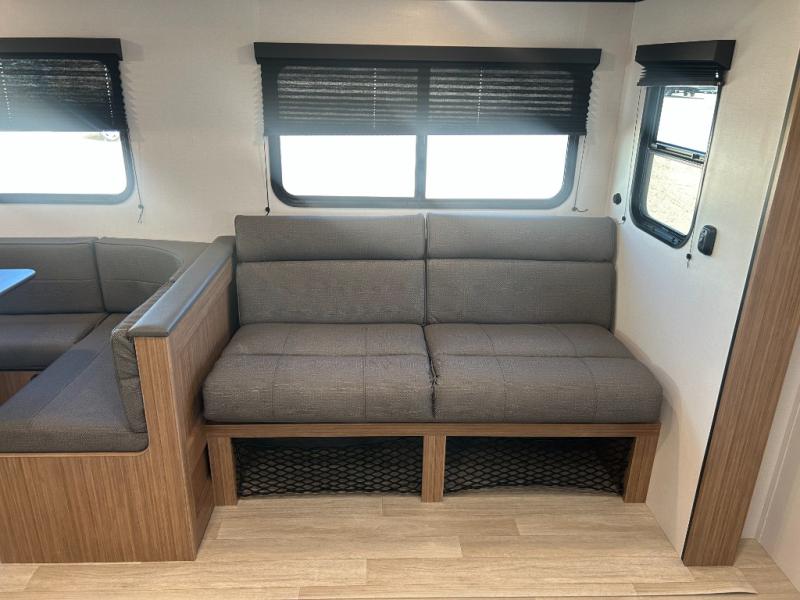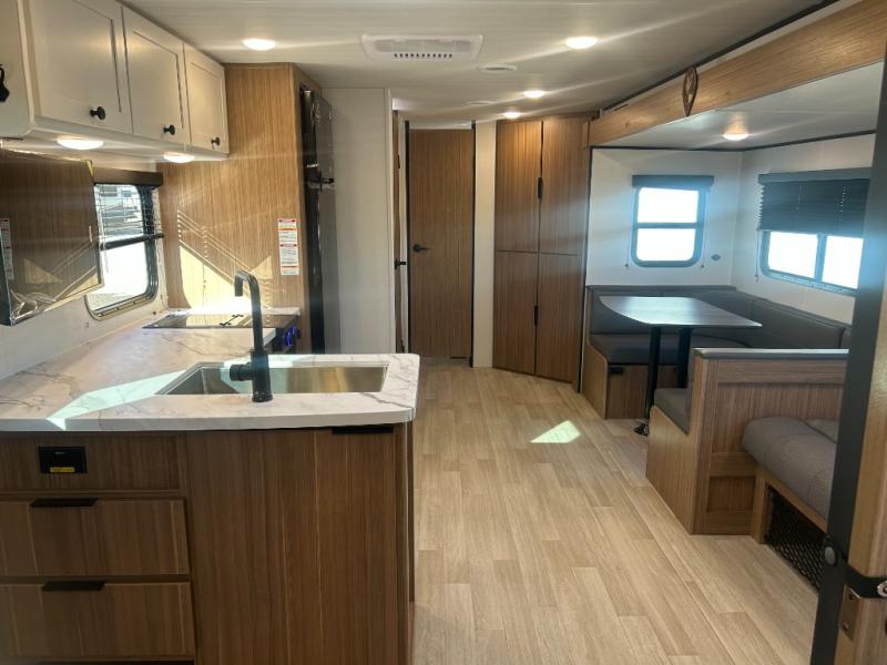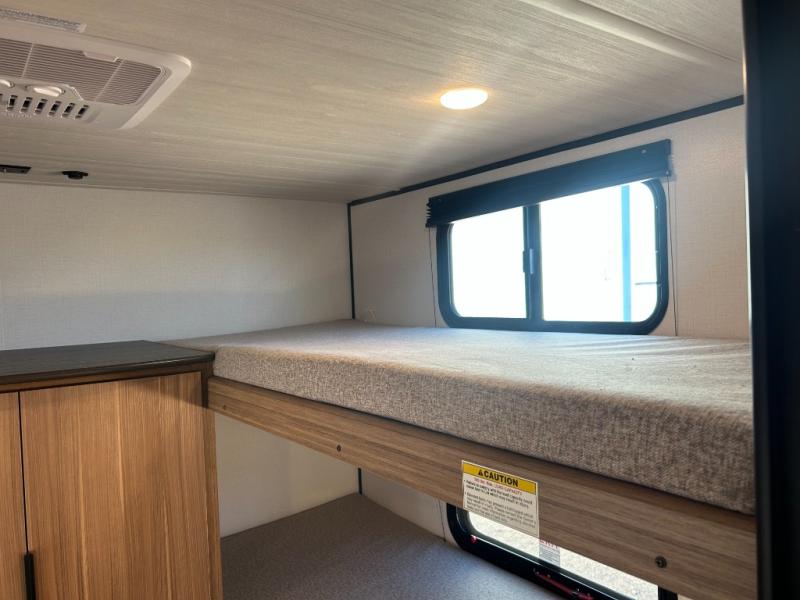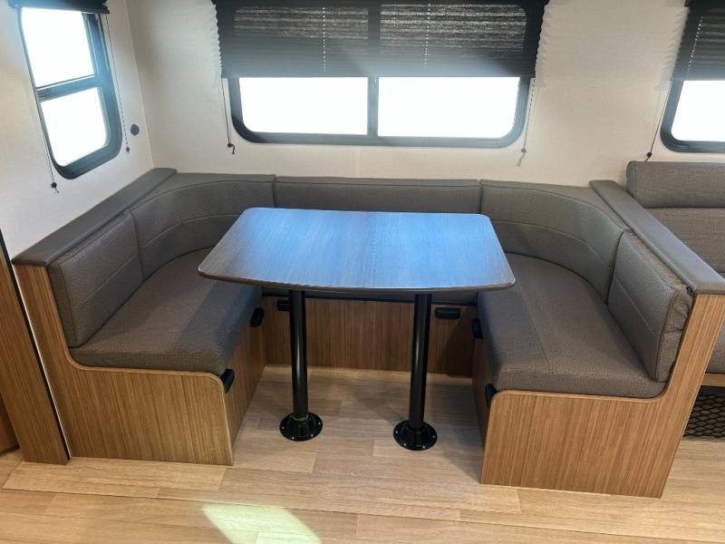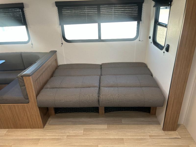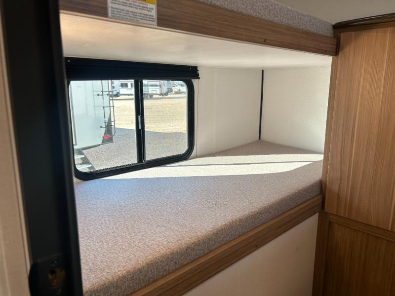 This spacious travel trailer is perfect for a large group or family since it can sleep eight to ten people each night. The bunkhouse will be a favorite spot for the littles ones to enjoy, especially with four bunk beds and a wardrobe with storage. You'll have a queen bed up front in the private bedroom, and if you have any other guests, they can sleep on the jack knife sofa and booth dinette! The two burner range and microwave oven allow you to make meals each day, and the large double door 12V refrigerator will keep leftovers fresh.