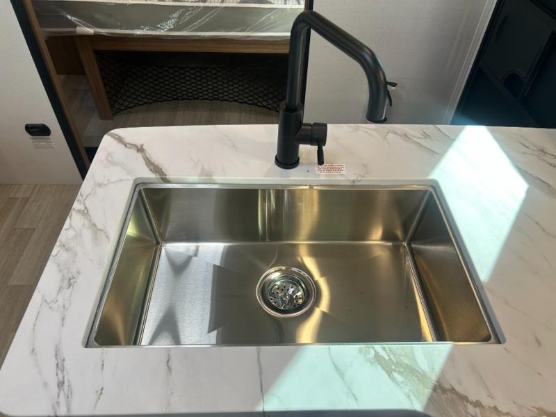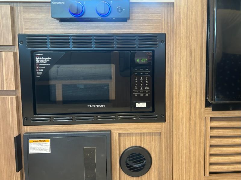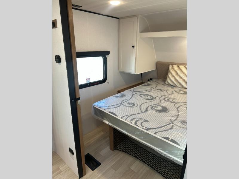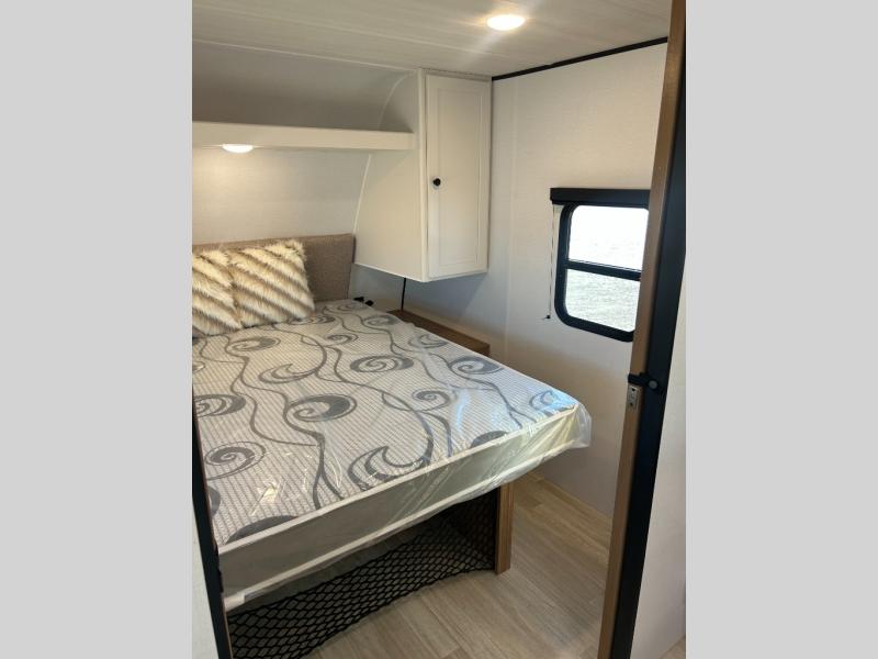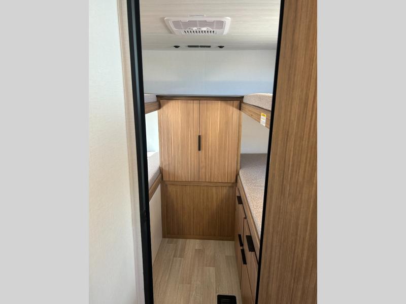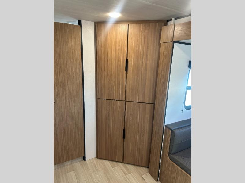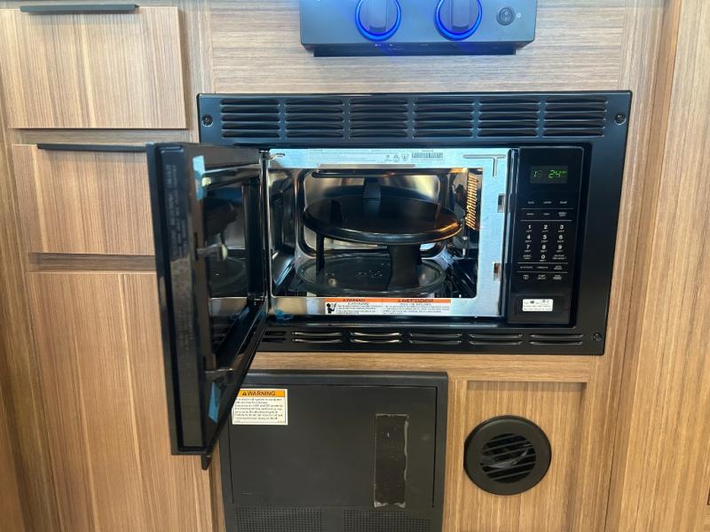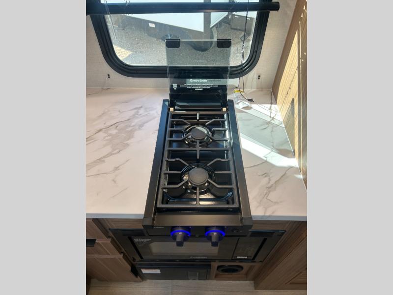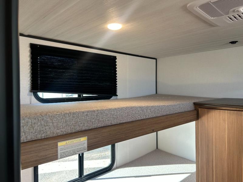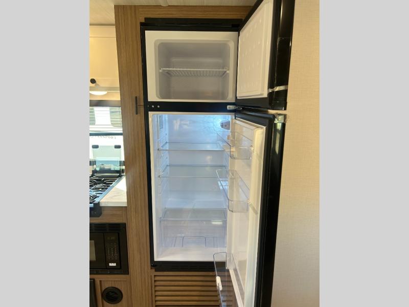 This spacious travel trailer is perfect for a large group or family since it can sleep eight to ten people each night. The bunkhouse will be a favorite spot for the littles ones to enjoy, especially with four bunk beds and a wardrobe with storage. You'll have a queen bed up front in the private bedroom, and if you have any other guests, they can sleep on the jack knife sofa and booth dinette! The two burner range and microwave oven allow you to make meals each day, and the large double door 12V refrigerator will keep leftovers fresh.