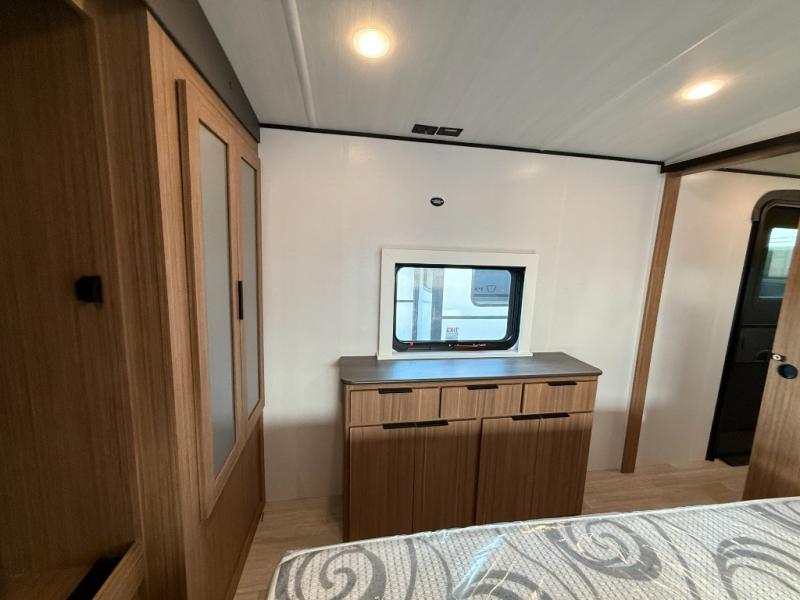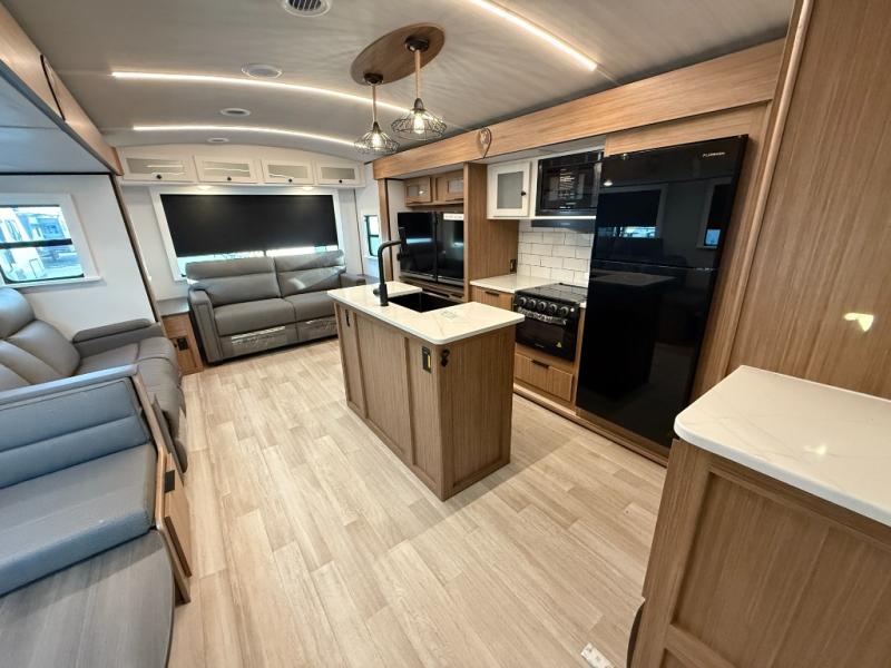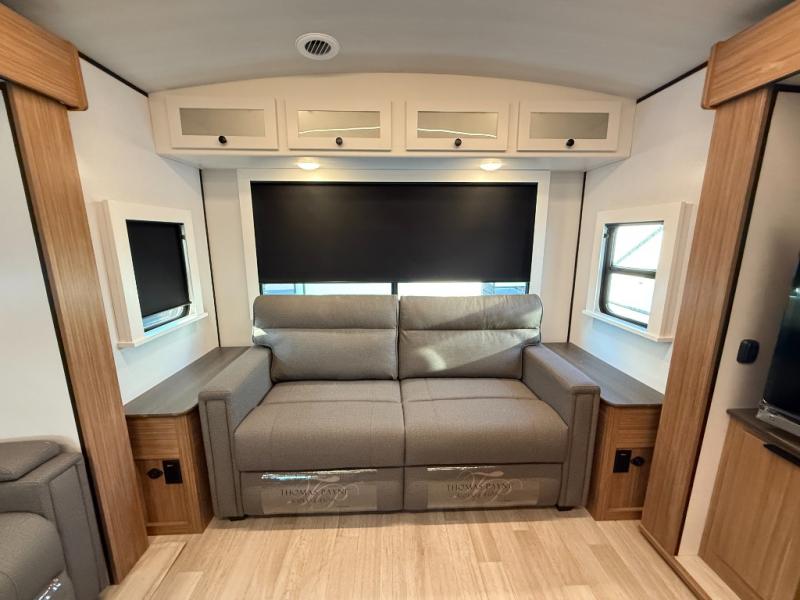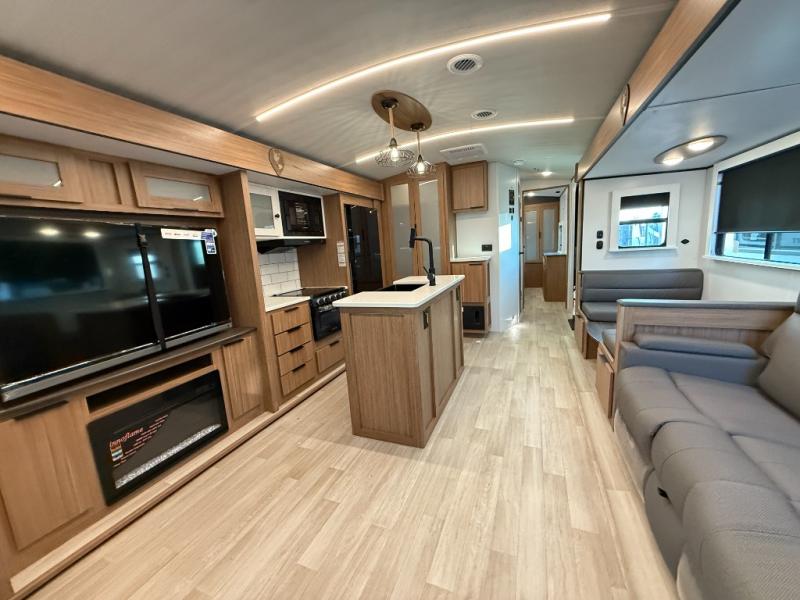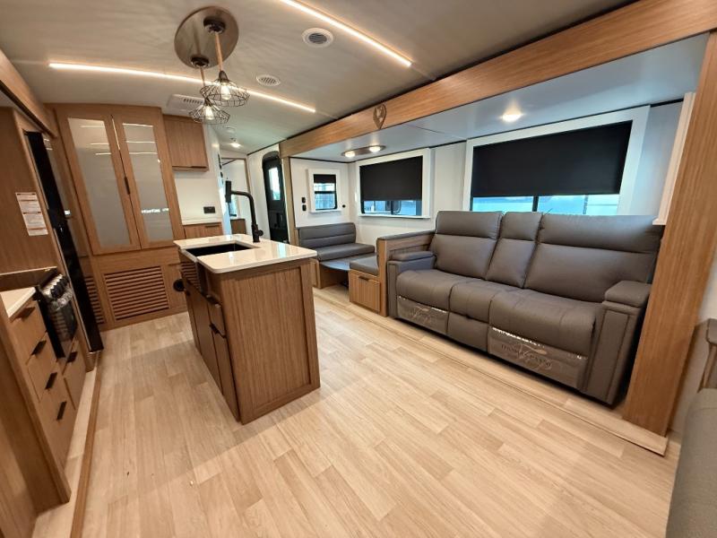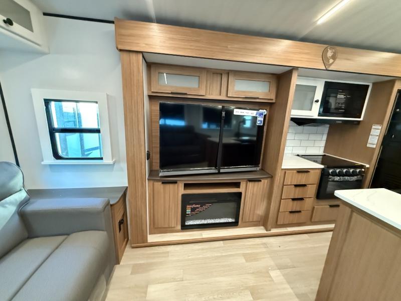 You will feel right at home in this travel trailer! The front private bedroom has a king bed slide to lay your head on at night, a front closet with washer and dryer prep, plus a dresser with a flip-up top and TV prep. Just outside the bedroom is the full bathroom with a shower with a skylight for added natural lighting as you get ready. Now that you're ready for the day, you can head to the fully equipped kitchen complete with a kitchen island to whip up some delicious cinnamon rolls that can be enjoyed at the Do-More Dinette table. The rear living area not only has luxury cinema recliners, but also a tri-fold sofa by an entertainment center with a fireplace!