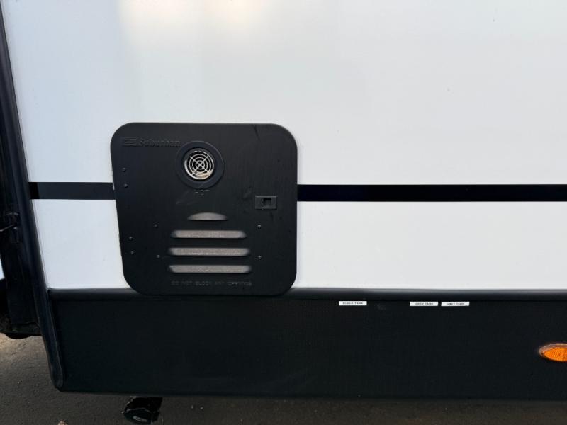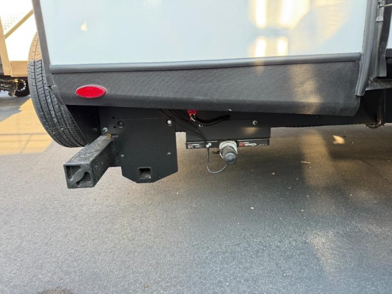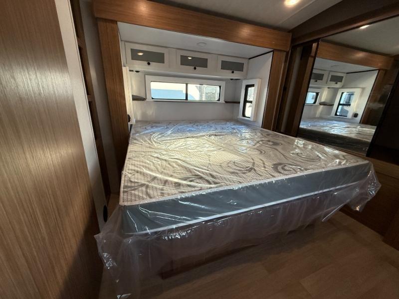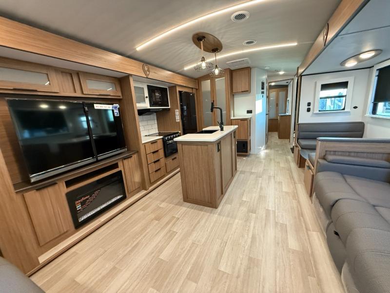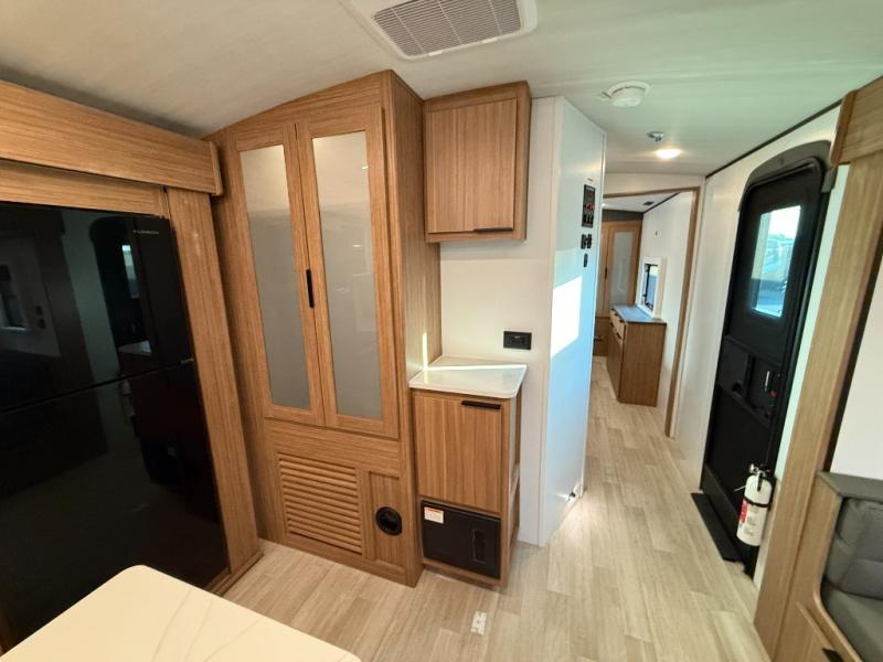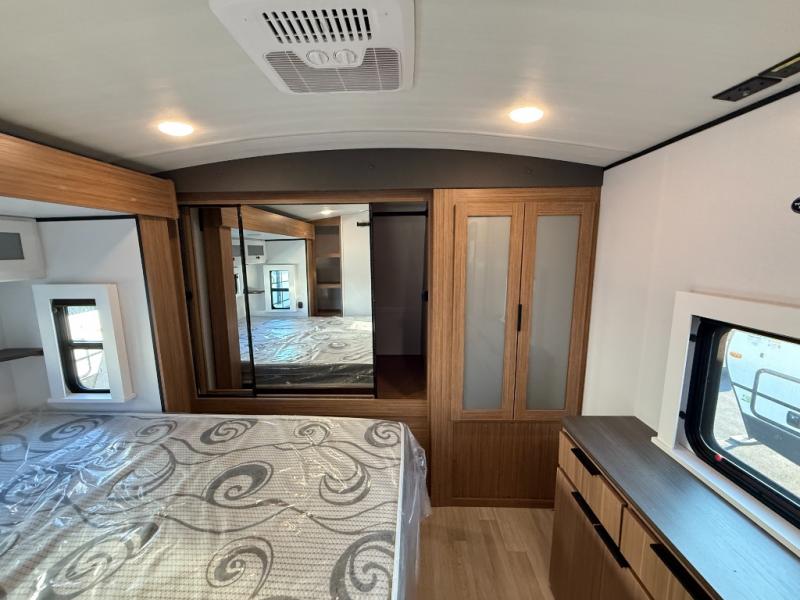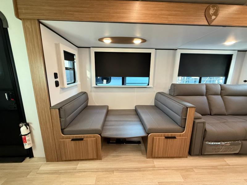 You will feel right at home in this travel trailer! The front private bedroom has a king bed slide to lay your head on at night, a front closet with washer and dryer prep, plus a dresser with a flip-up top and TV prep. Just outside the bedroom is the full bathroom with a shower with a skylight for added natural lighting as you get ready. Now that you're ready for the day, you can head to the fully equipped kitchen complete with a kitchen island to whip up some delicious cinnamon rolls that can be enjoyed at the Do-More Dinette table. The rear living area not only has luxury cinema recliners, but also a tri-fold sofa by an entertainment center with a fireplace!