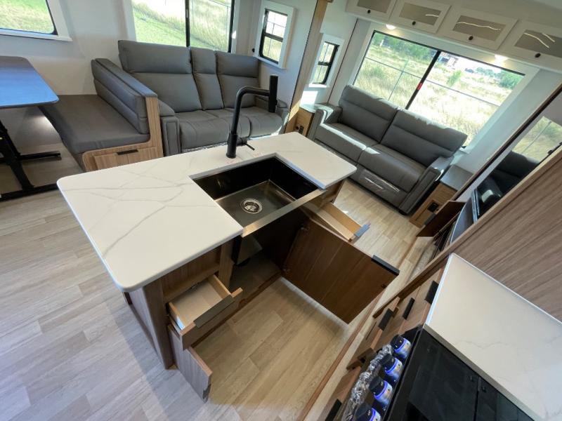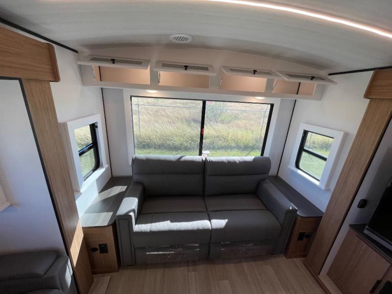 You will feel right at home in this travel trailer! The front private bedroom has a king bed slide to lay your head on at night, a front closet with washer and dryer prep, plus a dresser with a flip-up top and TV prep. Just outside the bedroom is the full bathroom with a shower with a skylight for added natural lighting as you get ready. Now that you're ready for the day, you can head to the fully equipped kitchen complete with a kitchen island to whip up some delicious cinnamon rolls that can be enjoyed at the Do-More Dinette table. The rear living area not only has luxury cinema recliners, but also a tri-fold sofa by an entertainment center with a fireplace!
