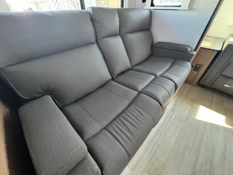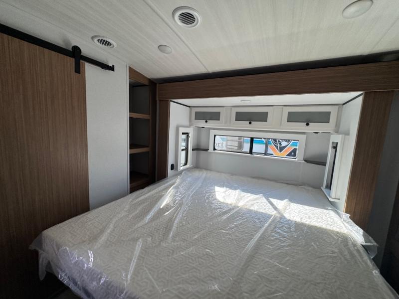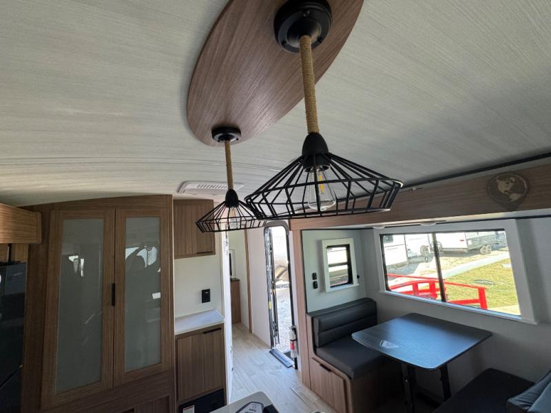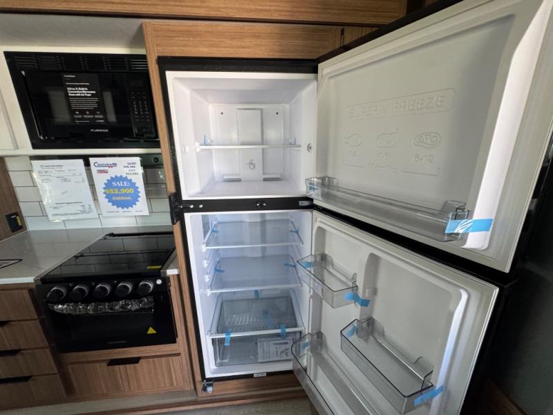 You will feel right at home in this travel trailer! The front private bedroom has a king bed slide to lay your head on at night, a front closet with washer and dryer prep, plus a dresser with a flip-up top and TV prep. Just outside the bedroom is the full bathroom with a shower with a skylight for added natural lighting as you get ready. Now that you're ready for the day, you can head to the fully equipped kitchen complete with a kitchen island to whip up some delicious cinnamon rolls that can be enjoyed at the Do-More Dinette table. The rear living area not only has luxury cinema recliners, but also a tri-fold sofa by an entertainment center with a fireplace!