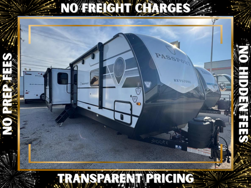 Each one of these Keystone RV Passport travel trailers offer grand style and multi-functional features! They have best-in-class storage for big things like paddle boards and small things like sleeping bags. There's no need for cordless drills and bending over to put the jacks down, simply push a button and the power stabilizer jacks do the rest. The one piece polypropylene underbelly and extended season camping package helps protect your unit's vitals in different weather conditions. Exclusive to Keystone is the Tru-fit slide construction and the Hyper Deck flooring which is more resilient, stronger and lighter than the traditional laminated wood construction, plus it resists water and water damage. Inside, you'll find residential durable Beauflor vinyl flooring, deluxe night shades, bedside outlets/USB ports, and a bath skylight for more natural light and additional head room.