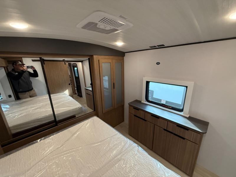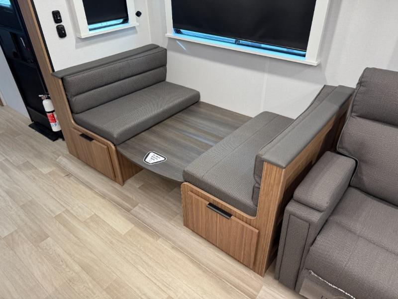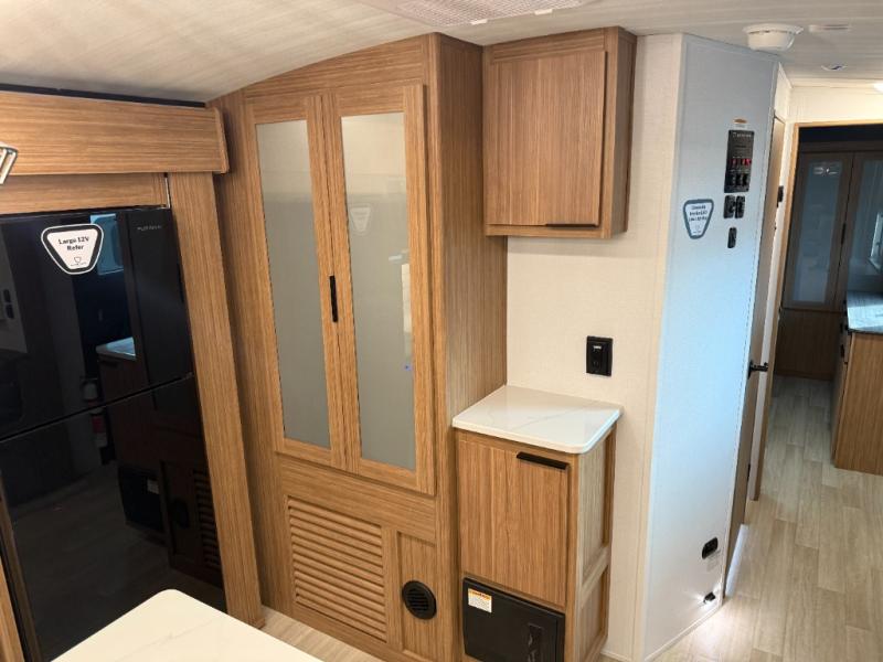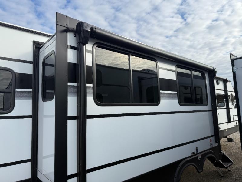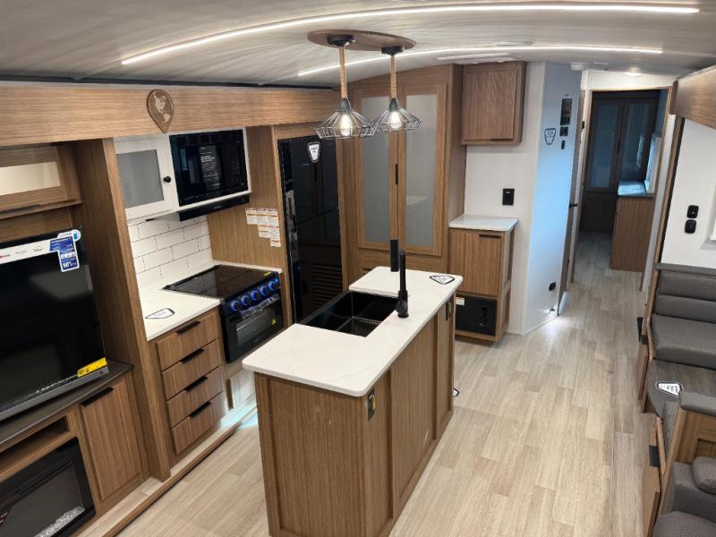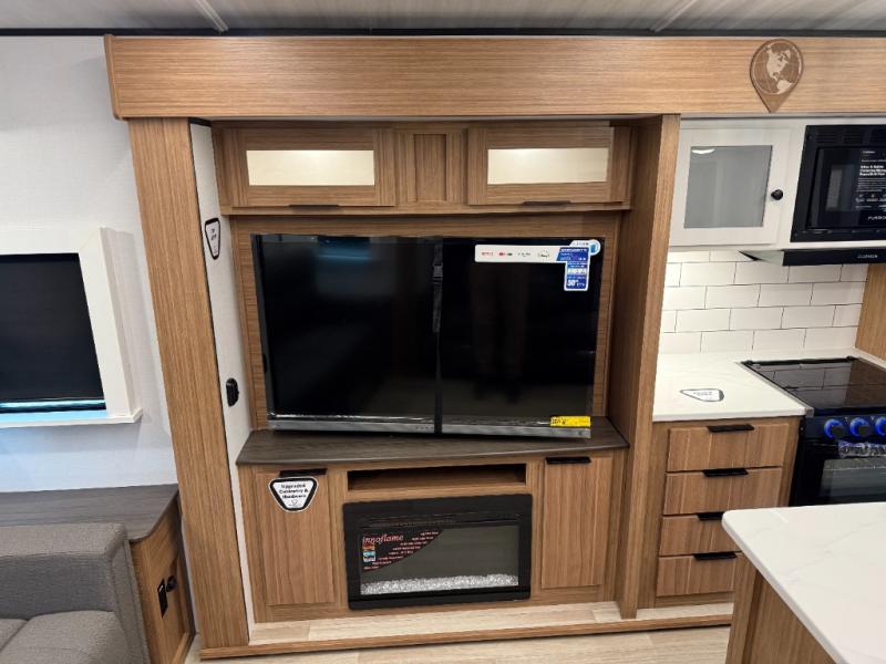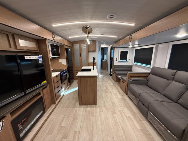 You will feel right at home in this travel trailer! The front private bedroom has a king bed slide to lay your head on at night, a front closet with washer and dryer prep, plus a dresser with a flip-up top and TV prep. Just outside the bedroom is the full bathroom with a shower with a skylight for added natural lighting as you get ready. Now that you're ready for the day, you can head to the fully equipped kitchen complete with a kitchen island to whip up some delicious cinnamon rolls that can be enjoyed at the Do-More Dinette table. The rear living area not only has luxury cinema recliners, but also a tri-fold sofa by an entertainment center with a fireplace!