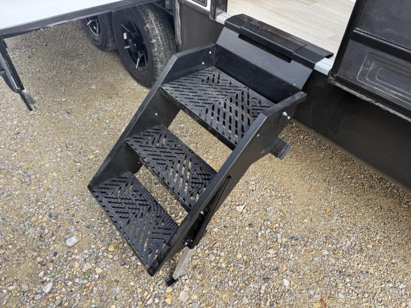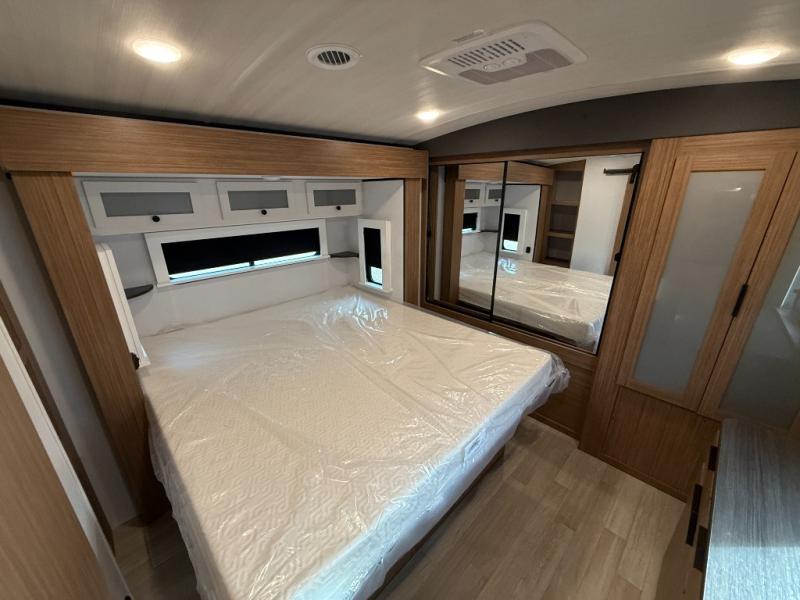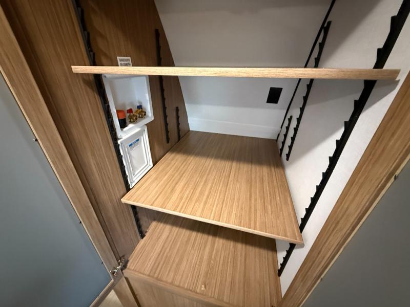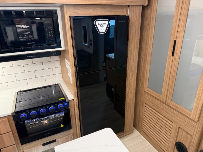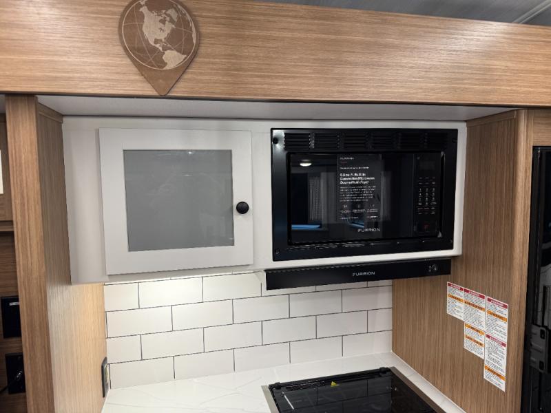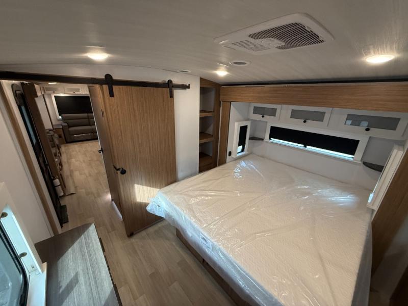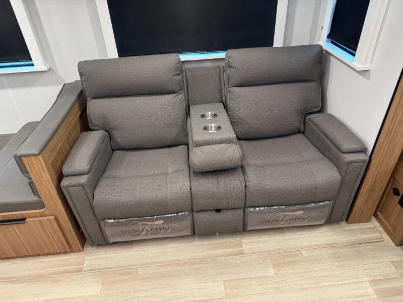You will feel right at home in this travel trailer! The front private bedroom has a king bed slide to lay your head on at night, a front closet with washer and dryer prep, plus a dresser with a flip-up top and TV prep. Just outside the bedroom is the full bathroom with a shower with a skylight for added natural lighting as you get ready. Now that you're ready for the day, you can head to the fully equipped kitchen complete with a kitchen island to whip up some delicious cinnamon rolls that can be enjoyed at the Do-More Dinette table. The rear living area not only has luxury cinema recliners, but also a tri-fold sofa by an entertainment center with a fireplace!