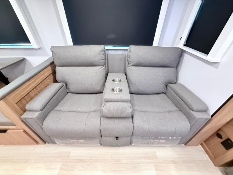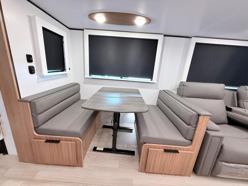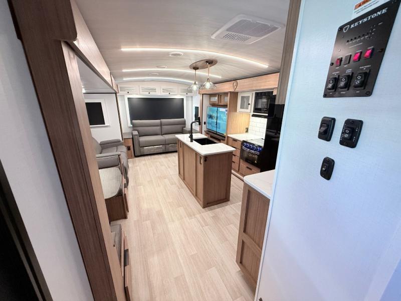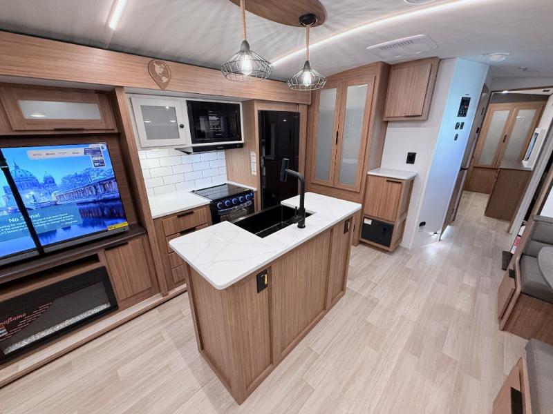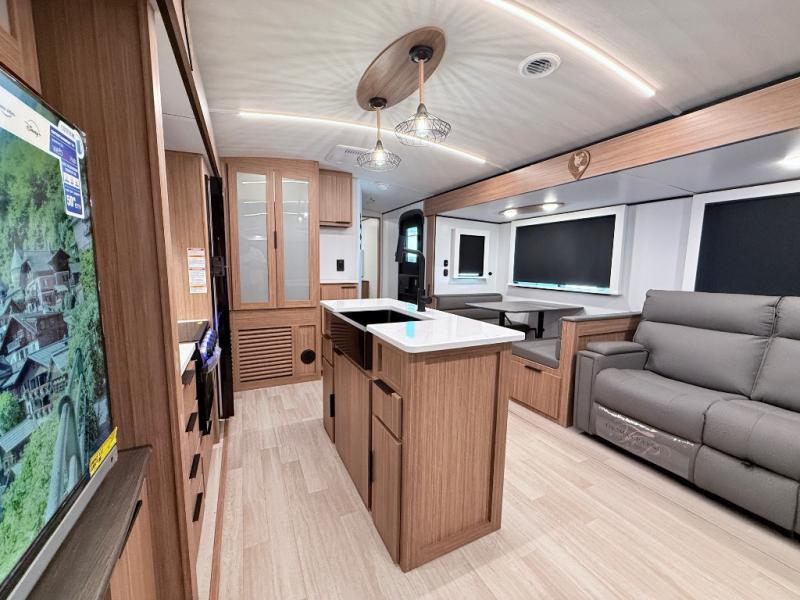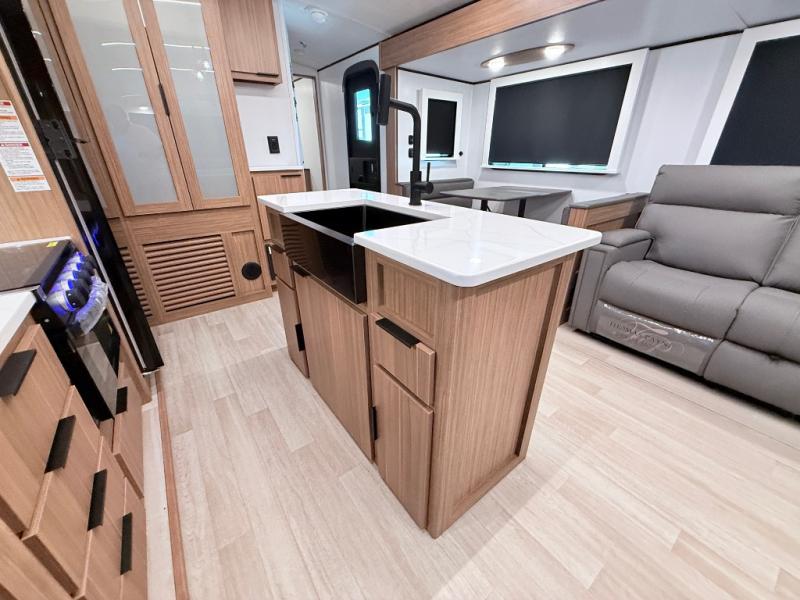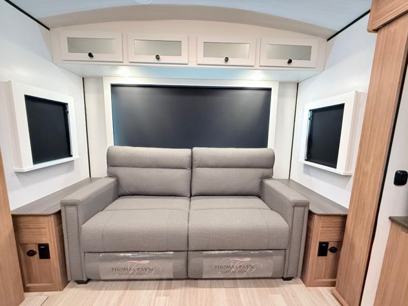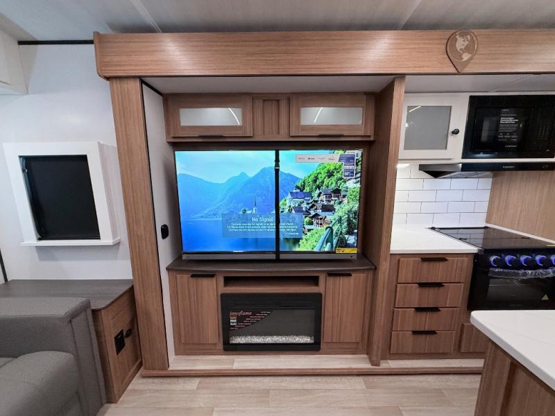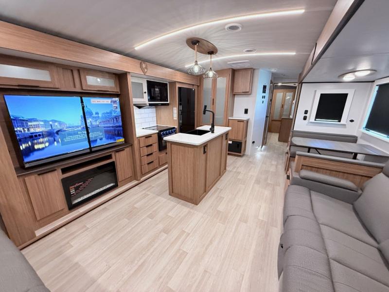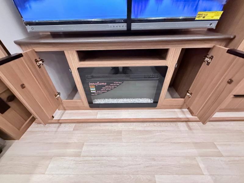 You will feel right at home in this travel trailer! The front private bedroom has a king bed slide to lay your head on at night, a front closet with washer and dryer prep, plus a dresser with a flip-up top and TV prep. Just outside the bedroom is the full bathroom with a shower with a skylight for added natural lighting as you get ready. Now that you're ready for the day, you can head to the fully equipped kitchen complete with a kitchen island to whip up some delicious cinnamon rolls that can be enjoyed at the Do-More Dinette table. The rear living area not only has luxury cinema recliners, but also a tri-fold sofa by an entertainment center with a fireplace!