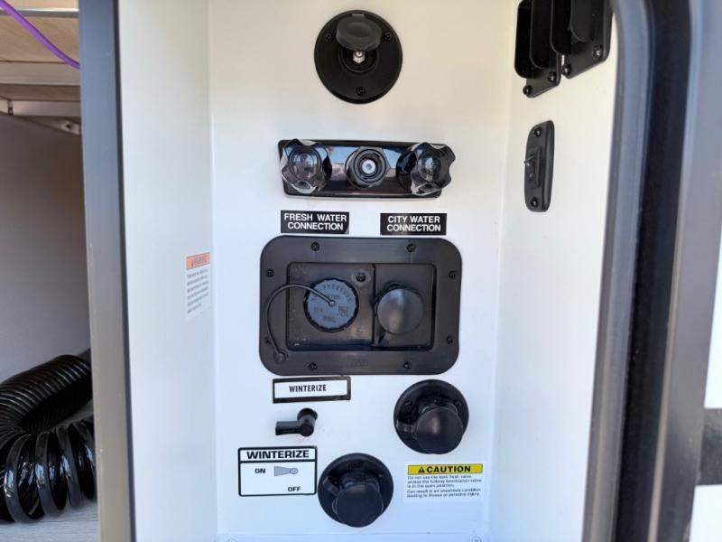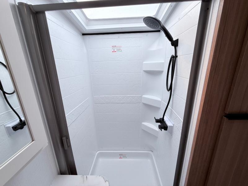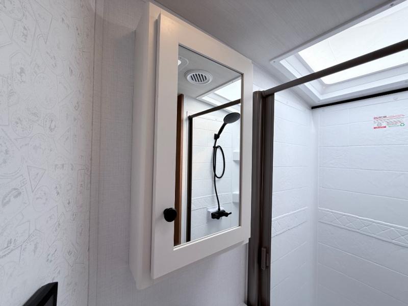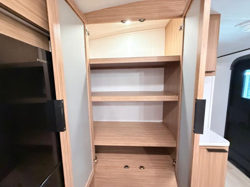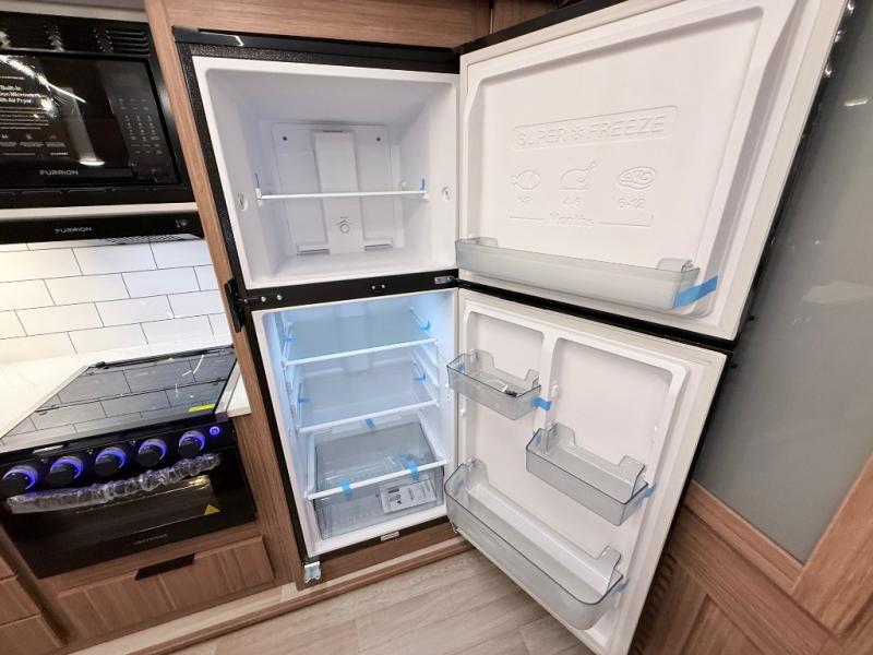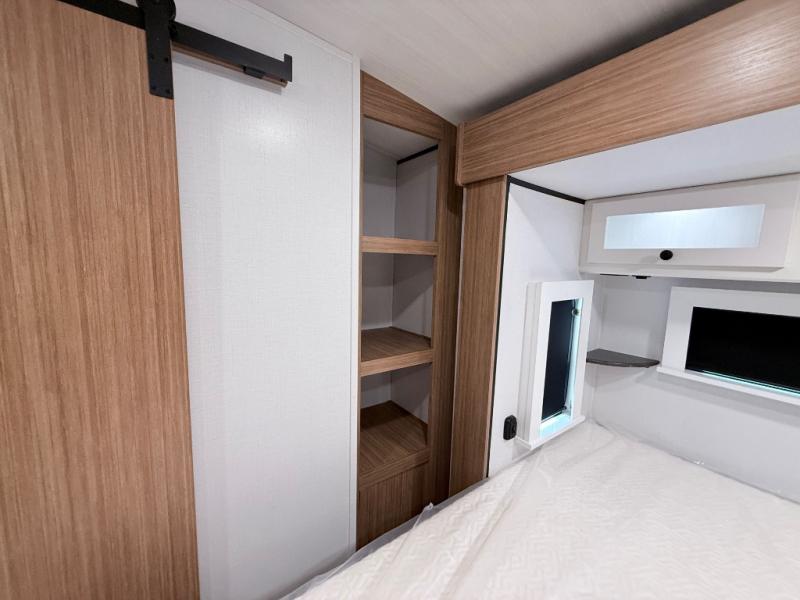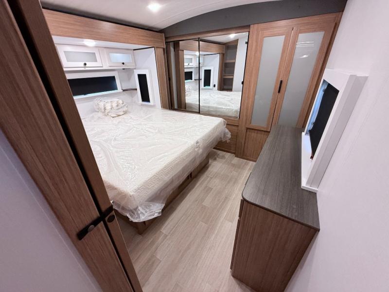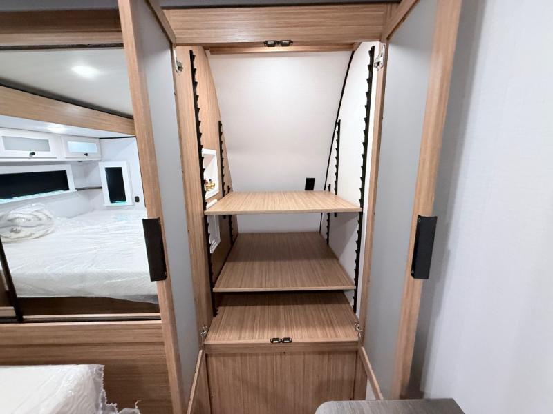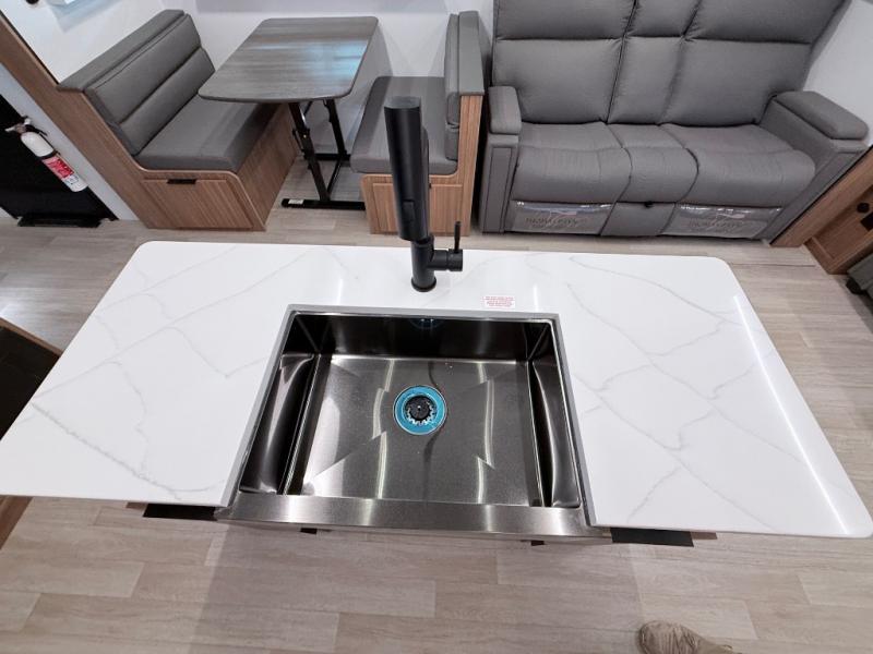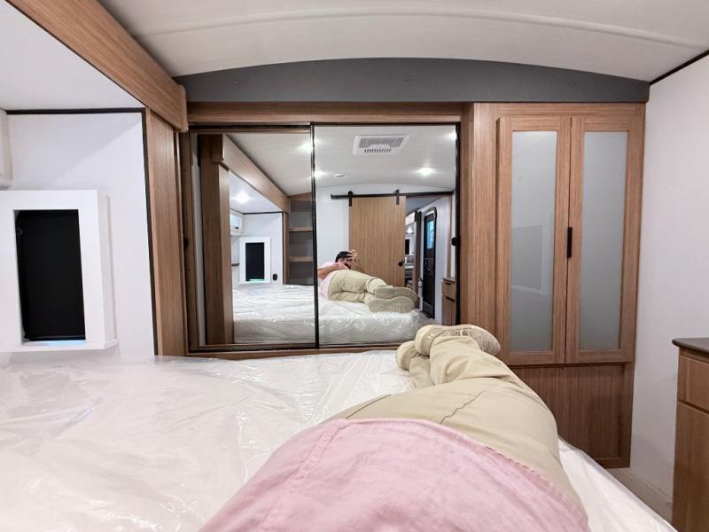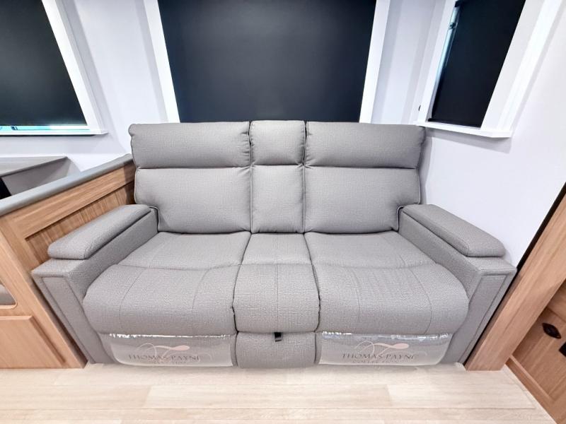 You will feel right at home in this travel trailer! The front private bedroom has a king bed slide to lay your head on at night, a front closet with washer and dryer prep, plus a dresser with a flip-up top and TV prep. Just outside the bedroom is the full bathroom with a shower with a skylight for added natural lighting as you get ready. Now that you're ready for the day, you can head to the fully equipped kitchen complete with a kitchen island to whip up some delicious cinnamon rolls that can be enjoyed at the Do-More Dinette table. The rear living area not only has luxury cinema recliners, but also a tri-fold sofa by an entertainment center with a fireplace!