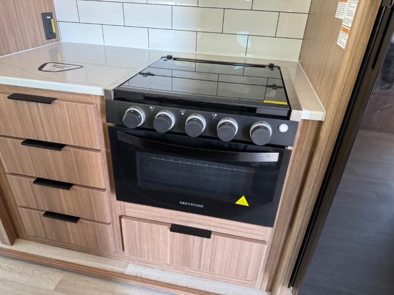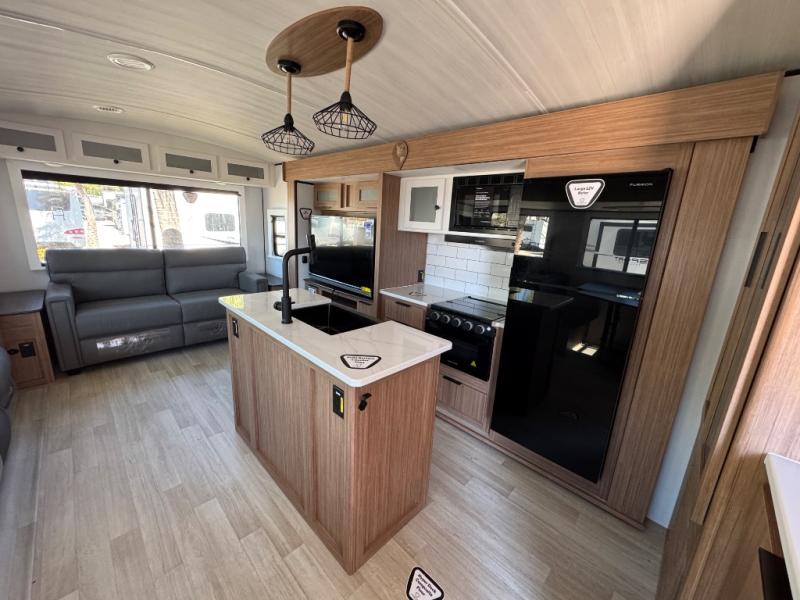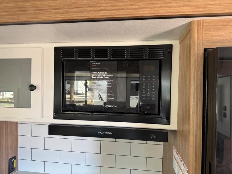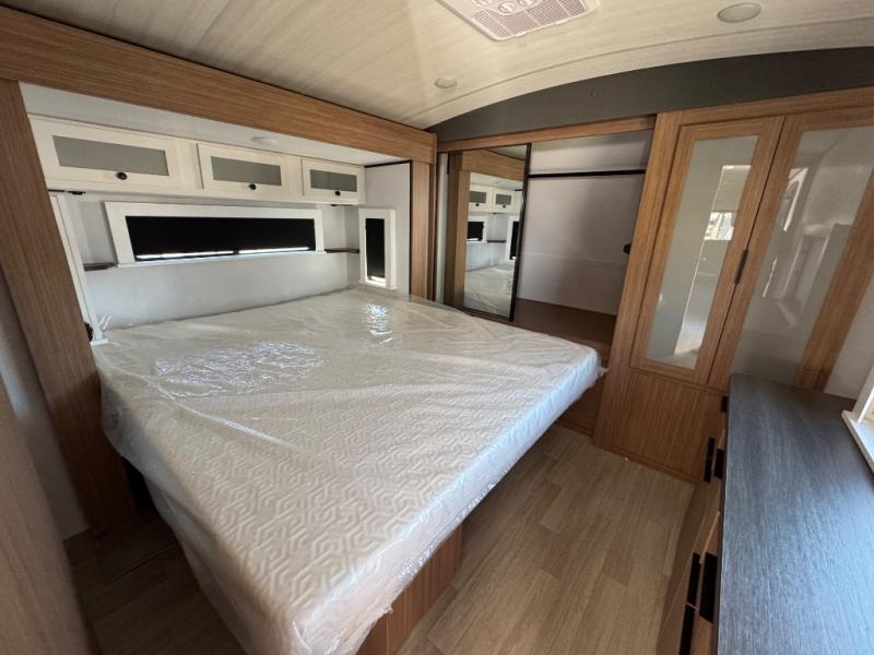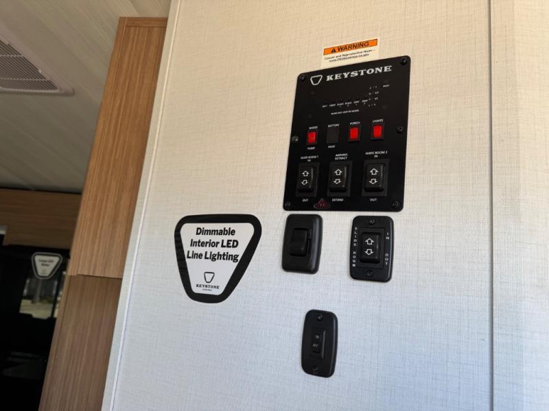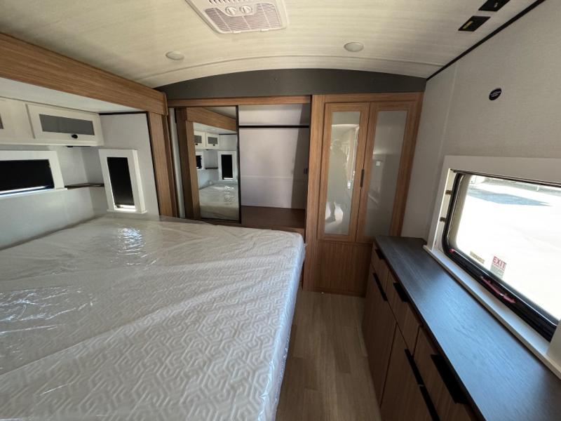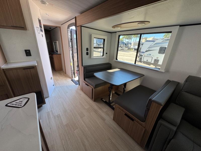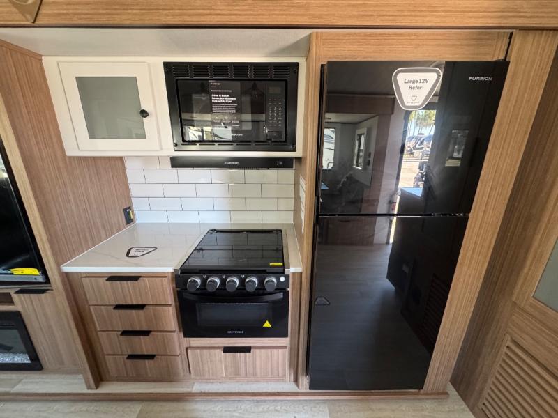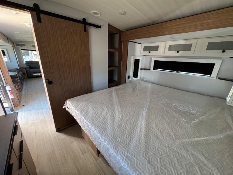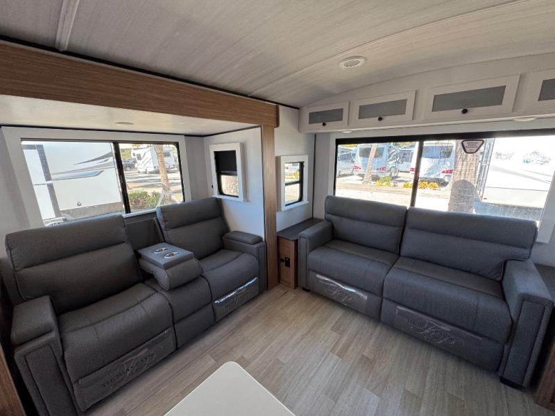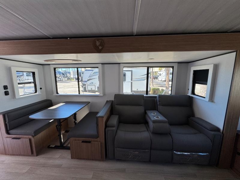 You will feel right at home in this travel trailer! The front private bedroom has a king bed slide to lay your head on at night, a front closet with washer and dryer prep, plus a dresser with a flip-up top and TV prep. Just outside the bedroom is the full bathroom with a shower with a skylight for added natural lighting as you get ready. Now that you're ready for the day, you can head to the fully equipped kitchen complete with a kitchen island to whip up some delicious cinnamon rolls that can be enjoyed at the Do-More Dinette table. The rear living area not only has luxury cinema recliners, but also a tri-fold sofa by an entertainment center with a fireplace!