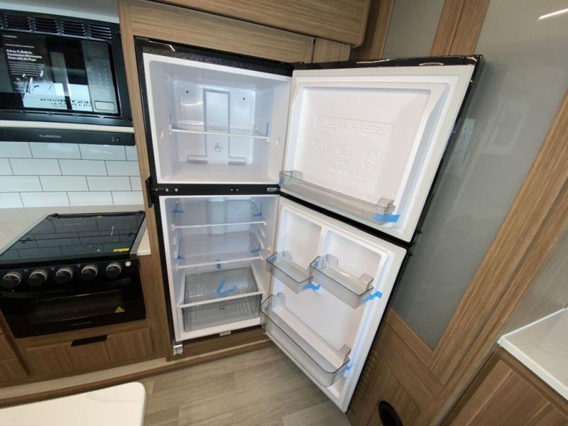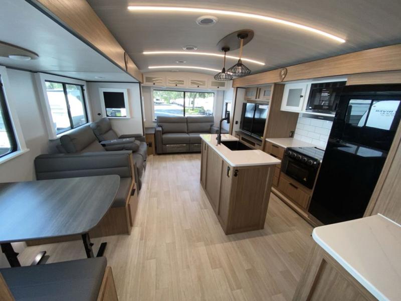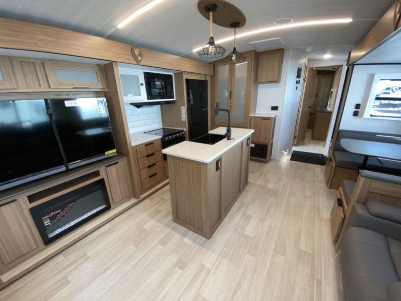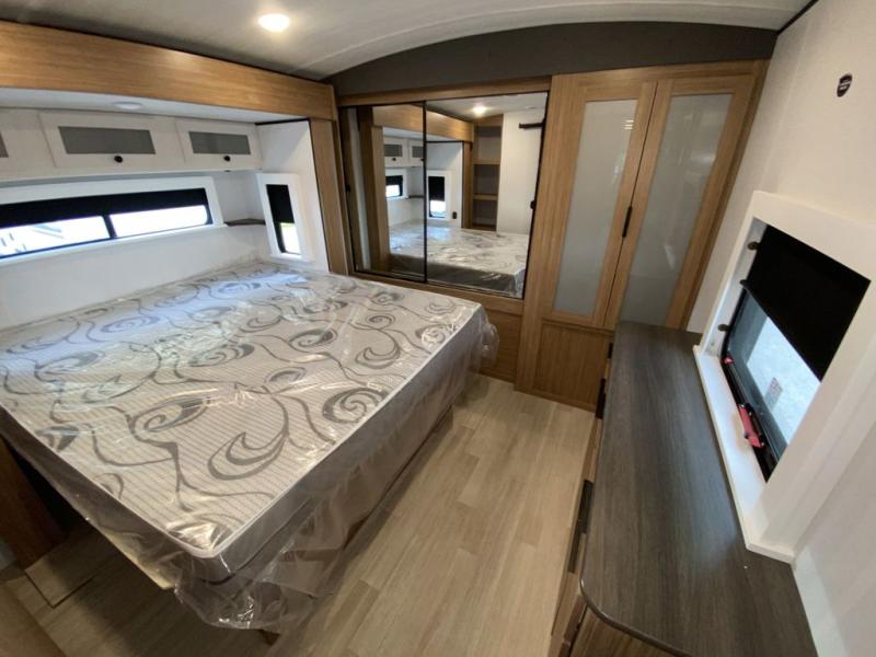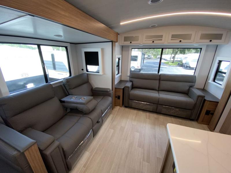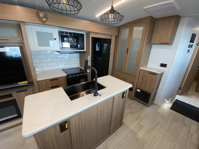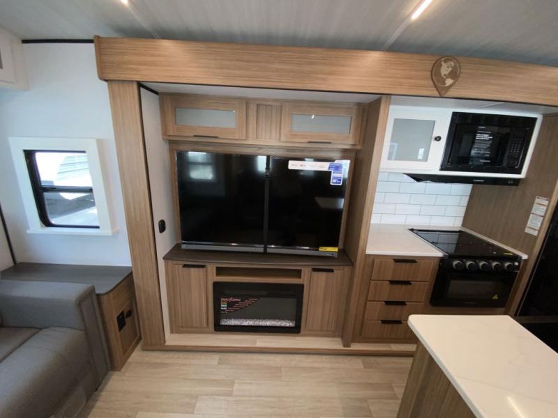 You will feel right at home in this travel trailer! The front private bedroom has a king bed slide to lay your head on at night, a front closet with washer and dryer prep, plus a dresser with a flip-up top and TV prep. Just outside the bedroom is the full bathroom with a shower with a skylight for added natural lighting as you get ready. Now that you're ready for the day, you can head to the fully equipped kitchen complete with a kitchen island to whip up some delicious cinnamon rolls that can be enjoyed at the Do-More Dinette table. The rear living area not only has luxury cinema recliners, but also a tri-fold sofa by an entertainment center with a fireplace!