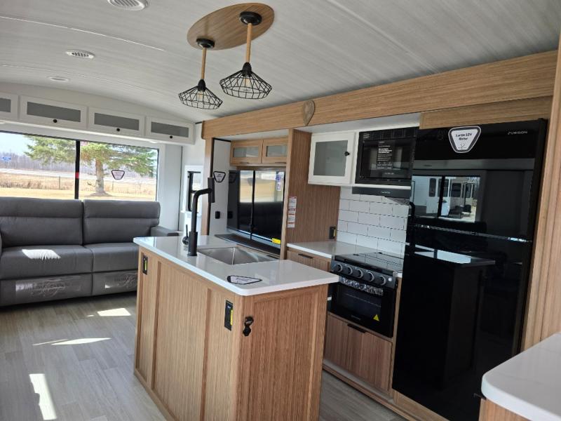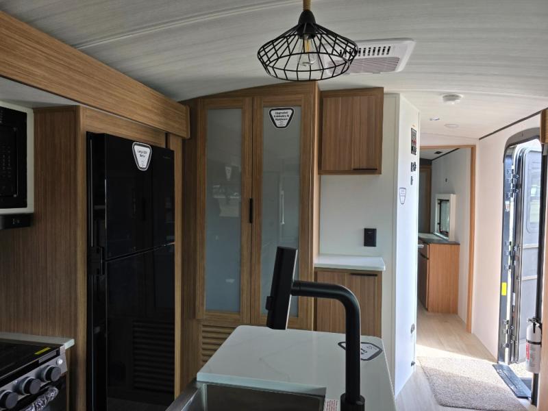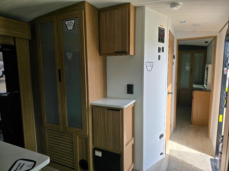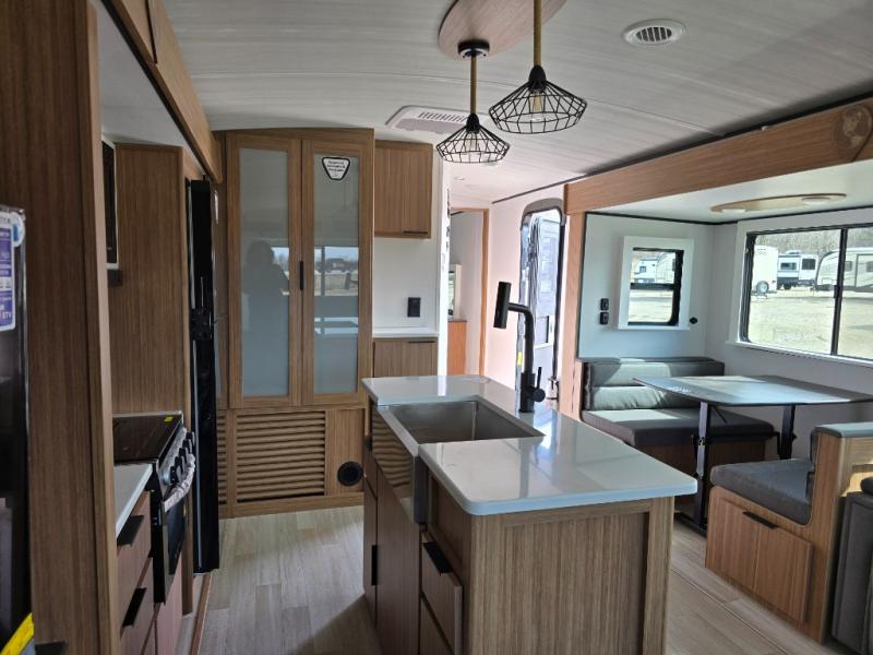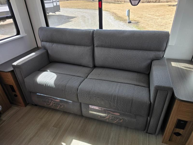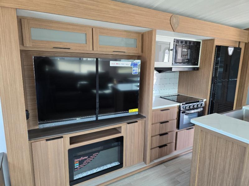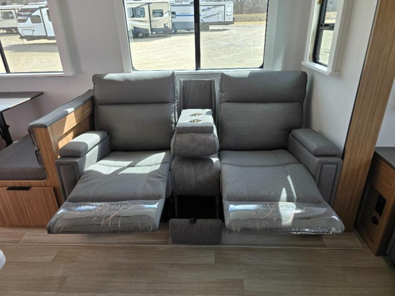 You will feel right at home in this travel trailer! The front private bedroom has a king bed slide to lay your head on at night, a front closet with washer and dryer prep, plus a dresser with a flip-up top. Just outside the bedroom is the full bathroom with a shower with a skylight for added natural lighting as you get ready. Now that you're ready for the day, you can head to the fully equipped kitchen complete with a kitchen island to whip up some delicious cinnamon rolls that can be enjoyed at the Do-More Dinette table. The rear living area not only has luxury cinema recliners, but also a tri-fold sofa by an entertainment center with a fireplace!