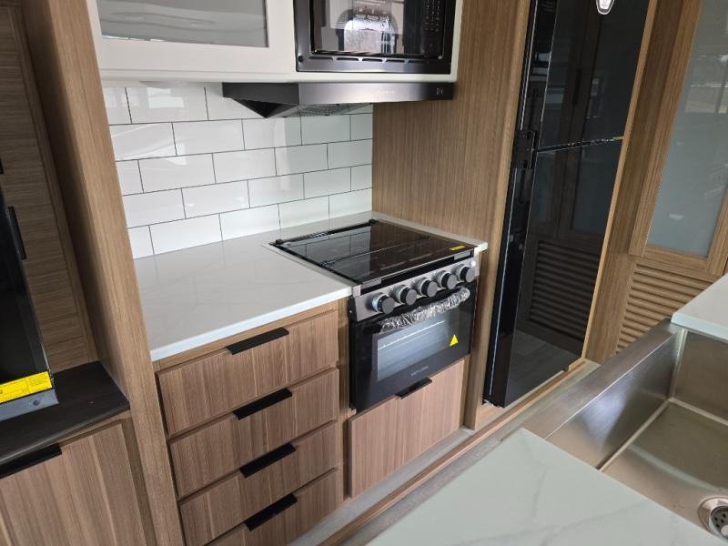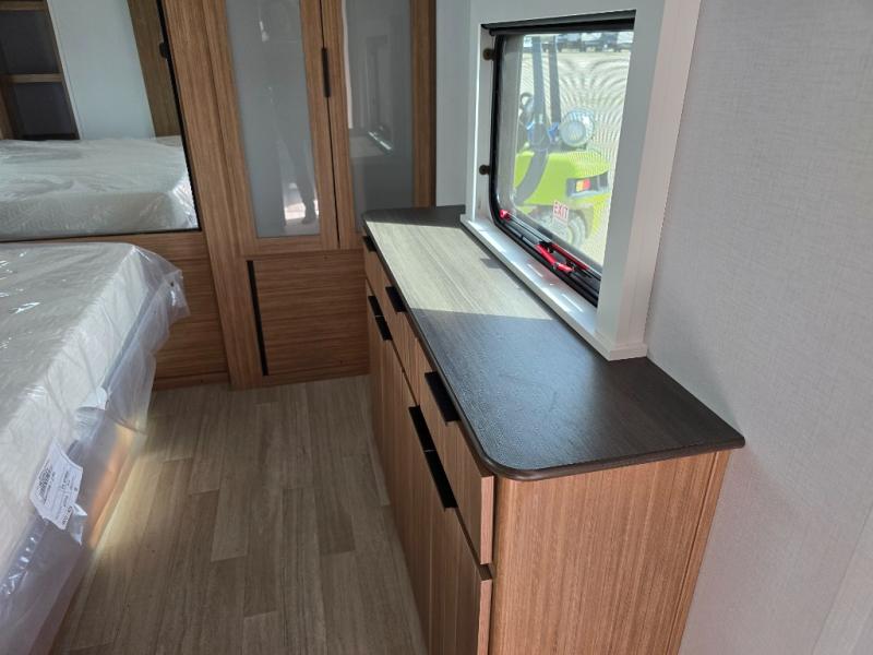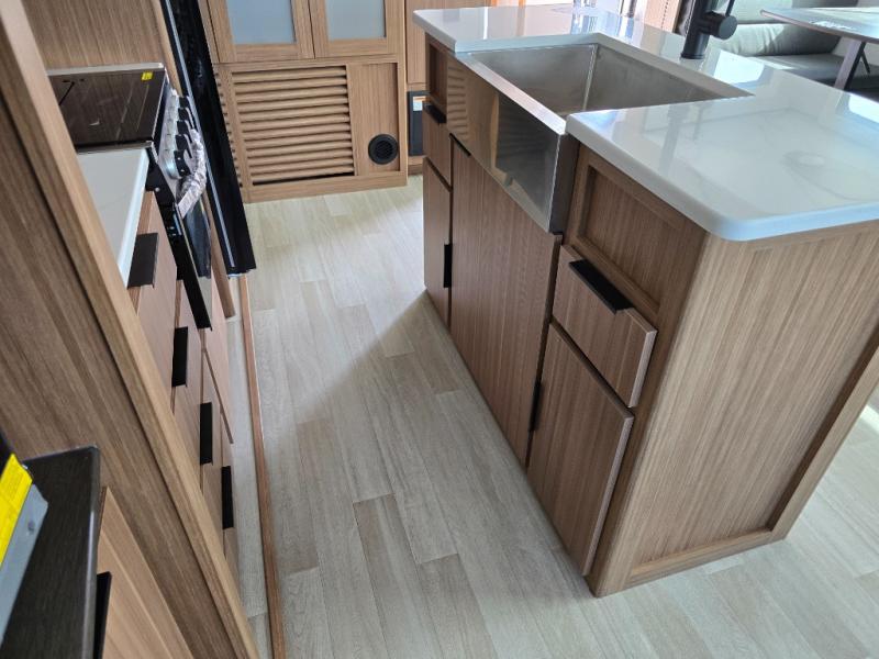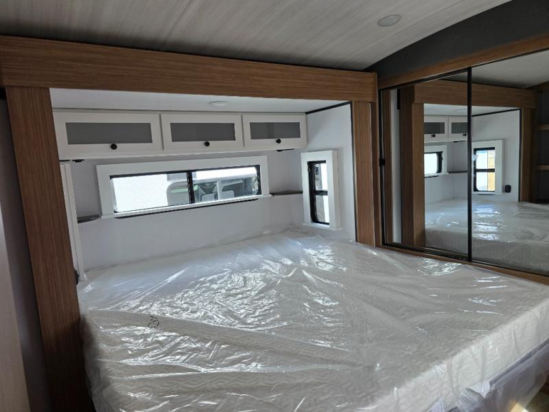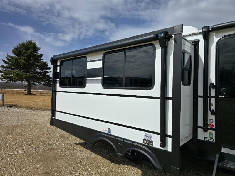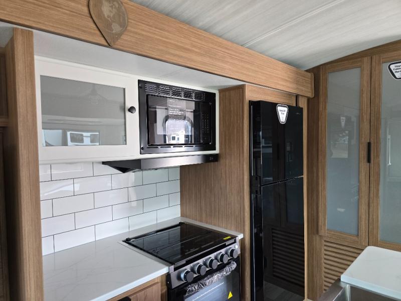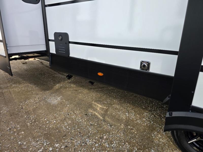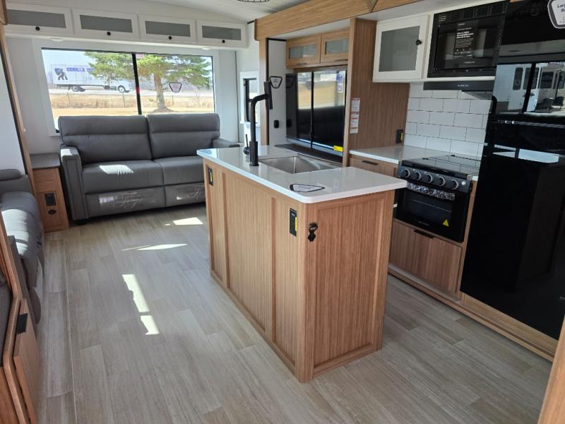 You will feel right at home in this travel trailer! The front private bedroom has a king bed slide to lay your head on at night, a front closet with washer and dryer prep, plus a dresser with a flip-up top. Just outside the bedroom is the full bathroom with a shower with a skylight for added natural lighting as you get ready. Now that you're ready for the day, you can head to the fully equipped kitchen complete with a kitchen island to whip up some delicious cinnamon rolls that can be enjoyed at the Do-More Dinette table. The rear living area not only has luxury cinema recliners, but also a tri-fold sofa by an entertainment center with a fireplace!