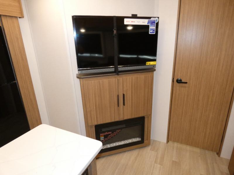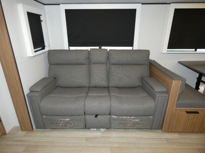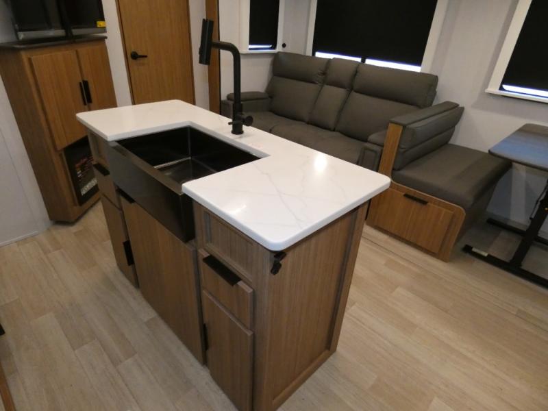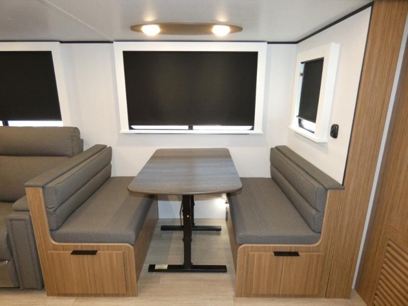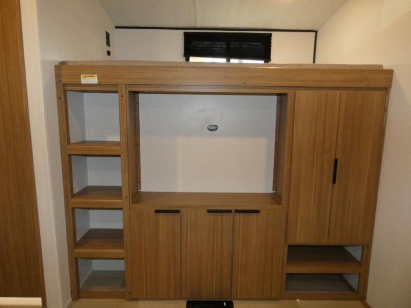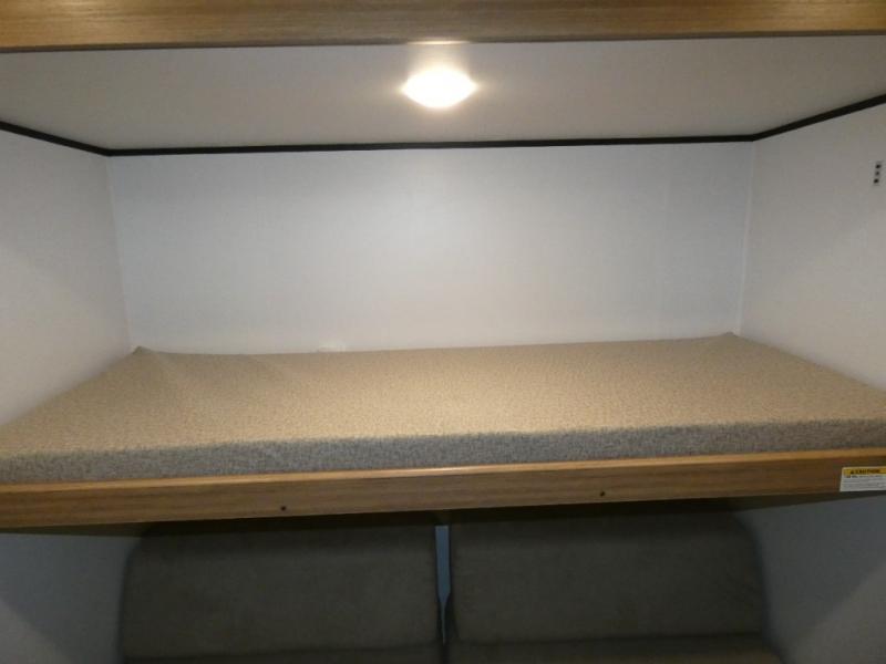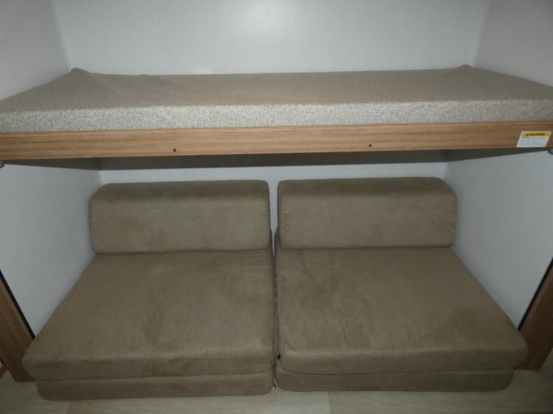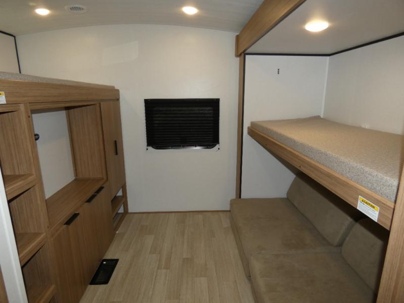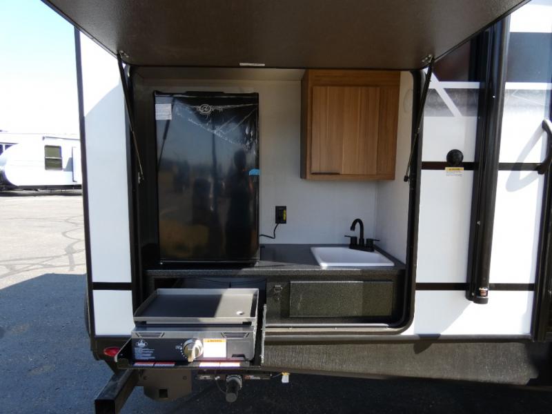 You won't believe all that this travel trailer has to offer! Starting with the rear private bunkhouse which has a 28" x 74" flip-up bunk above a tri-fold sofa, a 51" x 74" bunk above an entertainment center, and even a half bathroom which has one of the dual entry doors to the unit. The front private bedroom has a queen bed to lay your head on at night with wardrobes on either side. As you exit the bedroom, you will enter the walk-through bathroom. Now that you're ready for the day, you can head to the fully equipped kitchen complete with a kitchen island to whip up some delicious cinnamon rolls that can be enjoyed at the Do-More dinette table. You even have an outside kitchen with a griddle, sink, and mini-fridge!
