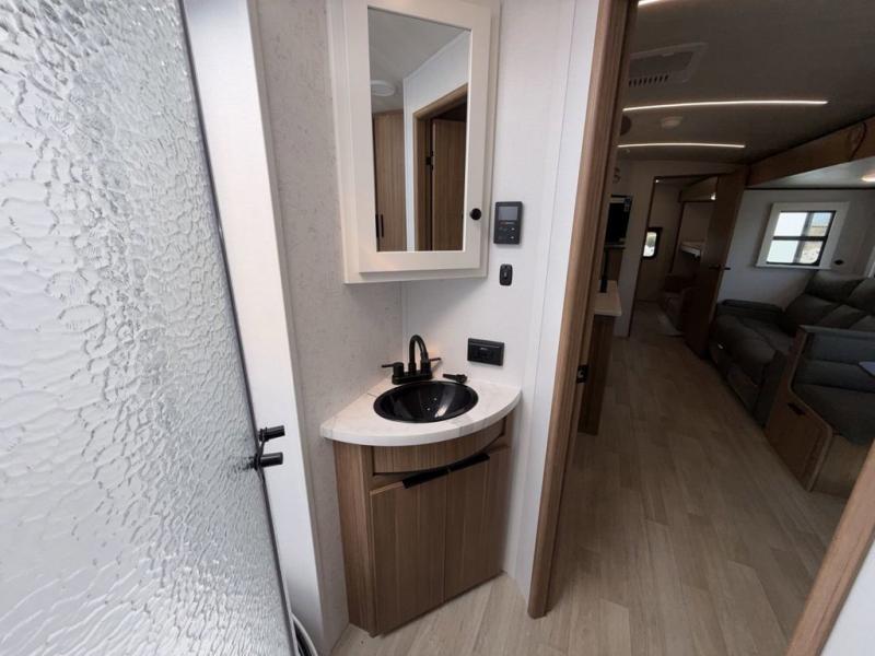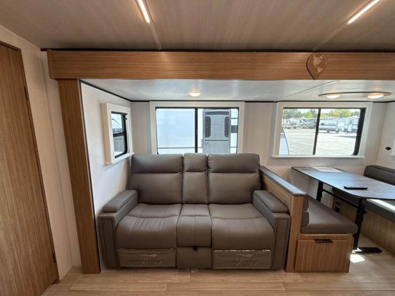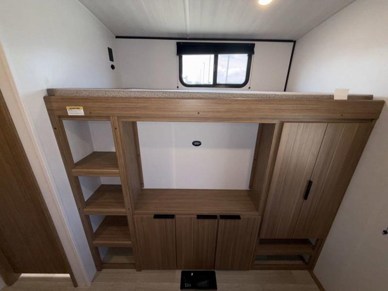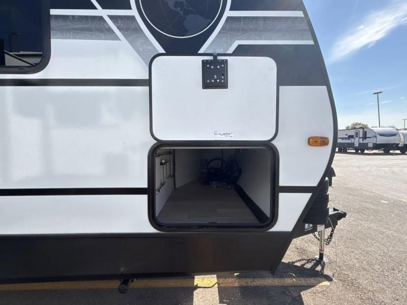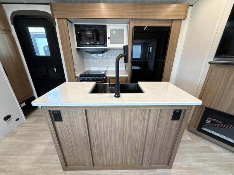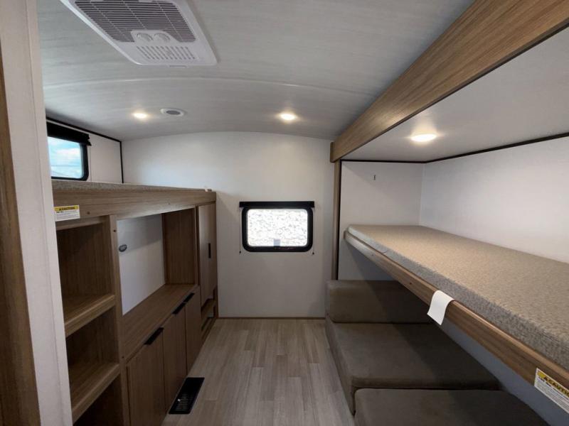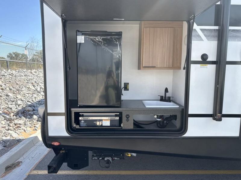 You won't believe all that this travel trailer has to offer! Starting with the rear private bunkhouse which has a 28" x 74" flip-up bunk above a tri-fold sofa, a 51" x 74" bunk above an entertainment center, and even a half bathroom which has one of the dual entry doors to the unit. The front private bedroom has a queen bed to lay your head on at night with wardrobes on either side. As you exit the bedroom, you will enter the walk-through bathroom. Now that you're ready for the day, you can head to the fully equipped kitchen complete with a kitchen island to whip up some delicious cinnamon rolls that can be enjoyed at the Do-More dinette table. You even have an outside kitchen with a griddle, sink, and mini-fridge!