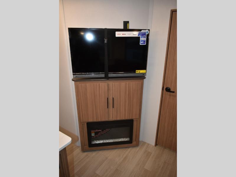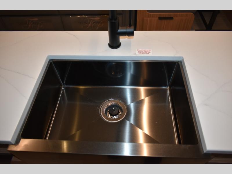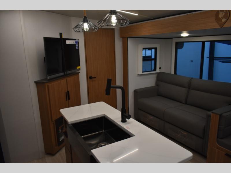 You won't believe all that this travel trailer has to offer! Starting with the rear private bunkhouse which has a 28" x 74" flip-up bunk above a tri-fold sofa, a 51" x 74" bunk above an entertainment center, and even a half bathroom which has one of the dual entry doors to the unit. The front private bedroom has a queen bed to lay your head on at night with wardrobes on either side. As you exit the bedroom, you will enter the walk-through bathroom. Now that you're ready for the day, you can head to the fully equipped kitchen complete with a kitchen island to whip up some delicious cinnamon rolls that can be enjoyed at the Do-More dinette table. You even have an outside kitchen with a griddle, sink, and mini-fridge!