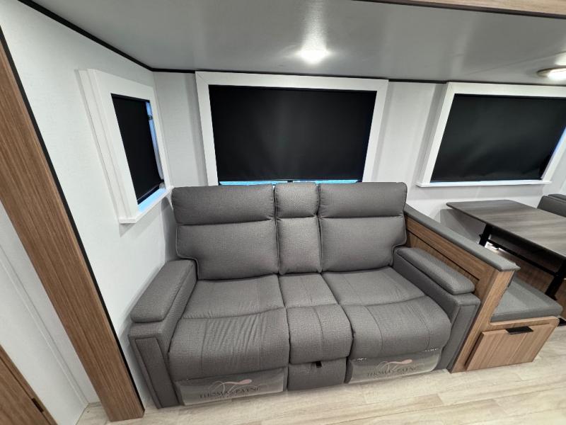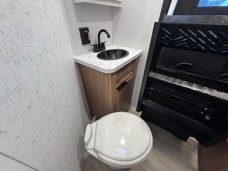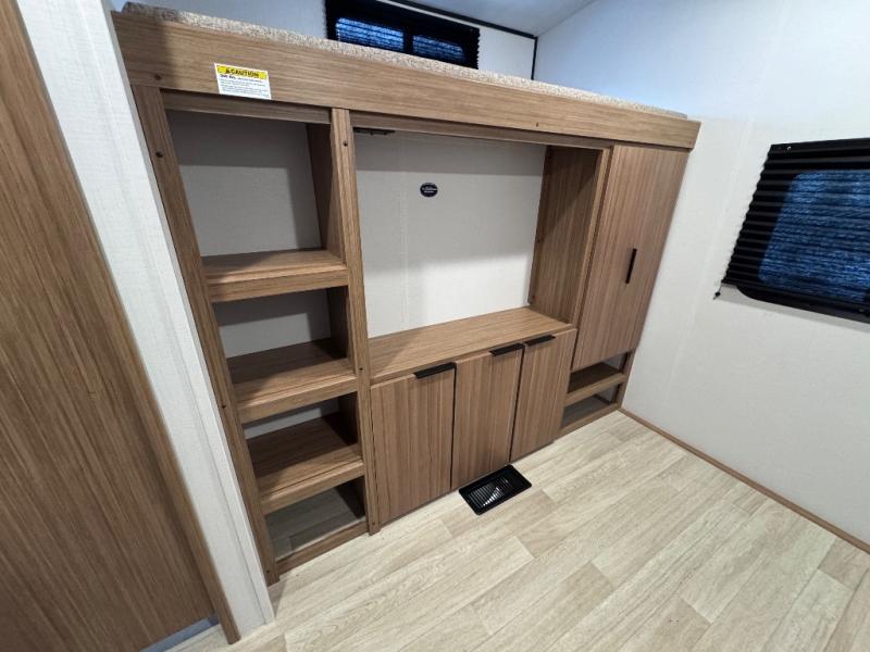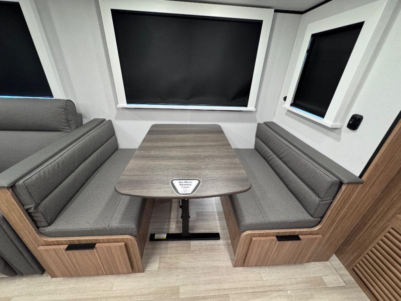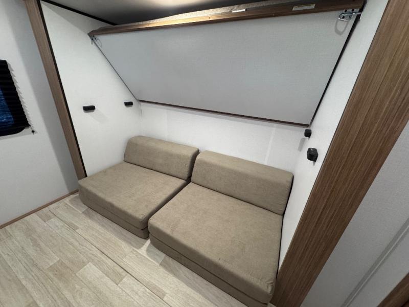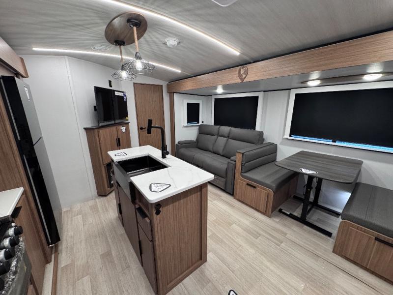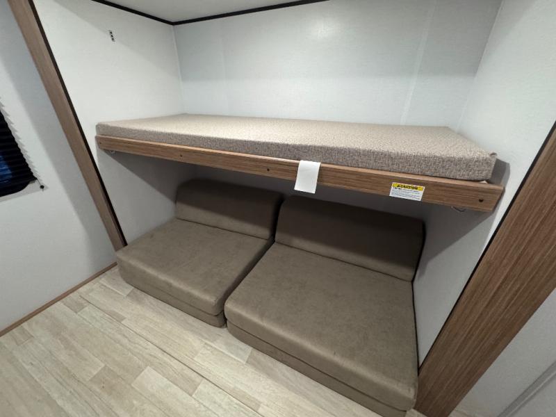 You won't believe all that this travel trailer has to offer! Starting with the rear private bunkhouse which has a 28" x 74" flip-up bunk above a tri-fold sofa, a 51" x 74" bunk above an entertainment center, and even a half bathroom which has one of the dual entry doors to the unit. The front private bedroom has a queen bed to lay your head on at night with wardrobes on either side. As you exit the bedroom, you will enter the walk-through bathroom. Now that you're ready for the day, you can head to the fully equipped kitchen complete with a kitchen island to whip up some delicious cinnamon rolls that can be enjoyed at the Do-More dinette table. You even have an outside kitchen with a griddle, sink, and mini-fridge!