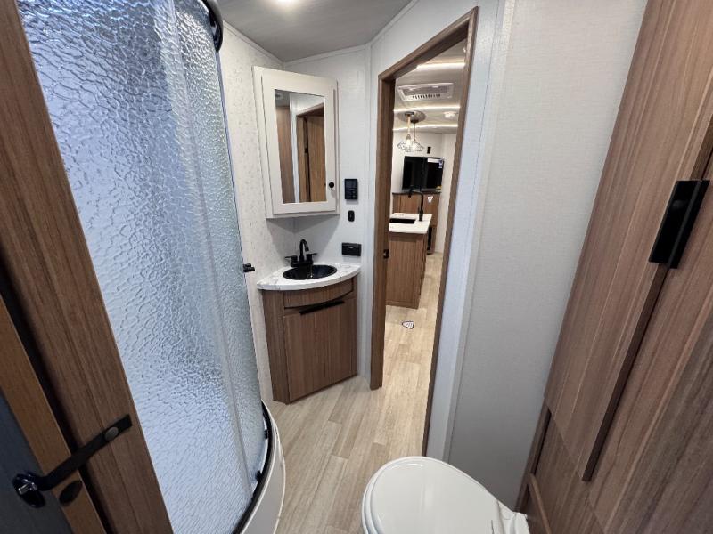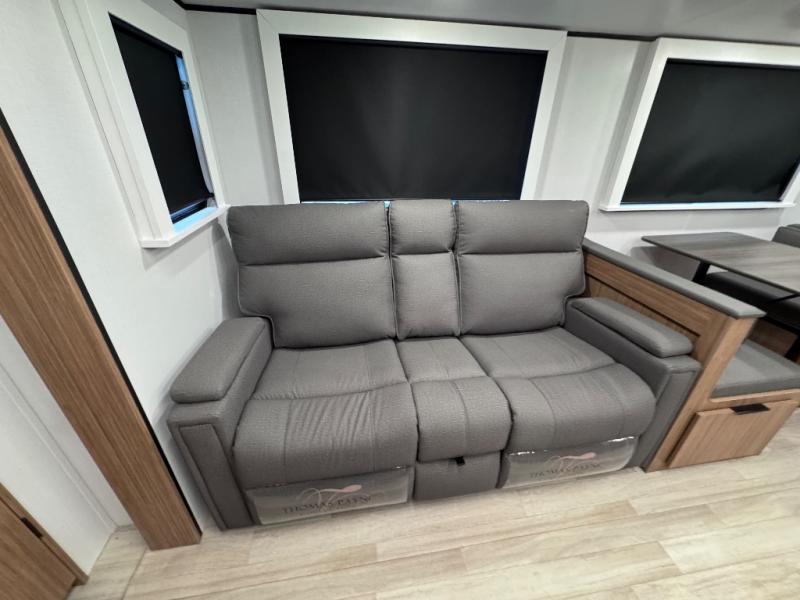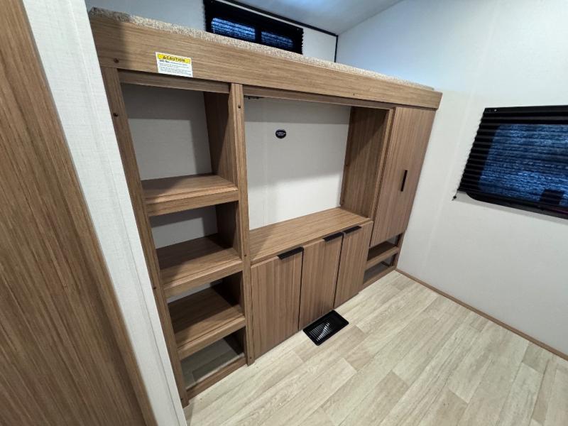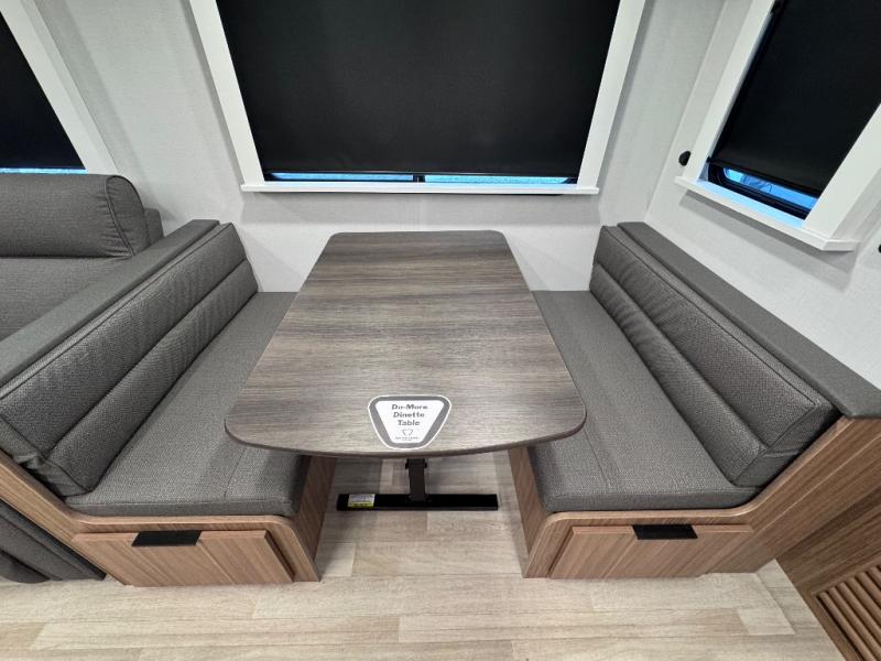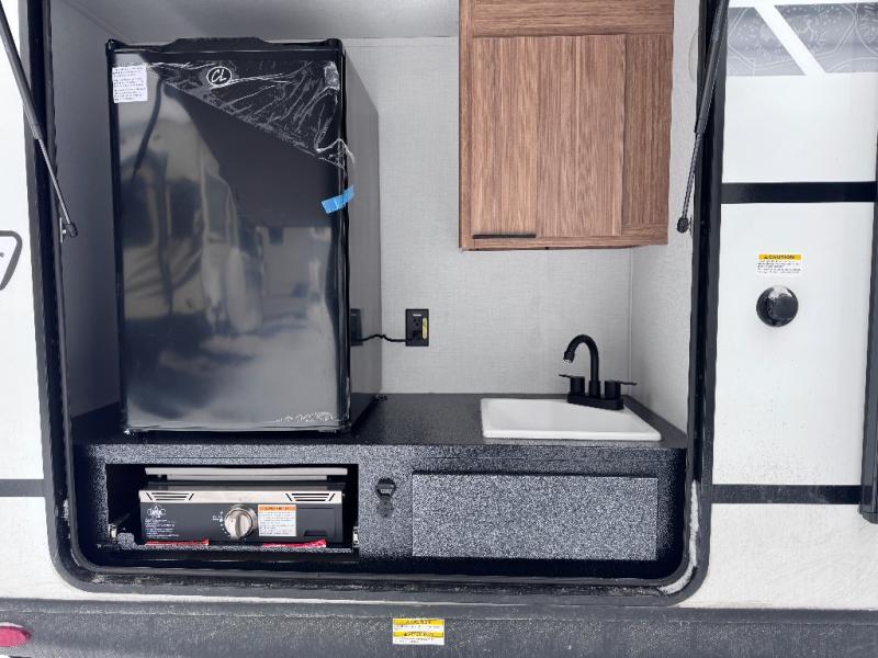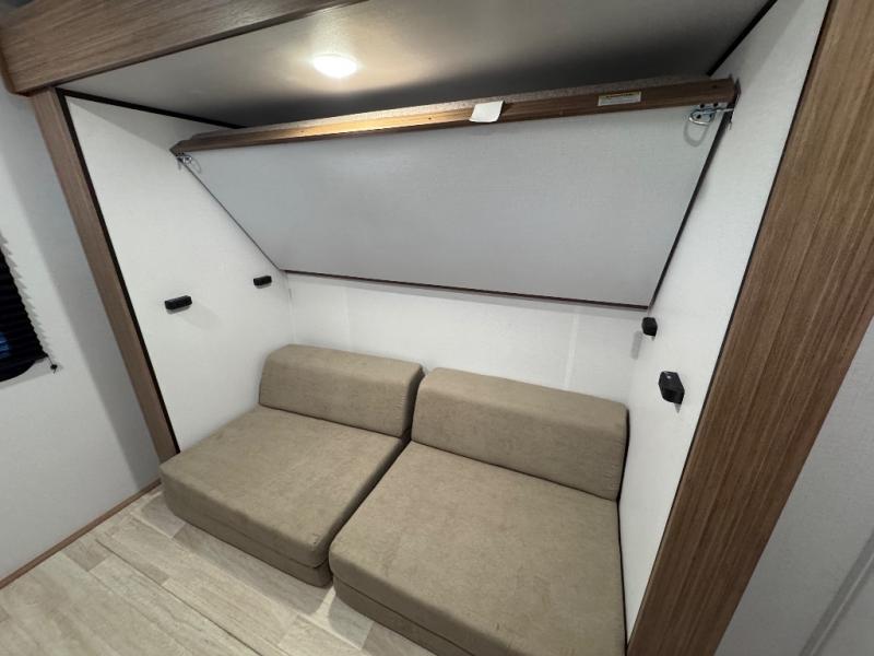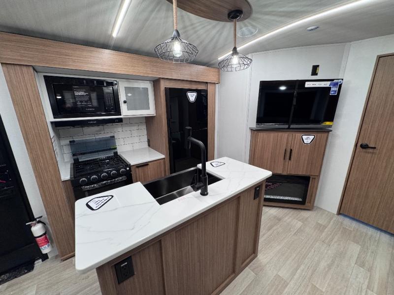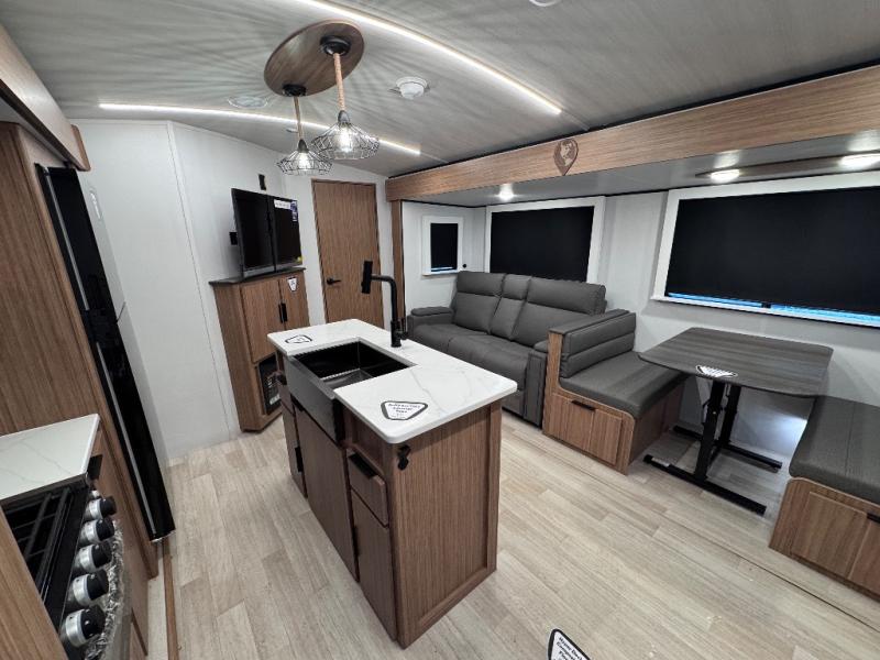 You won't believe all that this travel trailer has to offer! Starting with the rear private bunkhouse which has a 28" x 74" flip-up bunk above a tri-fold sofa, a 51" x 74" bunk above an entertainment center, and even a half bathroom which has one of the dual entry doors to the unit. The front private bedroom has a queen bed to lay your head on at night with wardrobes on either side. As you exit the bedroom, you will enter the walk-through bathroom. Now that you're ready for the day, you can head to the fully equipped kitchen complete with a kitchen island to whip up some delicious cinnamon rolls that can be enjoyed at the Do-More dinette table. You even have an outside kitchen with a griddle, sink, and mini-fridge!