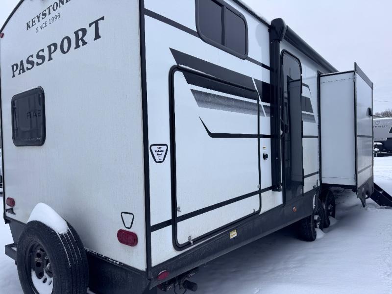 Each one of these Keystone RV Passport travel trailers offer grand style and multi-functional features! They have best-in-class storage for big things like paddle boards and small things like sleeping bags. There's no need for cordless drills and bending over to put the jacks down, simply push a button and the power stabilizer jacks do the rest. The heated and enclosed underbelly helps protect your unit's vitals in different weather conditions. Exclusive to Keystone is the Beauflor® vinyl flooring which is more resilient, stronger and lighter than the traditional laminated wood construction, plus it resists water and water damage. Inside, you'll find residential durable Cedar frost interior decor, LED lights throughout, decorative bedspread, and a skylight for more natural light.