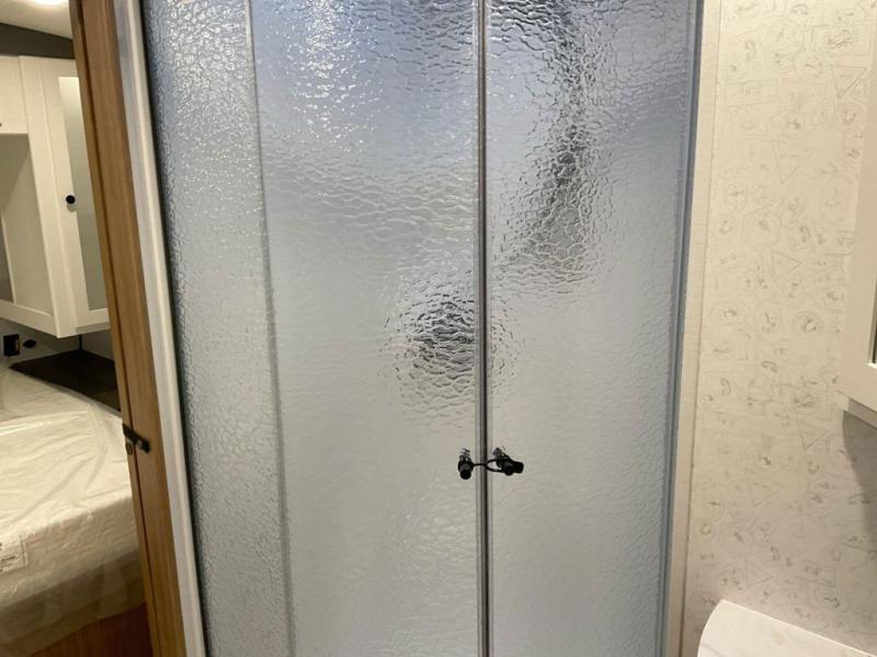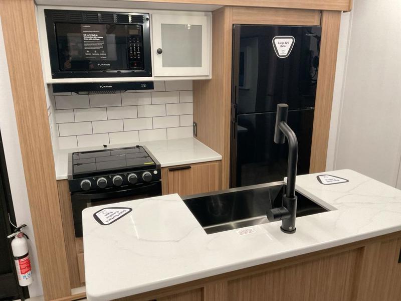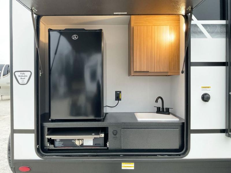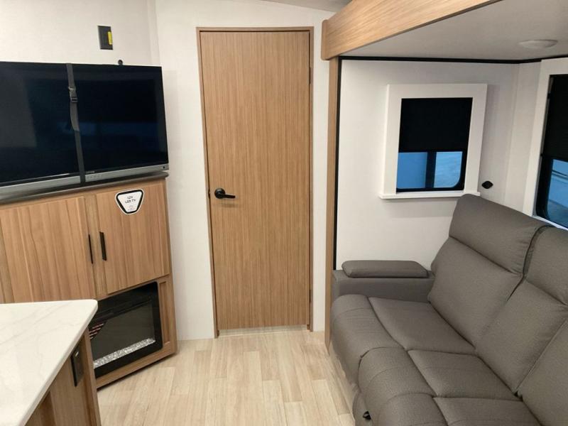 You won't believe all that this travel trailer has to offer! Starting with the rear private bunkhouse which has a 28" x 74" flip-up bunk above a tri-fold sofa, a 51" x 74" bunk above an entertainment center, and even a half bathroom which has one of the dual entry doors to the unit. The front private bedroom has a queen bed to lay your head on at night with wardrobes on either side. As you exit the bedroom, you will enter the walk-through bathroom. Now that you're ready for the day, you can head to the fully equipped kitchen complete with a kitchen island to whip up some delicious cinnamon rolls that can be enjoyed at the Do-More dinette table. You even have an outside kitchen with a griddle, sink, and mini-fridge!
