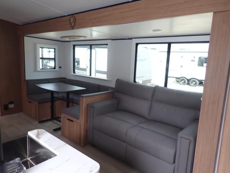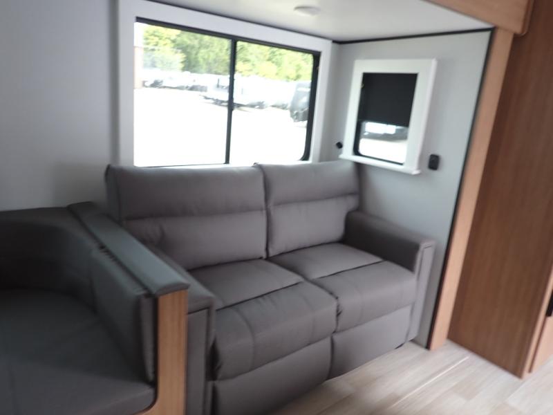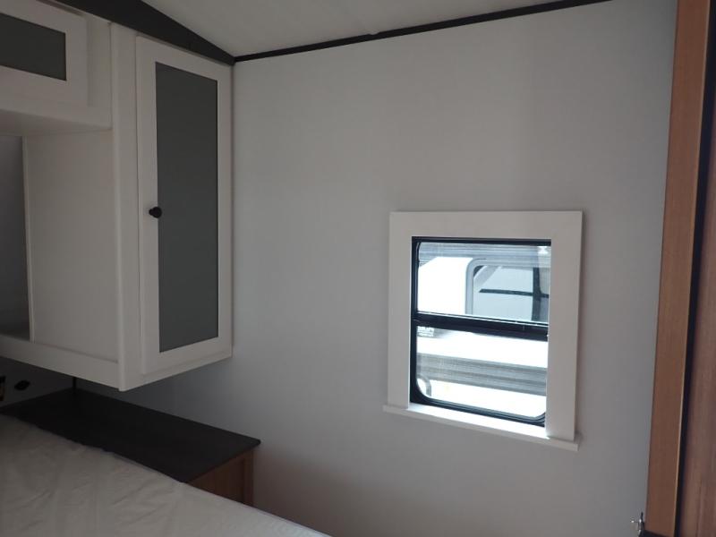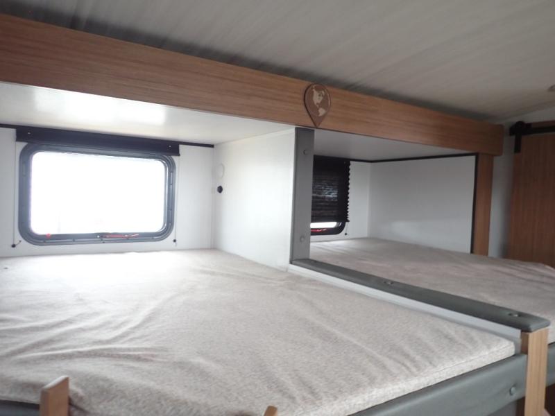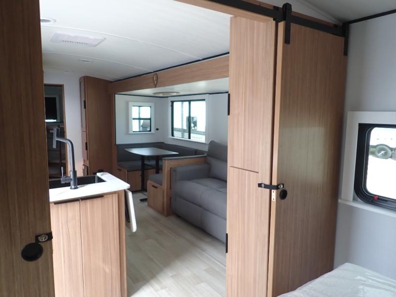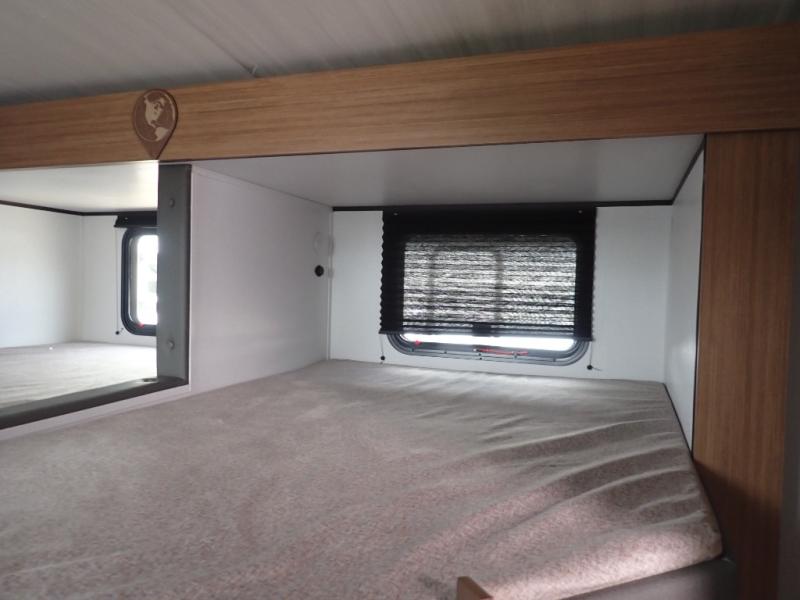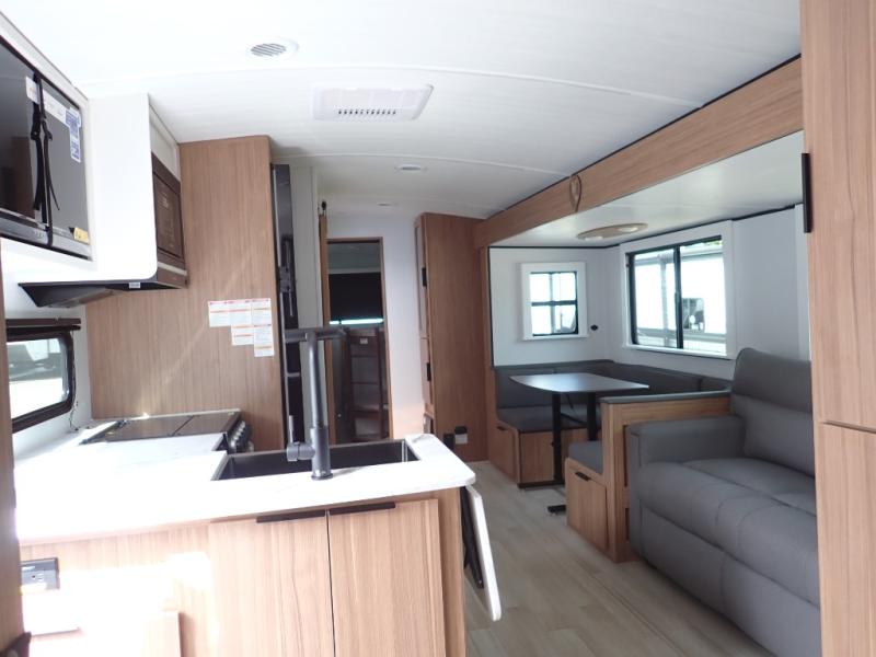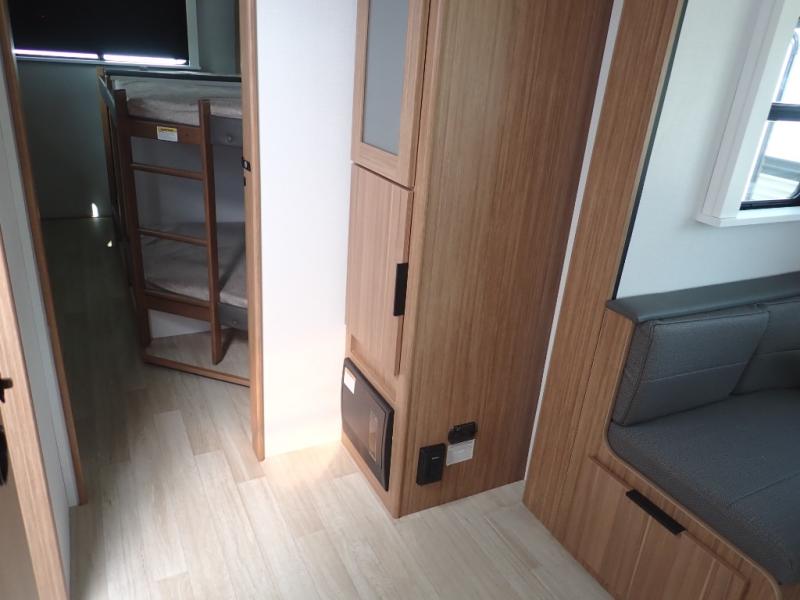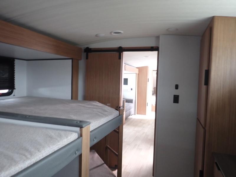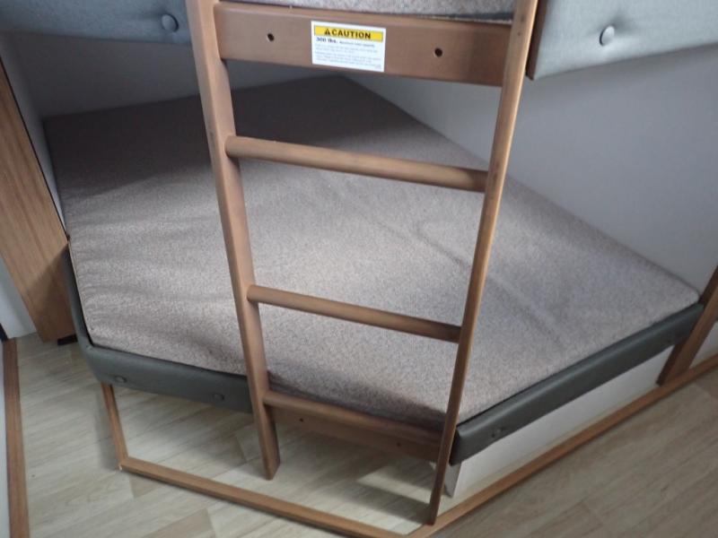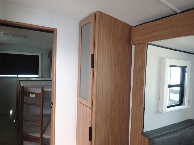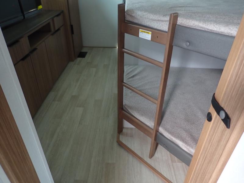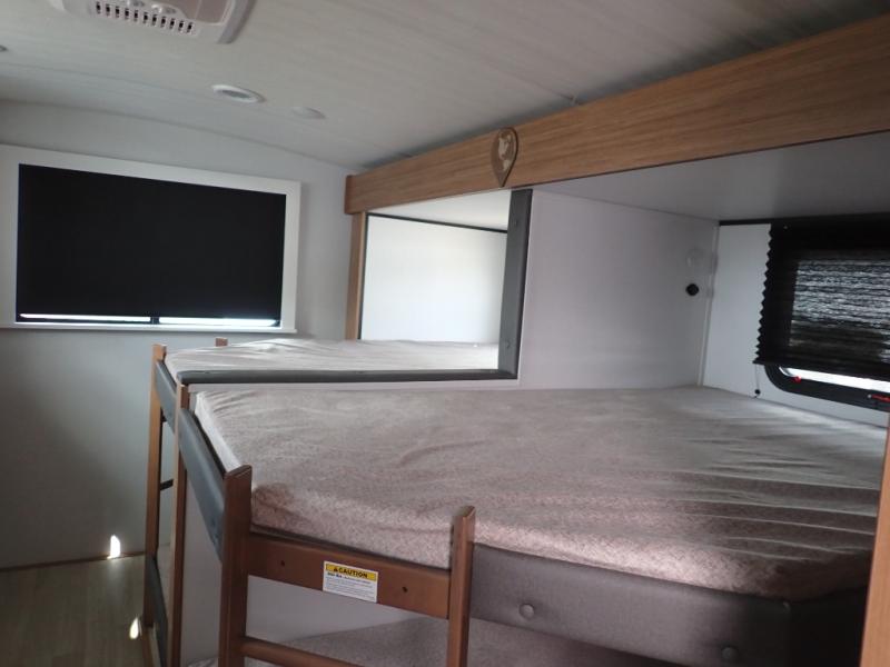 If you're looking for a travel trailer with more interior space and a large sleeping capacity, this is the one! The rear bunkhouse includes quad bunks with flip-up bottom bunks for added space when they're not in use. There are also two wardrobes/closets here and an entertainment center if you want to add a TV. While your guests enjoy this space, you'll have the front private bedroom all to yourselves with a queen bed, dual nightstands, and dual wardrobes to keep your clothes organized. Everyone can meet in the middle living area and kitchen to dine around the U-shaped do-more dinette table or relax on the tri-fold sofa sleeper. There is a full kitchen with a flip-up countertop for more prep space, and the pantry will be perfect for snacks. This unit also includes a full bath with one of the dual entry doors for added convenience!