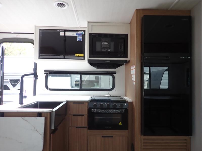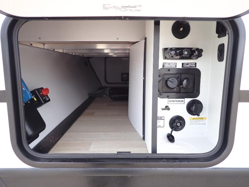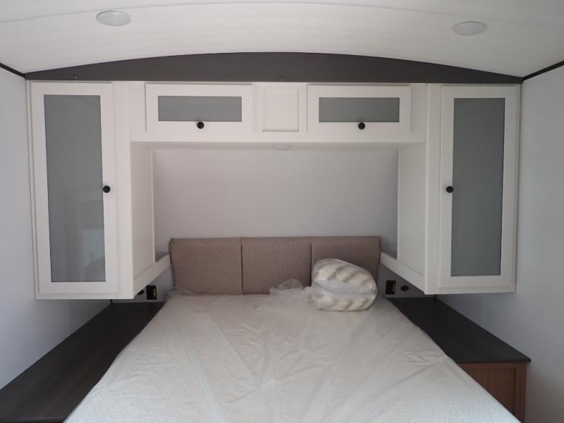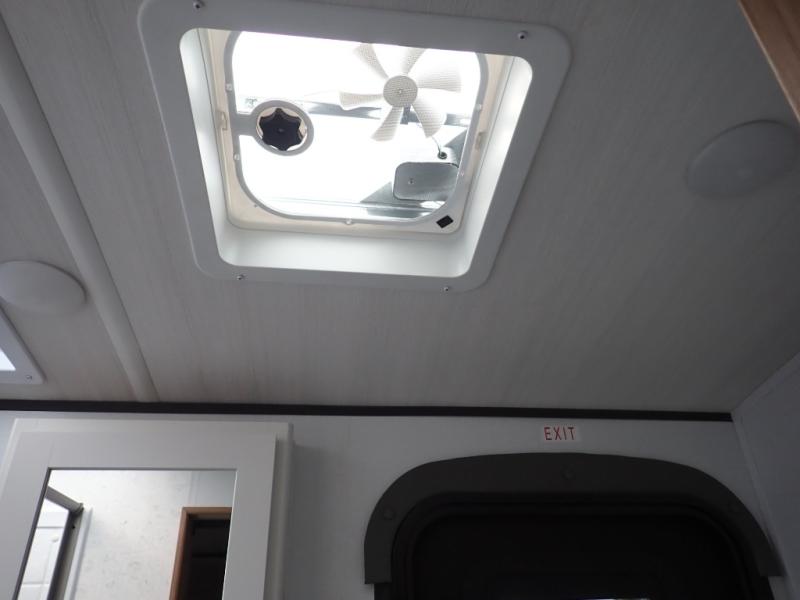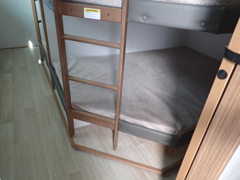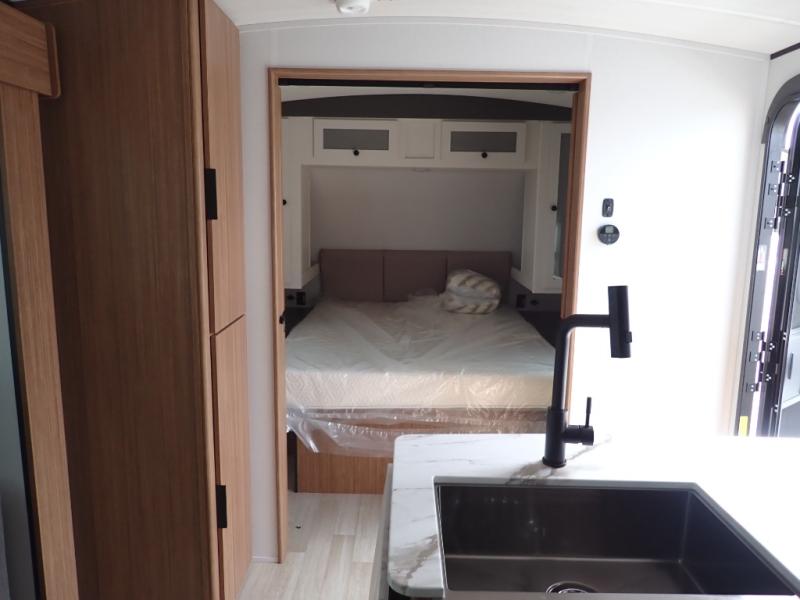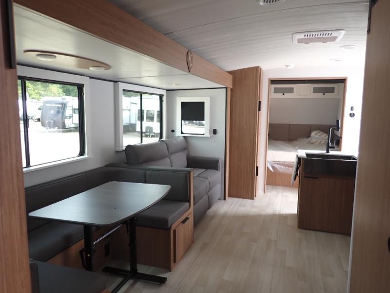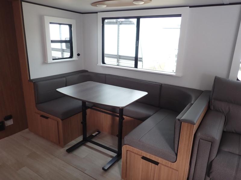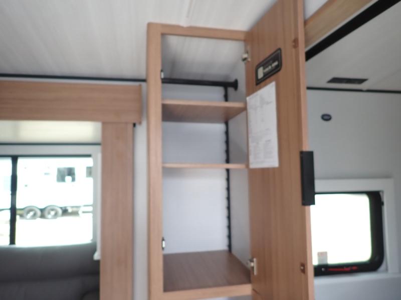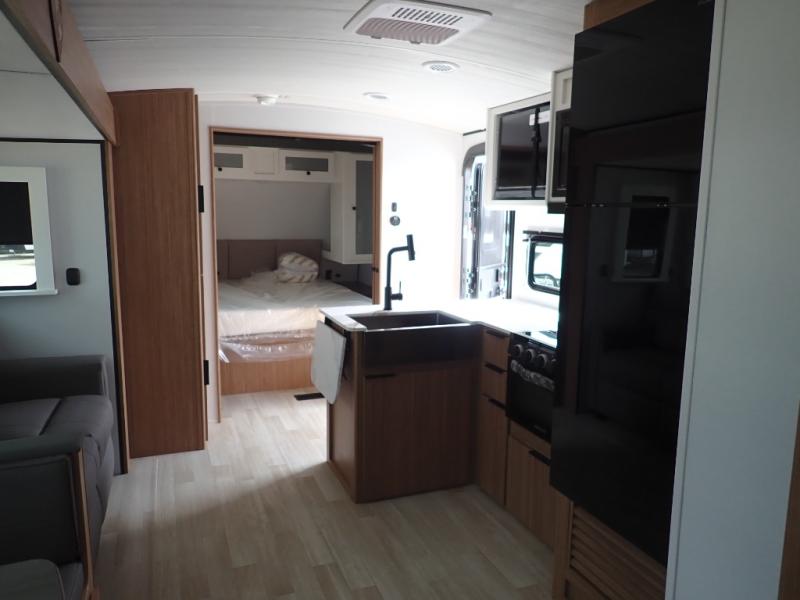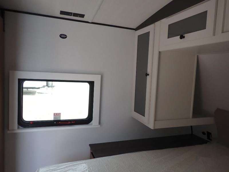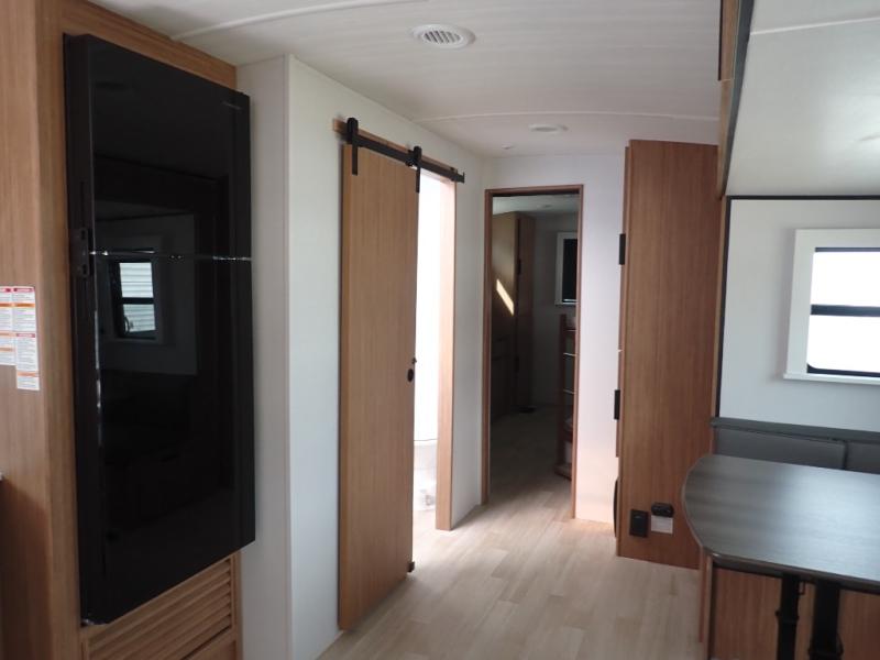 If you're looking for a travel trailer with more interior space and a large sleeping capacity, this is the one! The rear bunkhouse includes quad bunks with flip-up bottom bunks for added space when they're not in use. There are also two wardrobes/closets here and an entertainment center if you want to add a TV. While your guests enjoy this space, you'll have the front private bedroom all to yourselves with a queen bed, dual nightstands, and dual wardrobes to keep your clothes organized. Everyone can meet in the middle living area and kitchen to dine around the U-shaped do-more dinette table or relax on the tri-fold sofa sleeper. There is a full kitchen with a flip-up countertop for more prep space, and the pantry will be perfect for snacks. This unit also includes a full bath with one of the dual entry doors for added convenience!