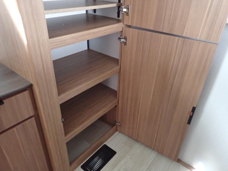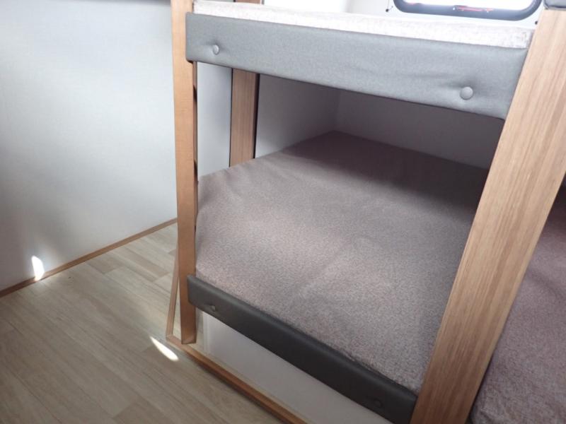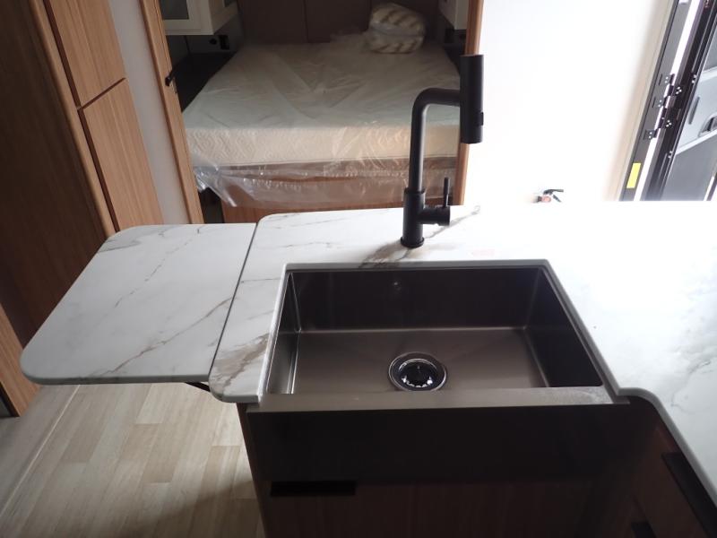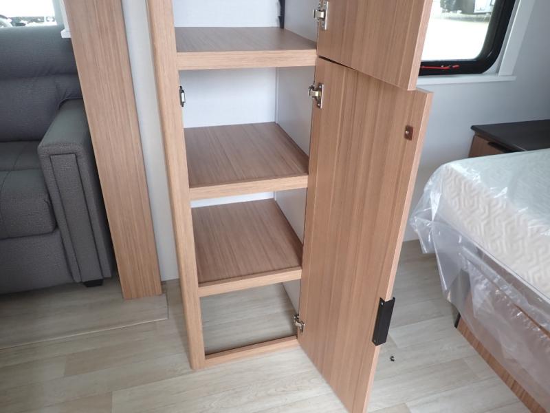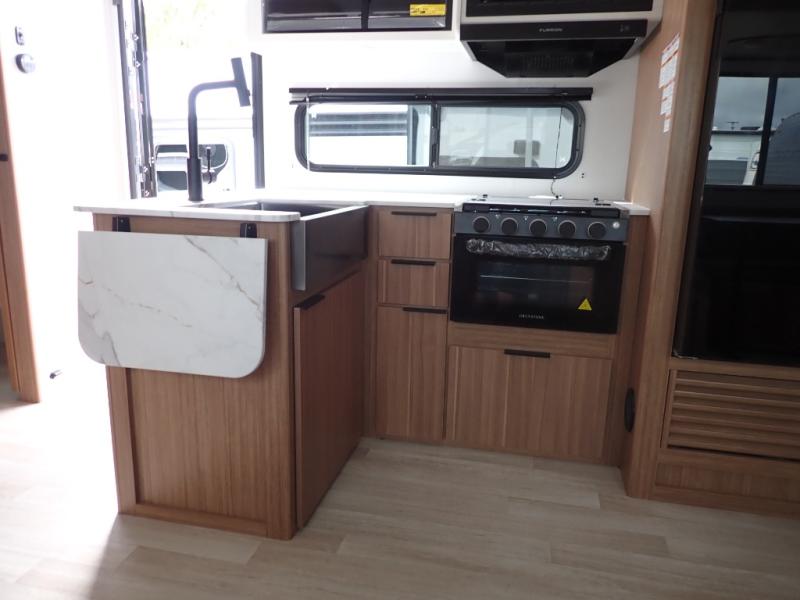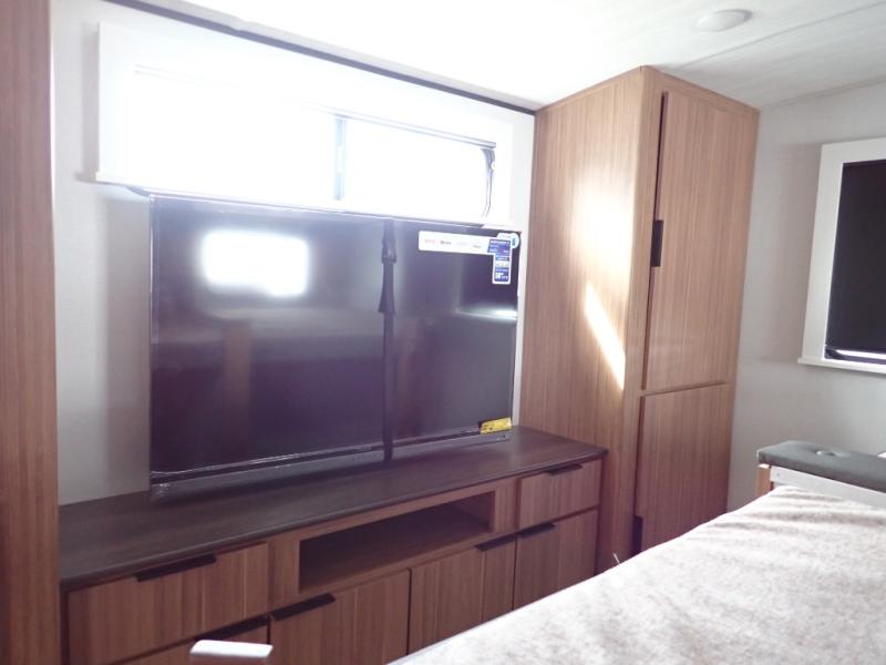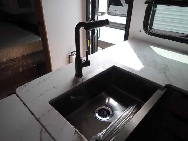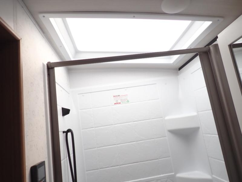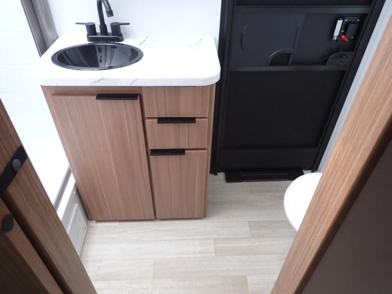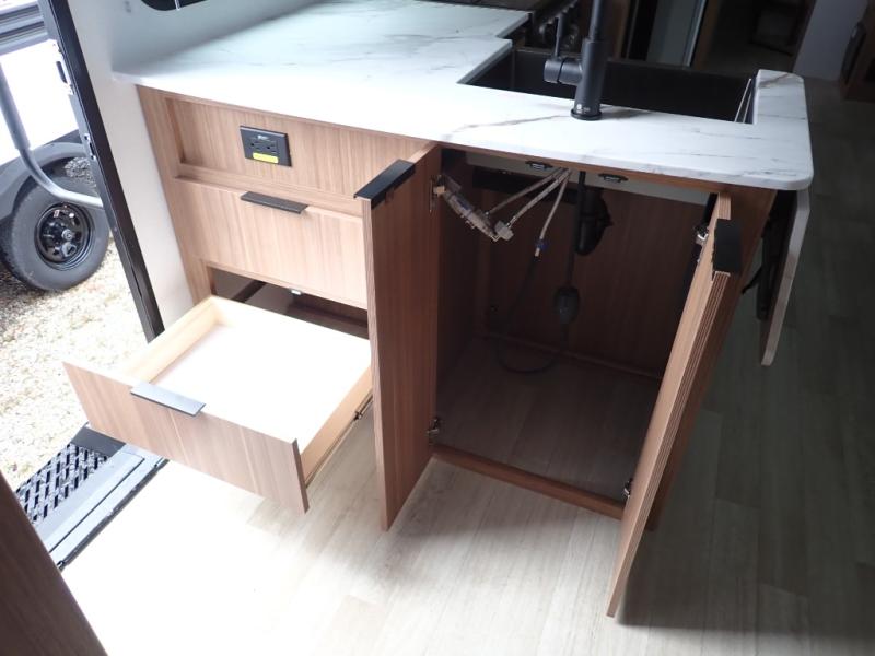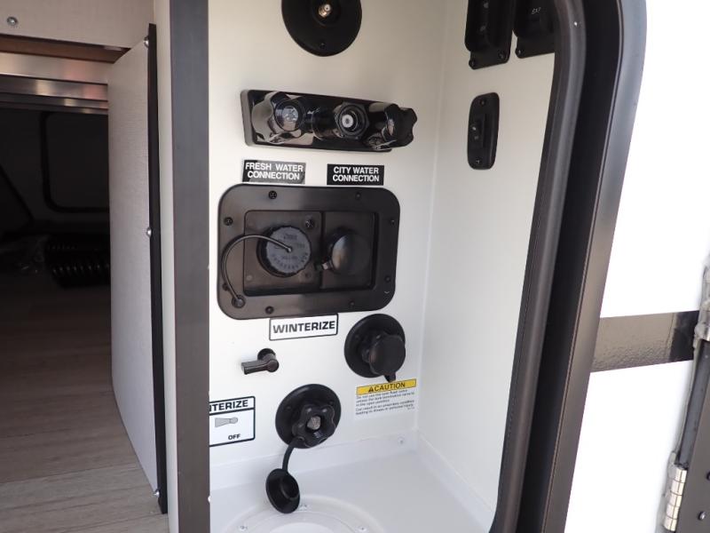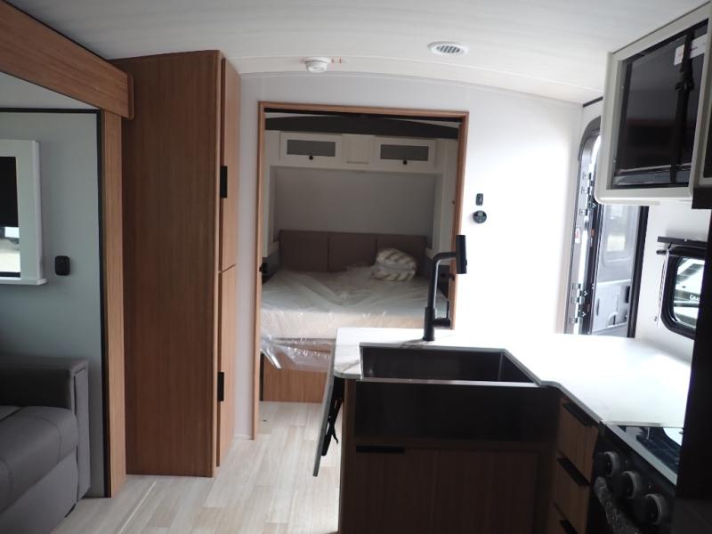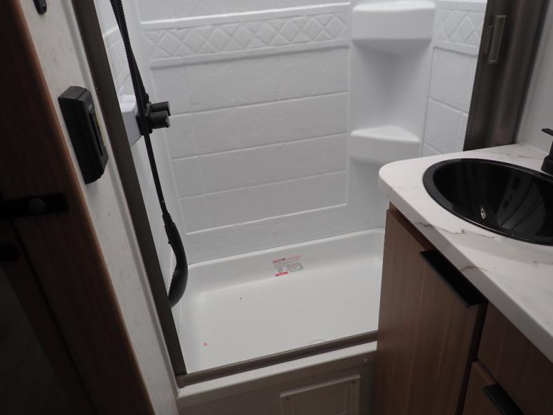 If you're looking for a travel trailer with more interior space and a large sleeping capacity, this is the one! The rear bunkhouse includes quad bunks with flip-up bottom bunks for added space when they're not in use. There are also two wardrobes/closets here and an entertainment center if you want to add a TV. While your guests enjoy this space, you'll have the front private bedroom all to yourselves with a queen bed, dual nightstands, and dual wardrobes to keep your clothes organized. Everyone can meet in the middle living area and kitchen to dine around the U-shaped do-more dinette table or relax on the tri-fold sofa sleeper. There is a full kitchen with a flip-up countertop for more prep space, and the pantry will be perfect for snacks. This unit also includes a full bath with one of the dual entry doors for added convenience!