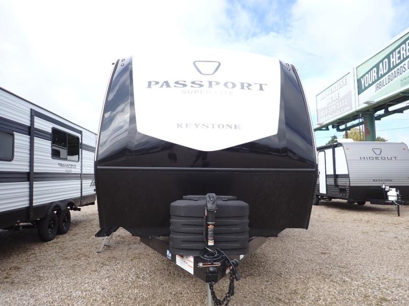 With any Keystone Passport Super Lite travel trailer you will enjoy lightweight towing and lots of interior comforts! The power tongue jack lets you hitch up at the drop of a hat, and the Dexter torsion axle rubber ride suspension will make towing easier than ever. You will appreciate having power stabilizer jacks for quick setup and an exterior convenience center to monitor tank levels. These trailers are constructed with a seamless, laminated and gel-coated filon exterior, 80% tinted safety glass windows, and a one-piece polypropylene underbelly. The interior will have you feeling right at home with residential durable Beauflor vinyl flooring, deluxe night shades, and seamless kitchen countertops to name a few comforts.