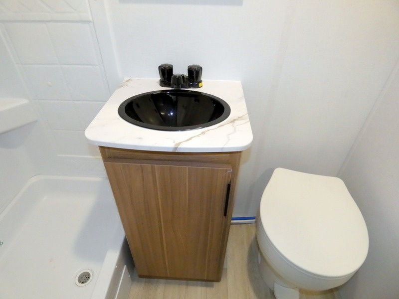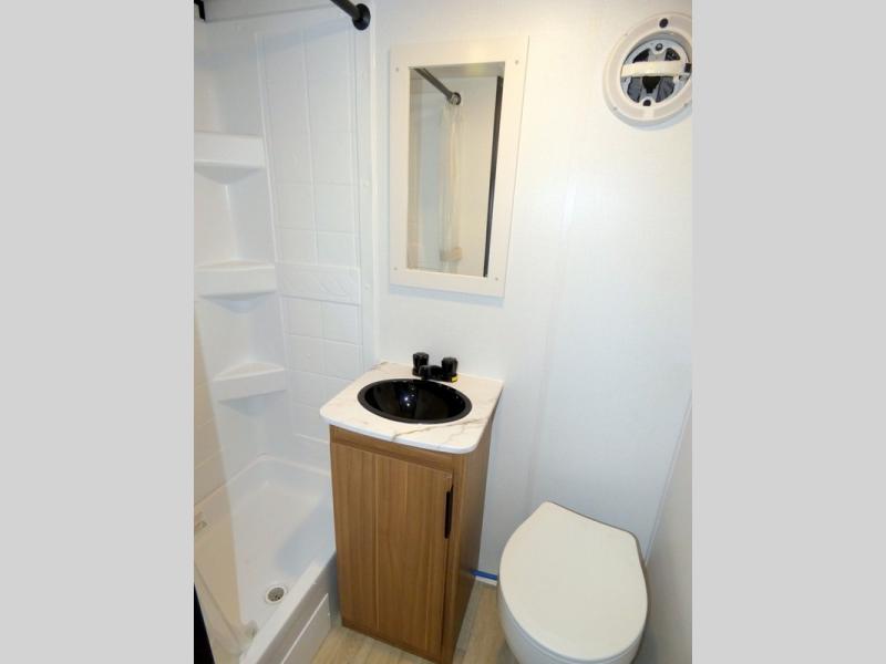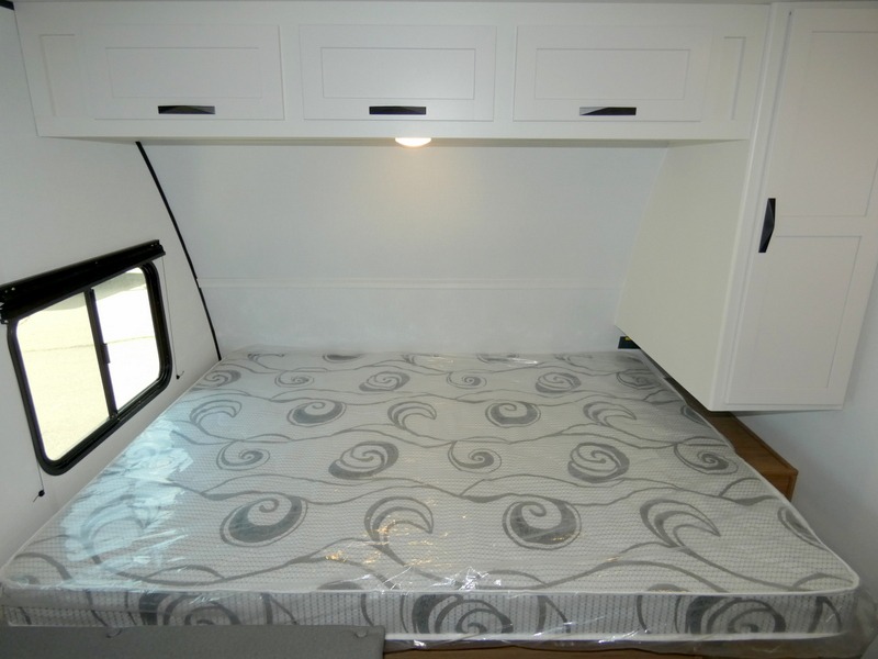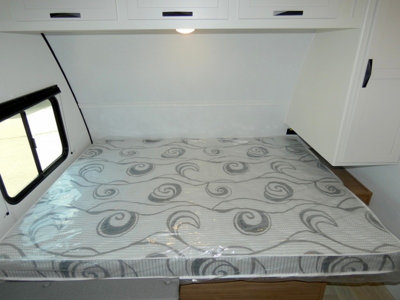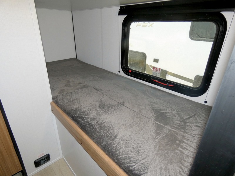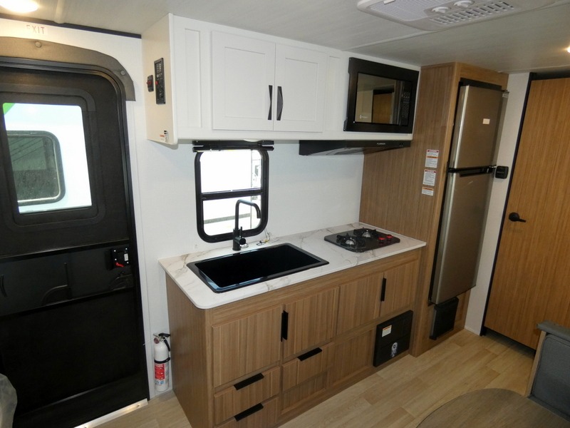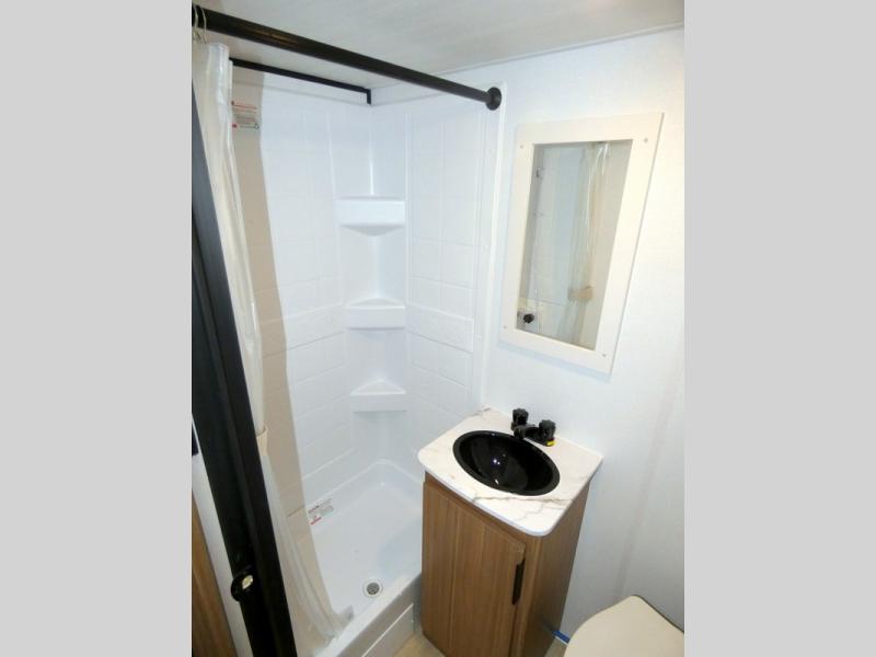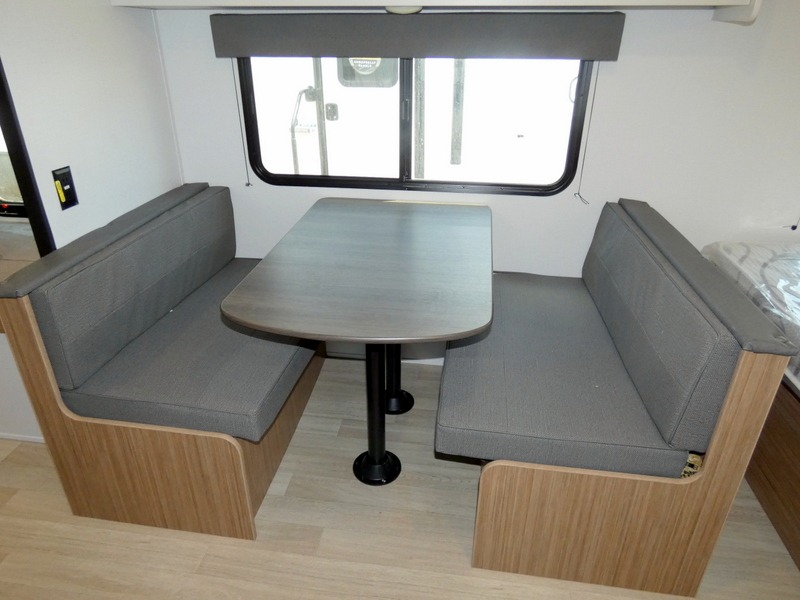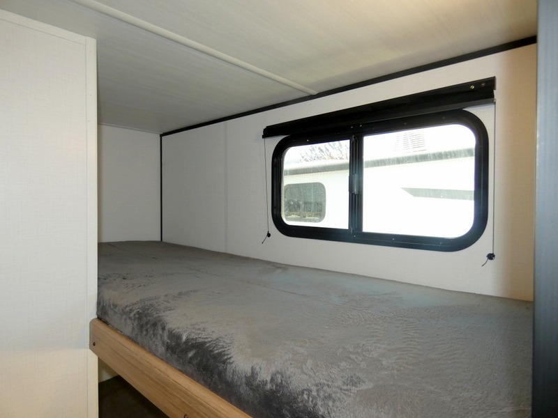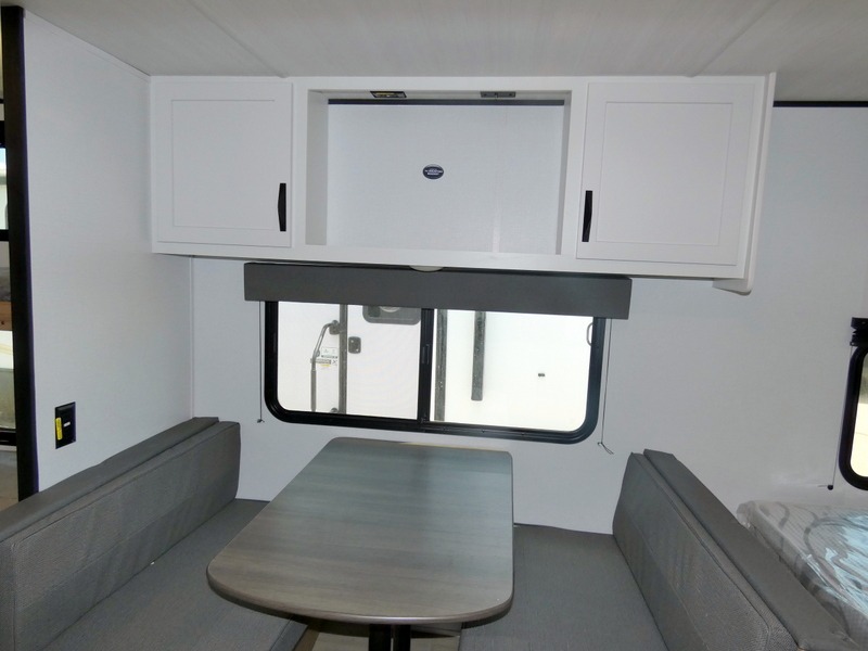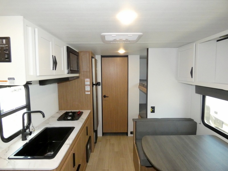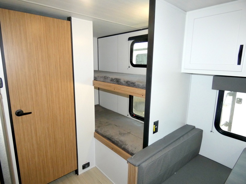 If you're looking for a single axle bunkhouse model, this is the one! The full bath is close by the 28" x 74" bunks for easy nighttime use, and there is also a front queen bed so no one has to sleep on an air mattress. You can make breakfast on the two burner cooktop or in the microwave oven each morning, and the milk can go back in the 12V refrigerator when you're done. A booth dinette provides a place to dine together, or you can sit outdoors under the patio awning!