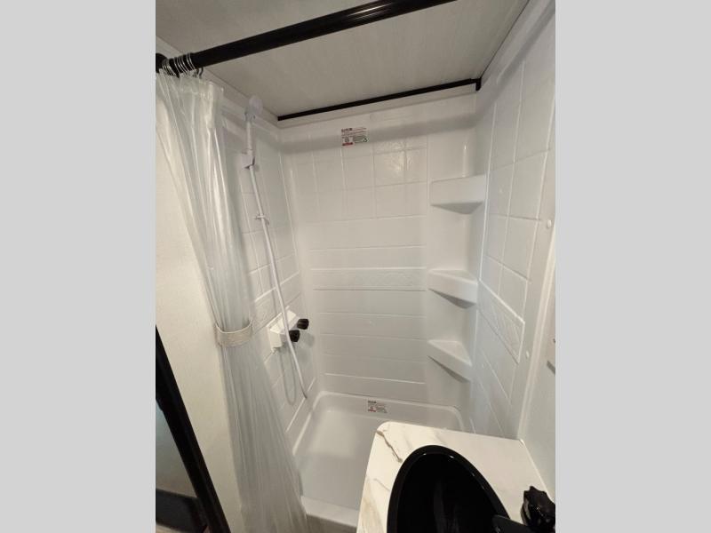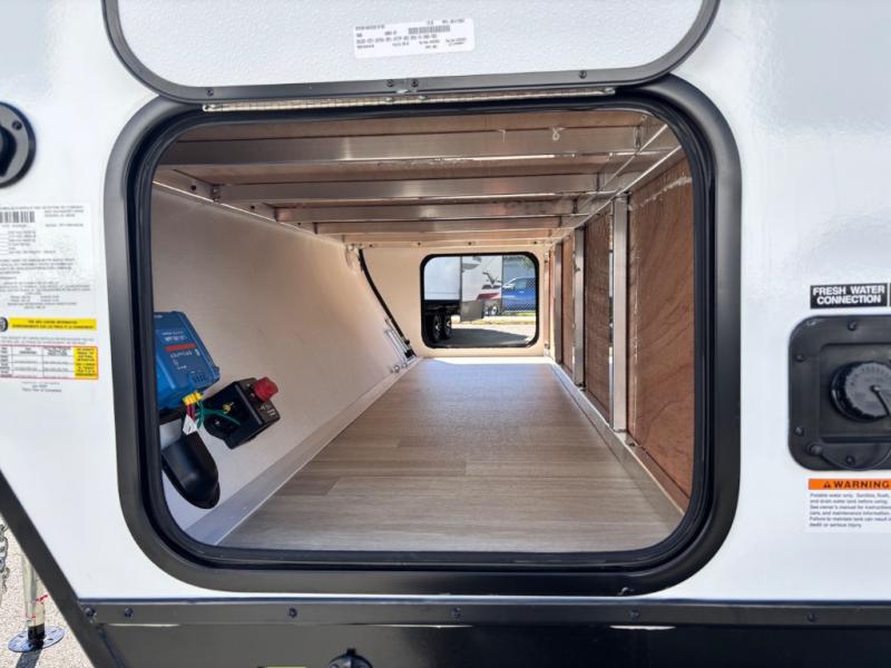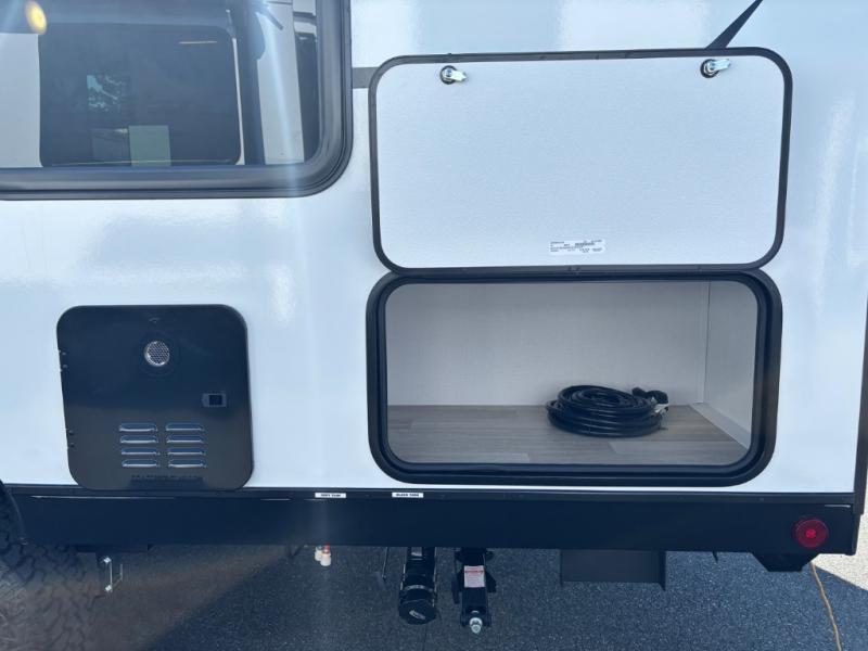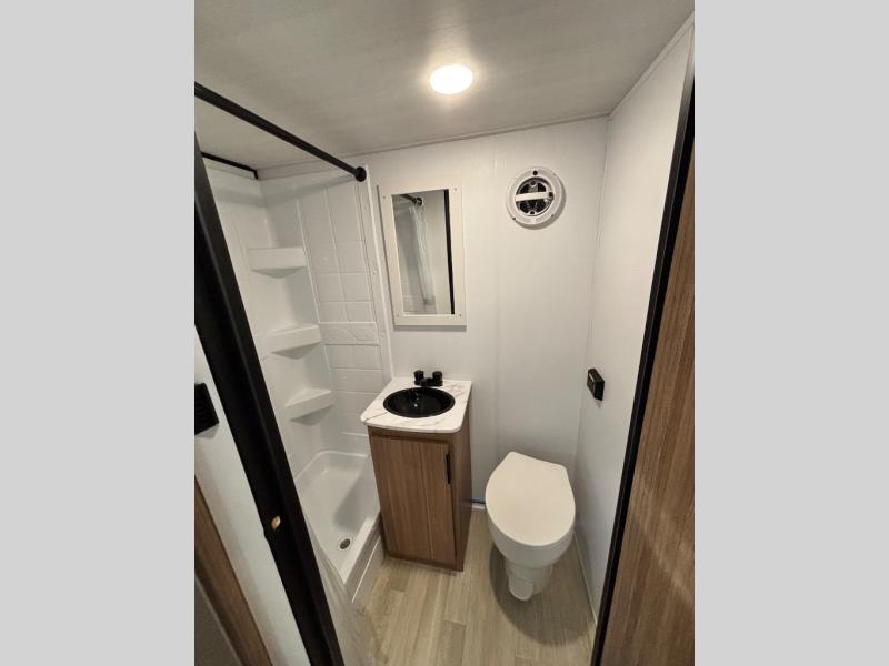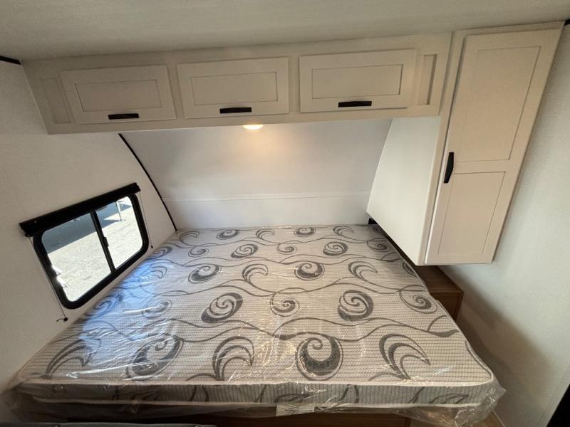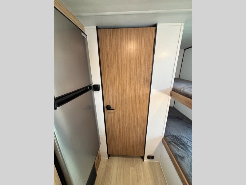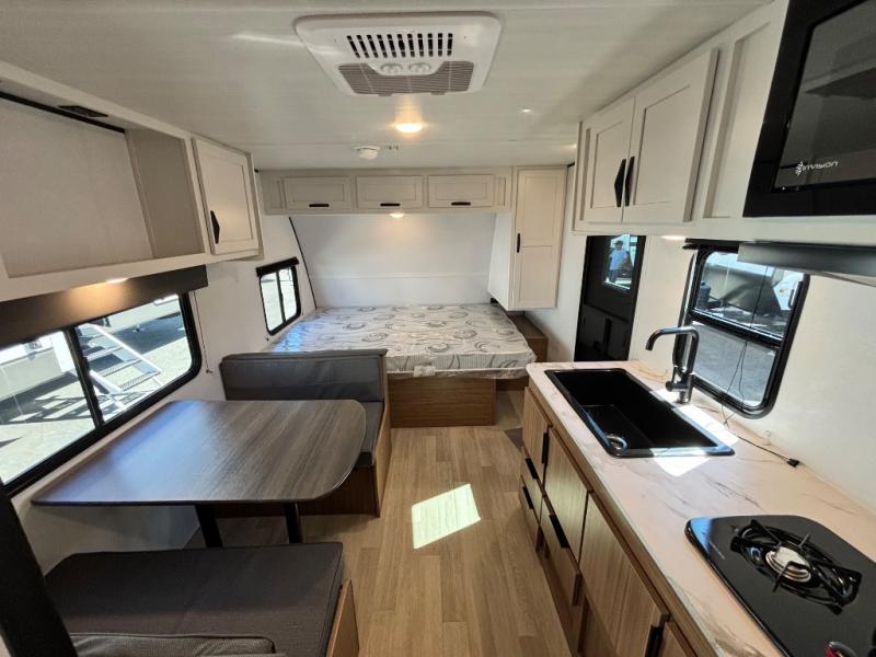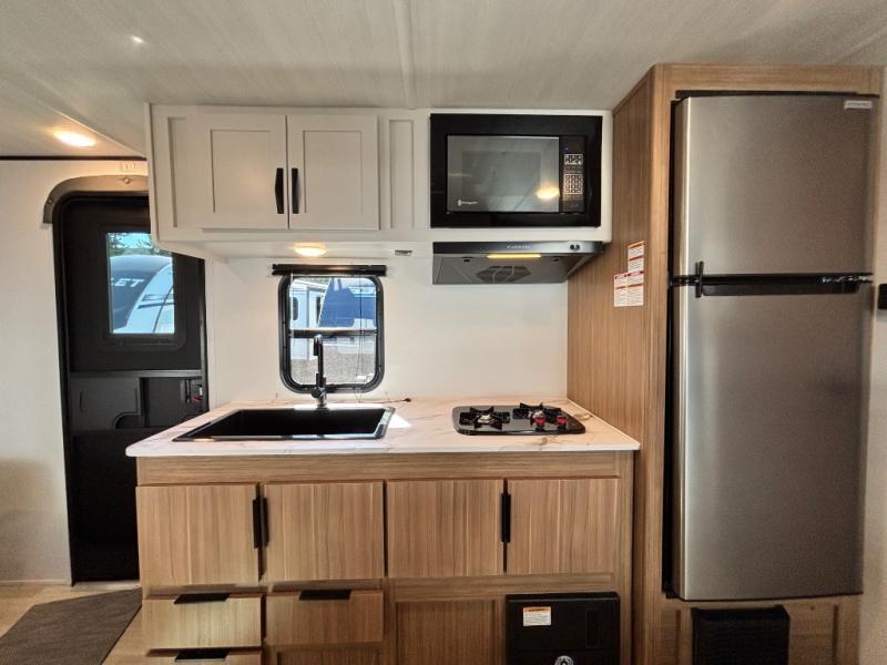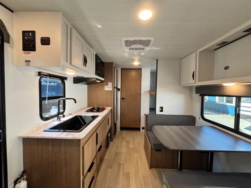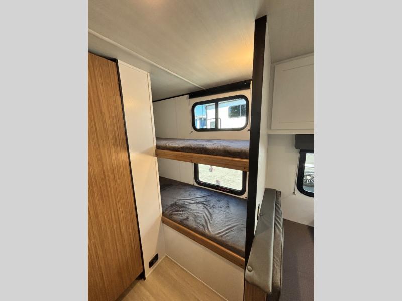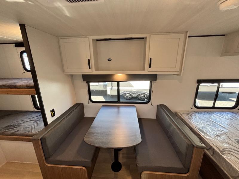 If you're looking for a single axle bunkhouse model, this is the one! The full bath is close by the 28" x 74" bunks for easy nighttime use, and there is also a front queen bed so no one has to sleep on an air mattress. You can make breakfast on the two burner cooktop or in the microwave oven each morning, and the milk can go back in the 12V refrigerator when you're done. A booth dinette provides a place to dine together, or you can sit outdoors under the patio awning!