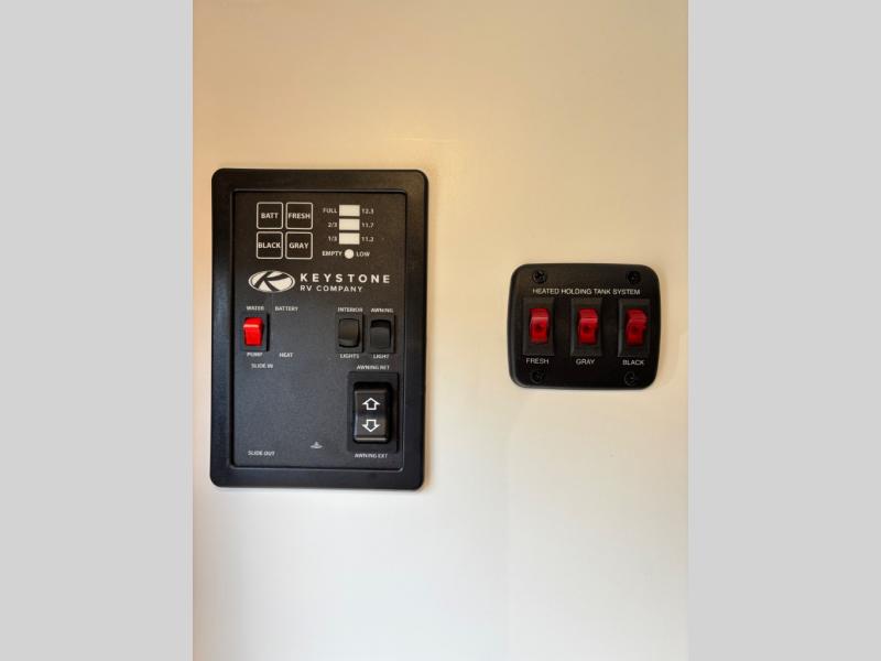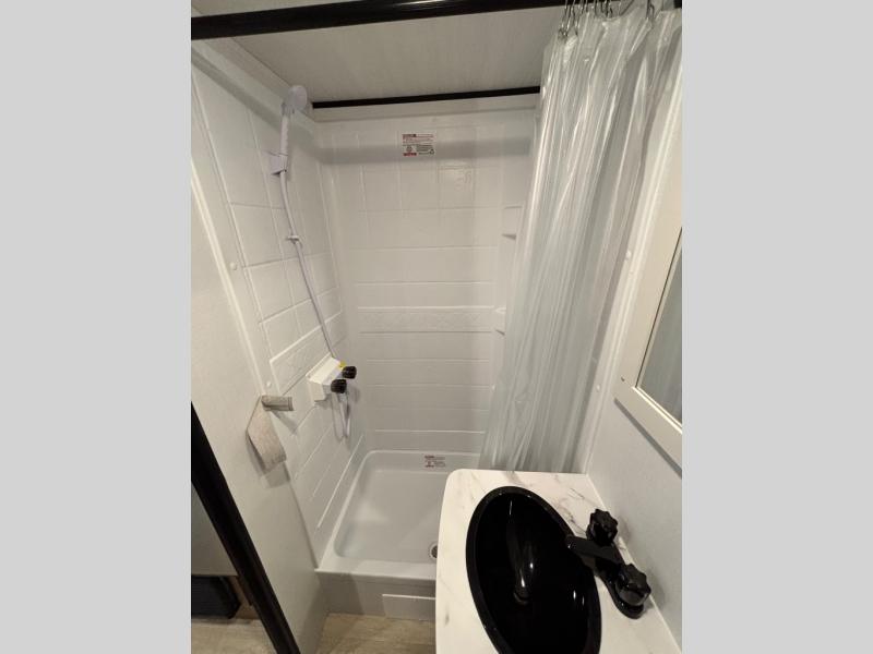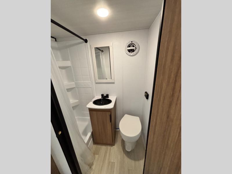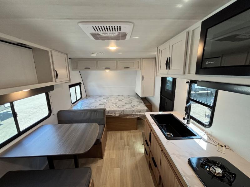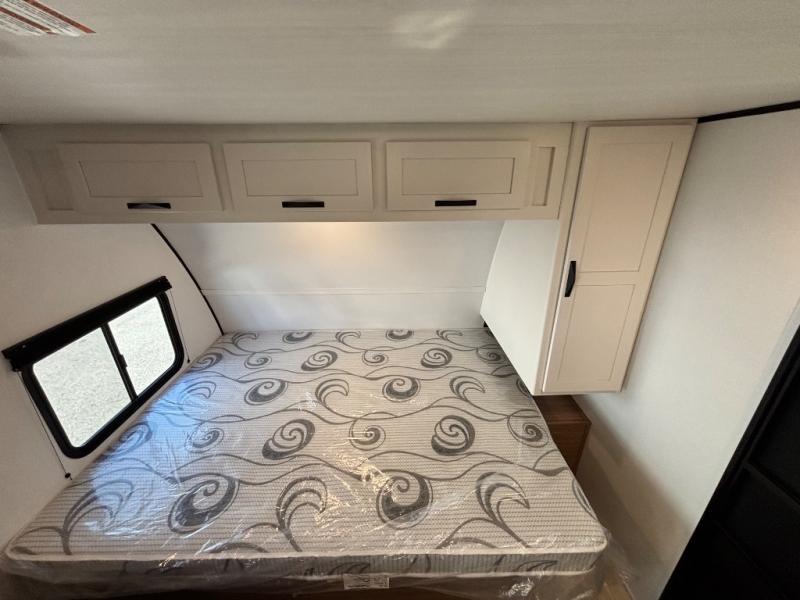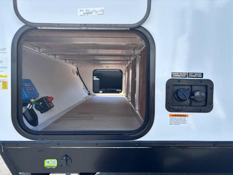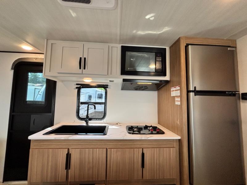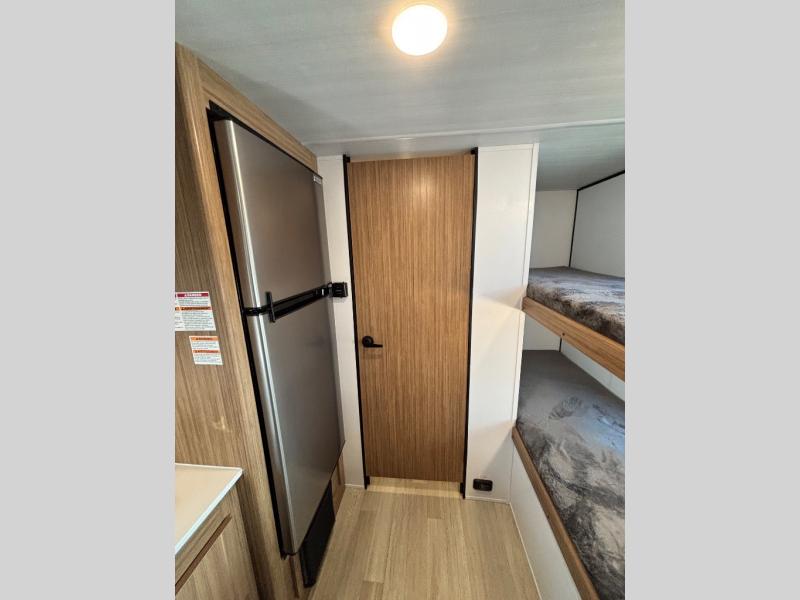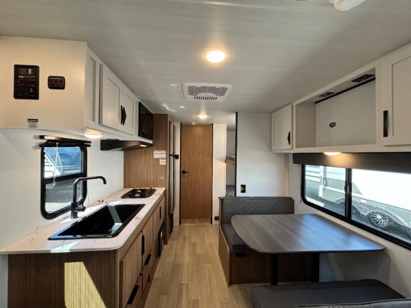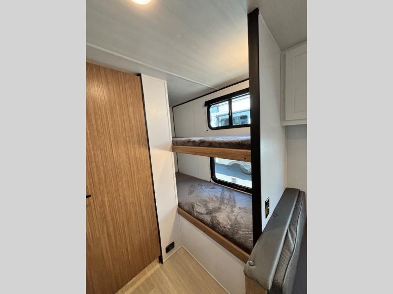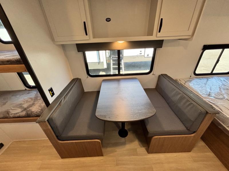 If you're looking for a single axle bunkhouse model, this is the one! The full bath is close by the 28" x 74" bunks for easy nighttime use, and there is also a front queen bed so no one has to sleep on an air mattress. You can make breakfast on the two burner cooktop or in the microwave oven each morning, and the milk can go back in the 12V refrigerator when you're done. A booth dinette provides a place to dine together, or you can sit outdoors under the patio awning!