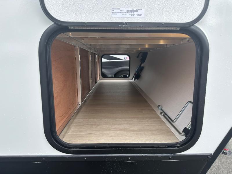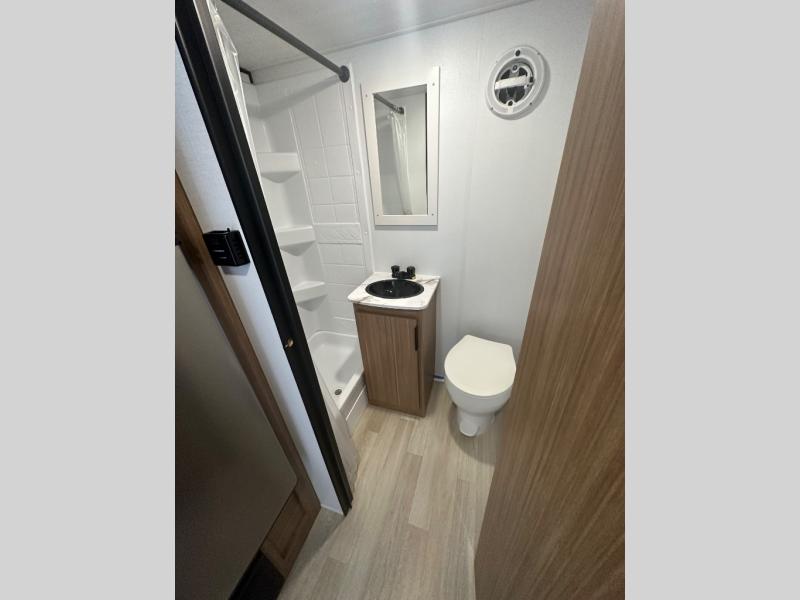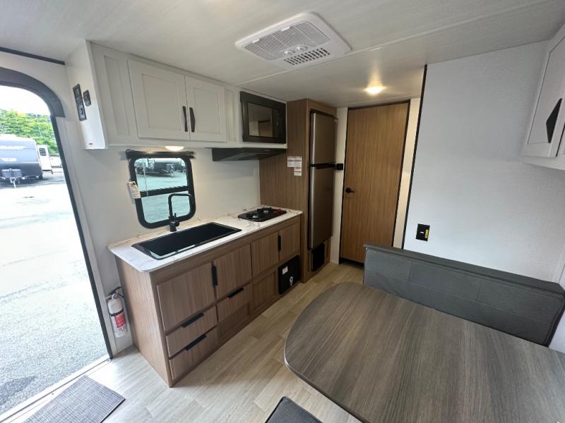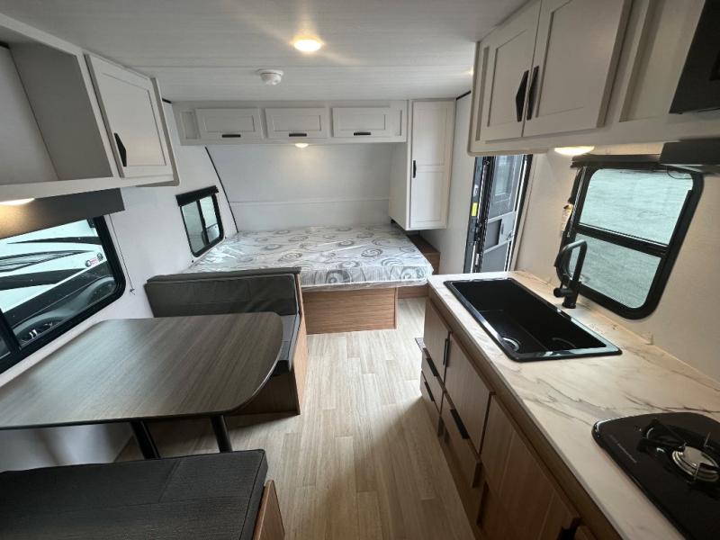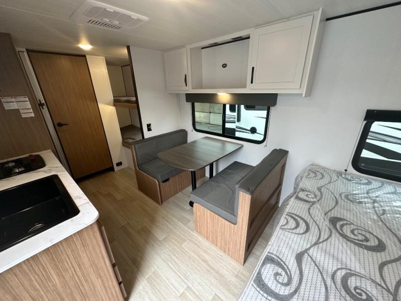 If you're looking for a single axle bunkhouse model, this is the one! The full bath is close by the 28" x 74" bunks for easy nighttime use, and there is also a front queen bed so no one has to sleep on an air mattress. You can make breakfast on the two burner cooktop or in the microwave oven each morning, and the milk can go back in the 12V refrigerator when you're done. A booth dinette provides a place to dine together, or you can sit outdoors under the patio awning!