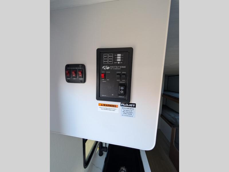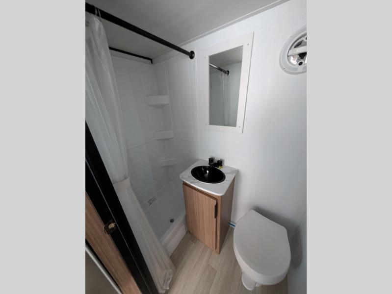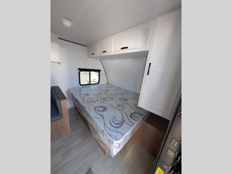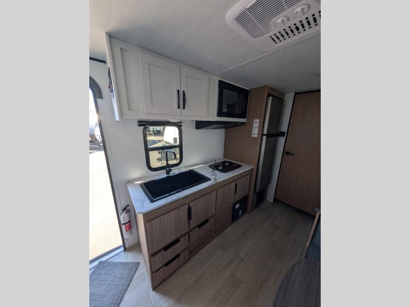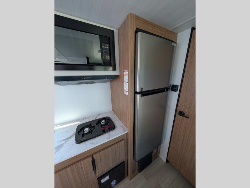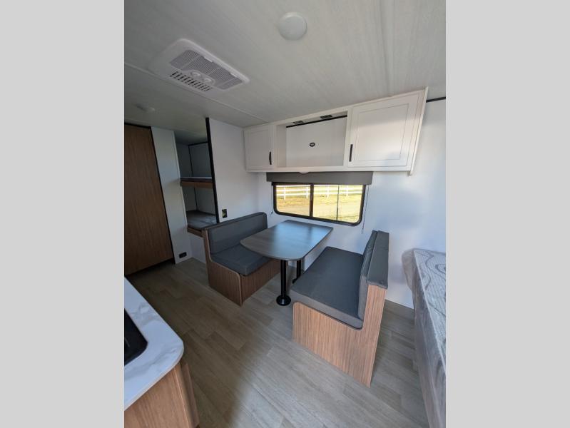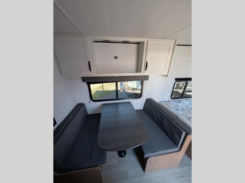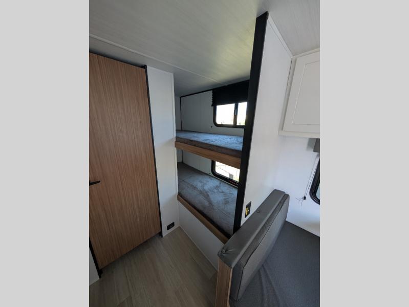 If you're looking for a single axle bunkhouse model, this is the one! The full bath is close by the 28" x 74" bunks for easy nighttime use, and there is also a front queen bed so no one has to sleep on an air mattress. You can make breakfast on the two burner cooktop or in the microwave oven each morning, and the milk can go back in the 12V refrigerator when you're done. A booth dinette provides a place to dine together, or you can sit outdoors under the patio awning!