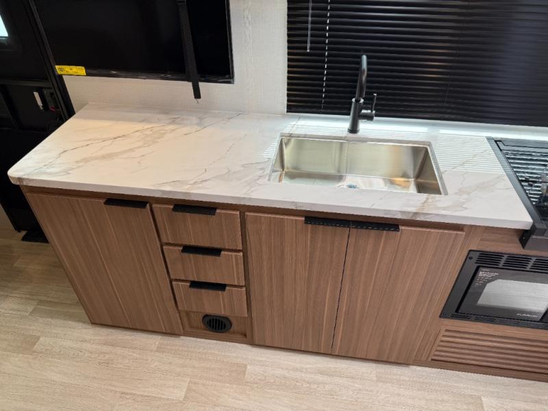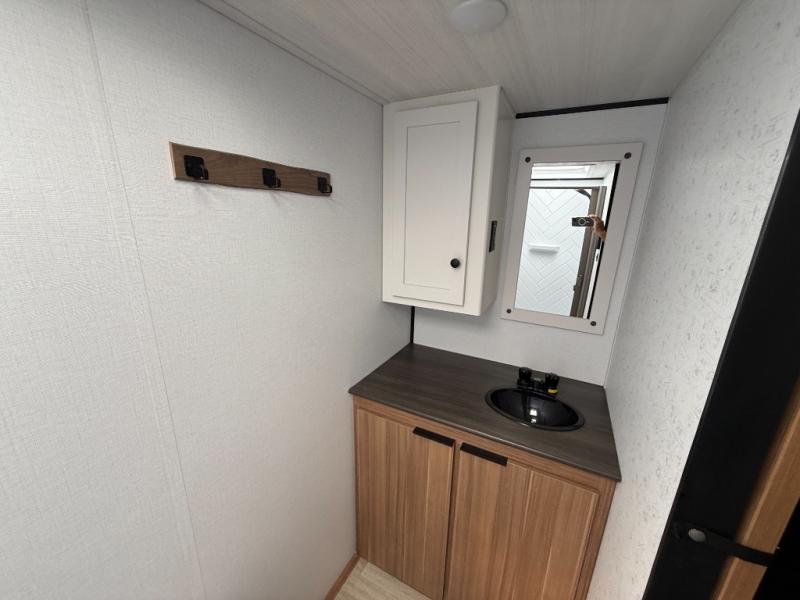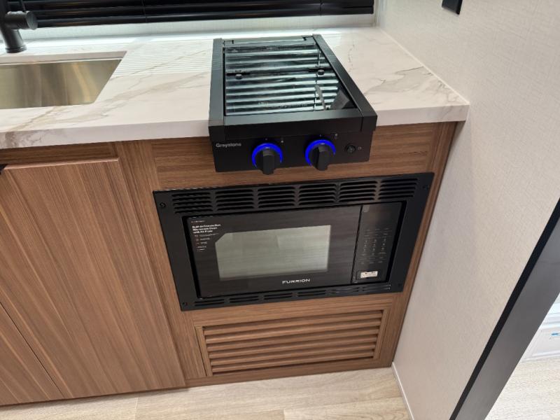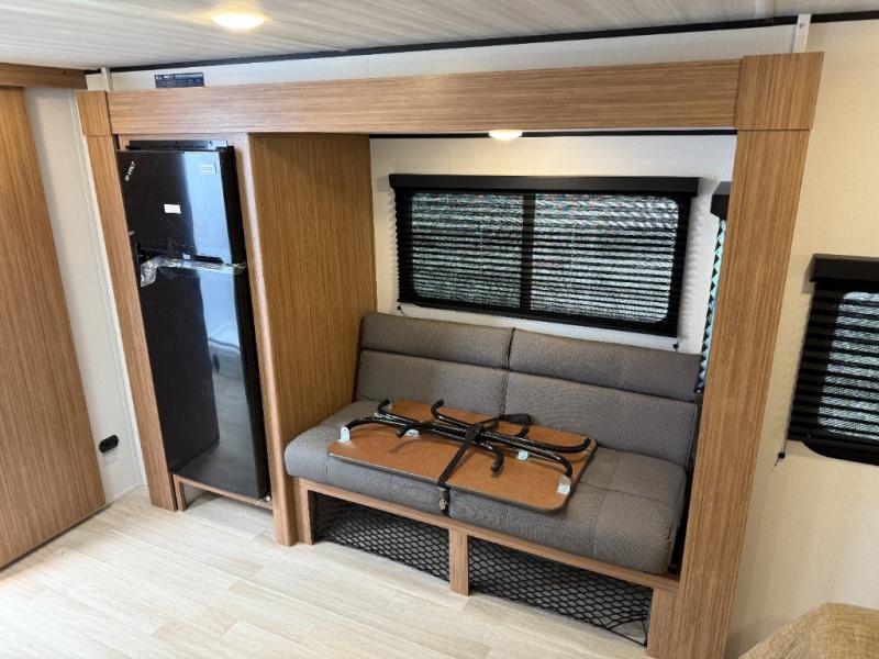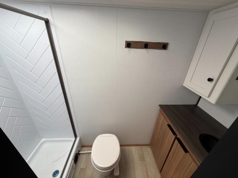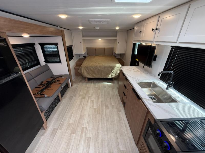 This rear bath, dual axle travel trailer will be perfect for trips to the campground. When you arrive at your site, you can unload the pass-through storage and put out the 14' awning for some shade. The two burner cooktop and microwave oven inside will let you make lunch, and there is a jack knife sofa slide where you can relax on. When it's time to call it a night, you can freshen up in the full rear bath before crashing on the front queen bed!