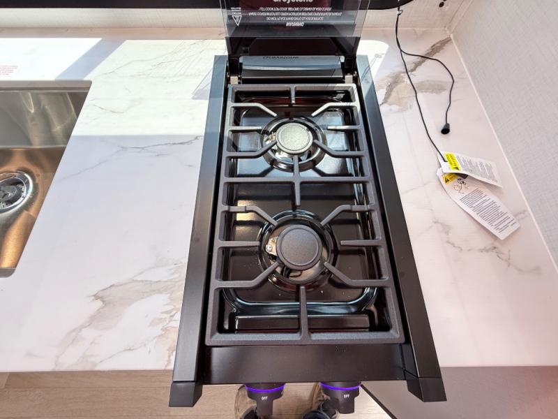 This rear bath, dual axle travel trailer will be perfect for trips to the campground. When you arrive at your site, you can unload the pass-through storage and put out the 14' awning for some shade. The two burner cooktop and microwave oven inside will let you make lunch, and there is a jack knife sofa slide where you can relax on. When it's time to call it a night, you can freshen up in the full rear bath before crashing on the front queen bed!