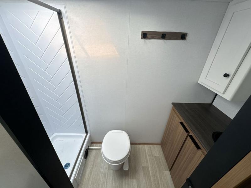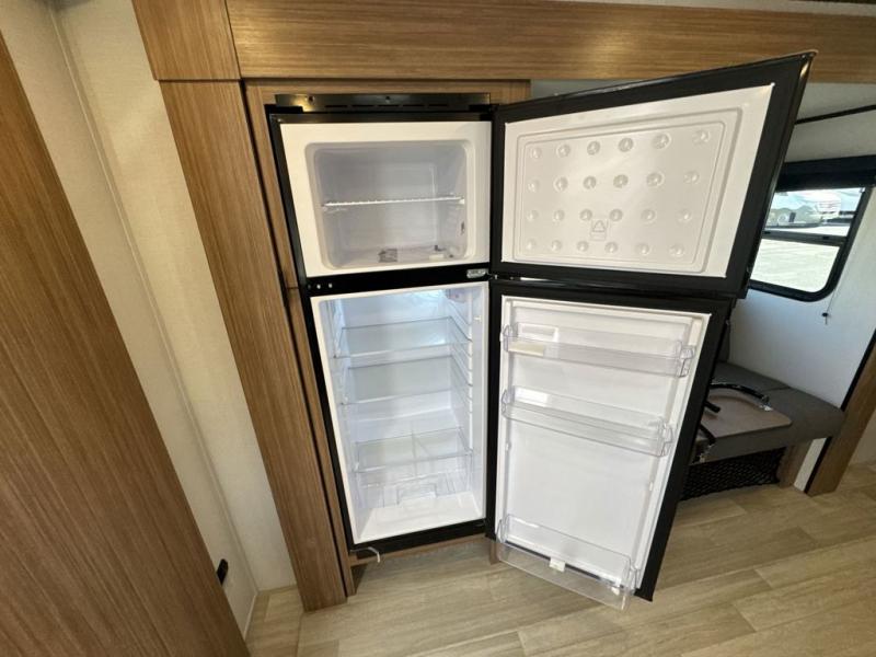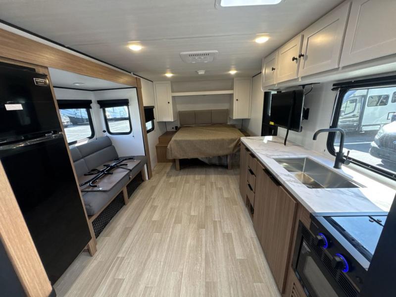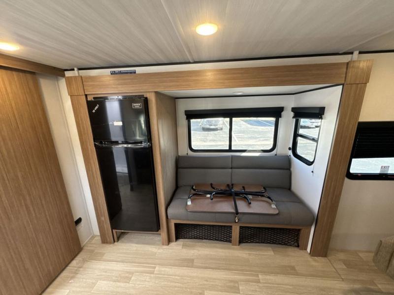 This rear bath, dual axle travel trailer will be perfect for trips to the campground. When you arrive at your site, you can unload the pass-through storage and put out the 14' awning for some shade. The two burner cooktop and microwave oven inside will let you make lunch, and there is a jack knife sofa slide where you can relax on. When it's time to call it a night, you can freshen up in the full rear bath before crashing on the front queen bed!
