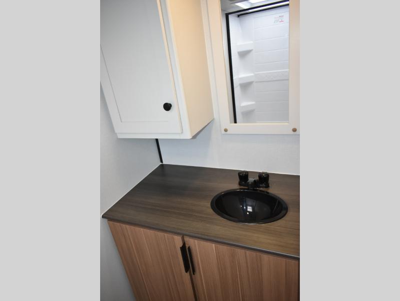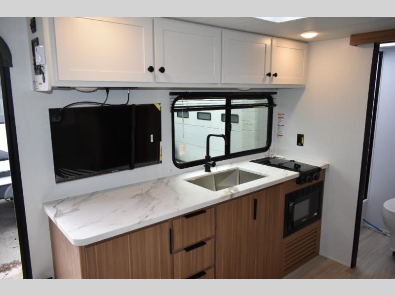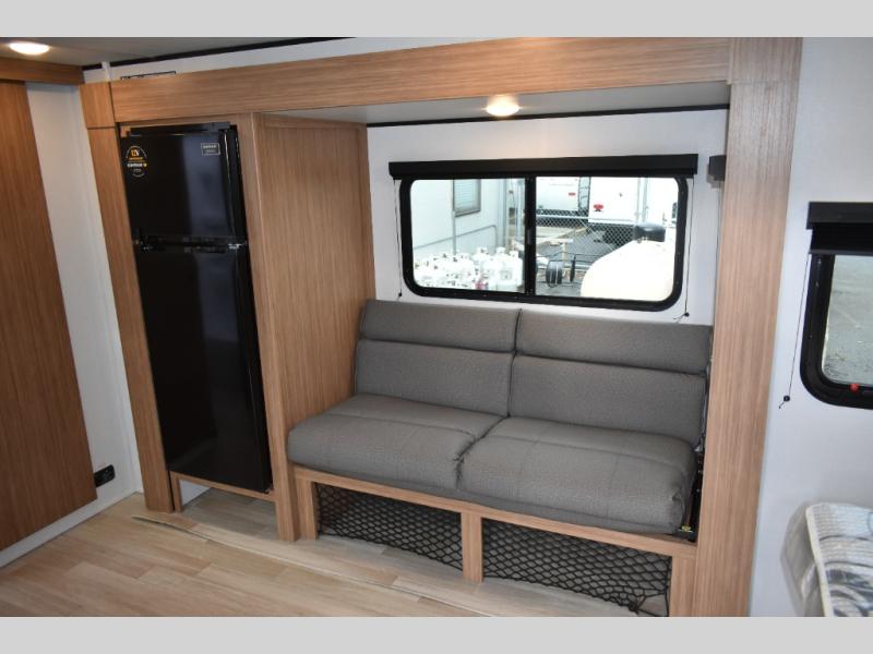 This rear bath, dual axle travel trailer will be perfect for trips to the campground. When you arrive at your site, you can unload the pass-through storage and put out the 14' awning for some shade. The two burner cooktop and microwave oven inside will let you make lunch, and there is a jack knife sofa slide where you can relax on. When it's time to call it a night, you can freshen up in the full rear bath before crashing on the front queen bed!