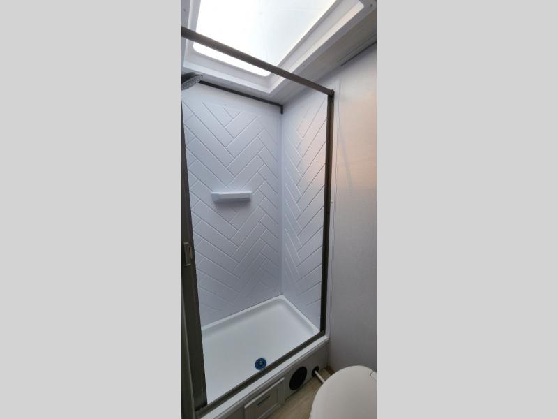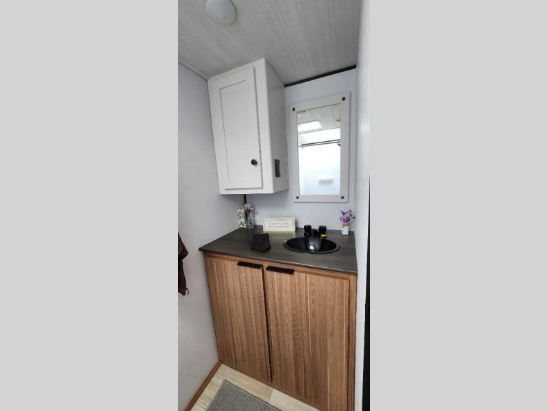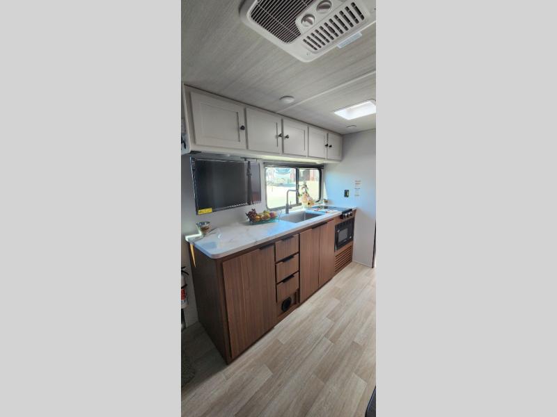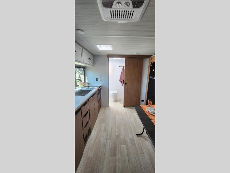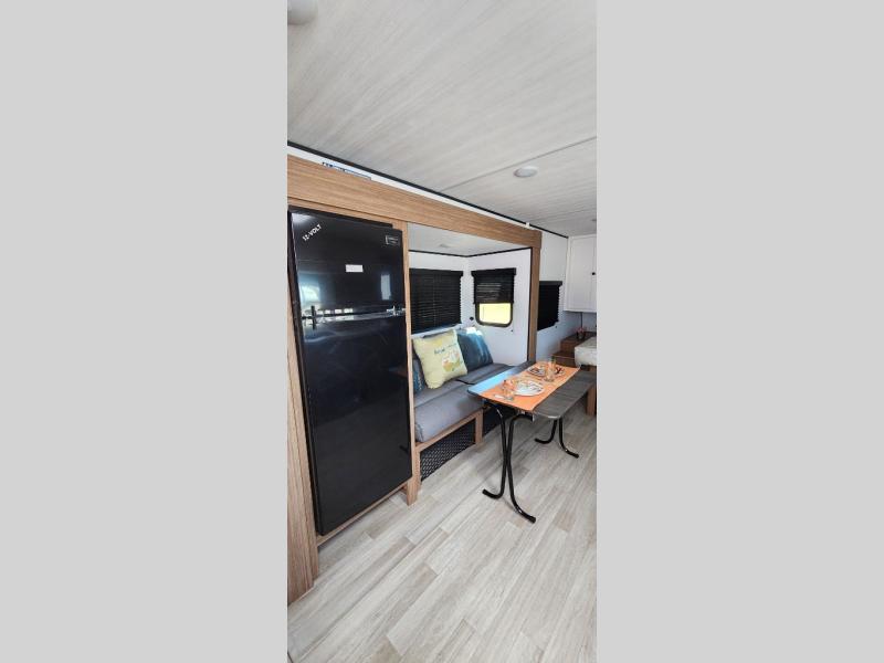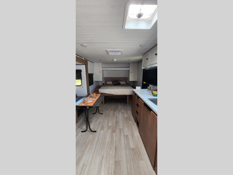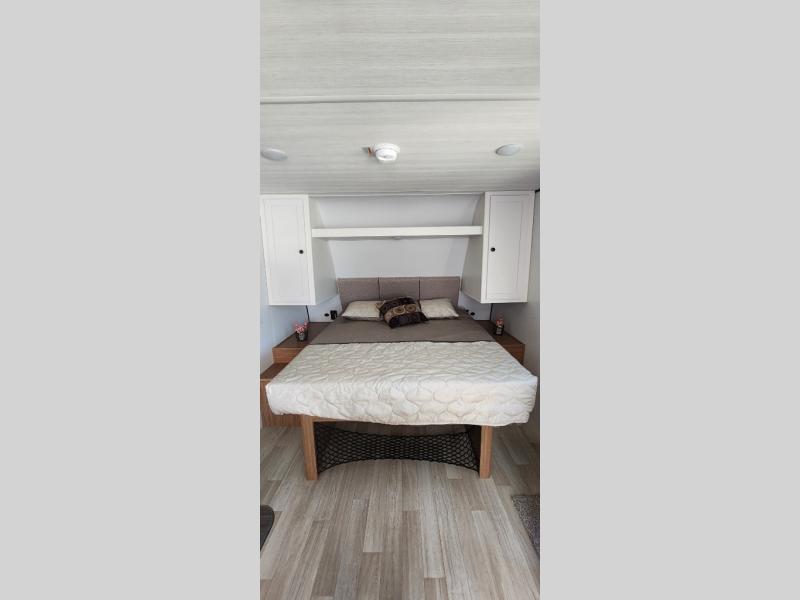 This rear bath, dual axle travel trailer will be perfect for trips to the campground. When you arrive at your site, you can unload the pass-through storage and put out the 14' awning for some shade. The two burner cooktop and microwave oven inside will let you make lunch, and there is a jack knife sofa slide where you can relax on. When it's time to call it a night, you can freshen up in the full rear bath before crashing on the front queen bed!