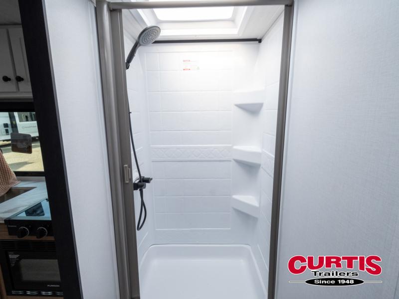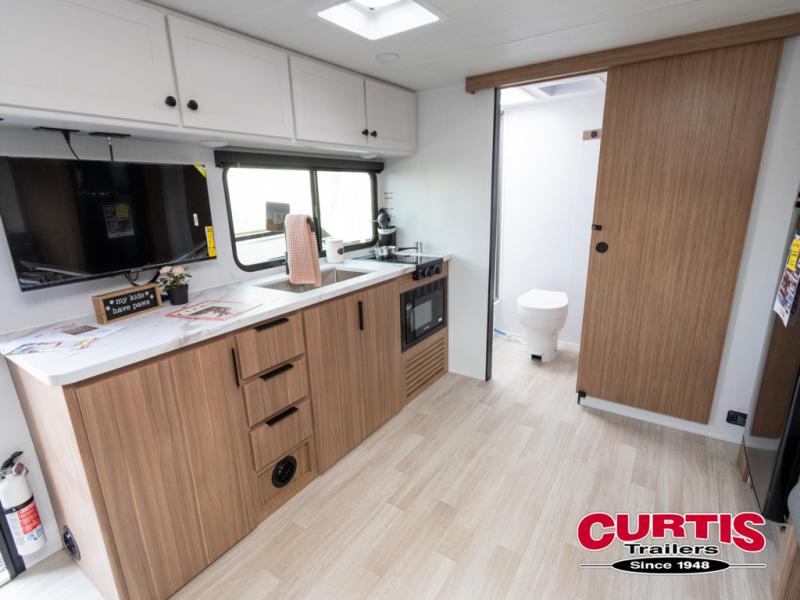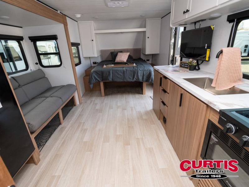 This rear bath, dual axle travel trailer will be perfect for trips to the campground. When you arrive at your site, you can unload the pass-through storage and put out the 14' awning for some shade. The two burner cooktop and microwave oven inside will let you make lunch, and there is a jack knife sofa slide where you can relax on. When it's time to call it a night, you can freshen up in the full rear bath before crashing on the front queen bed!