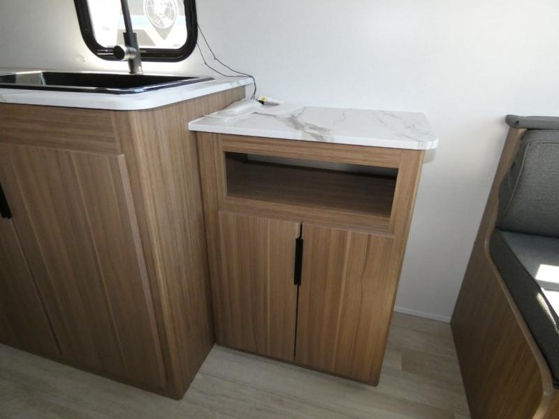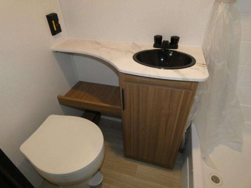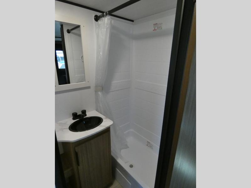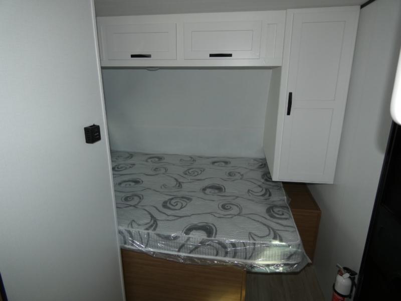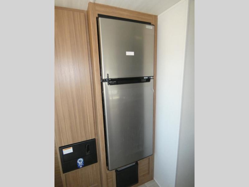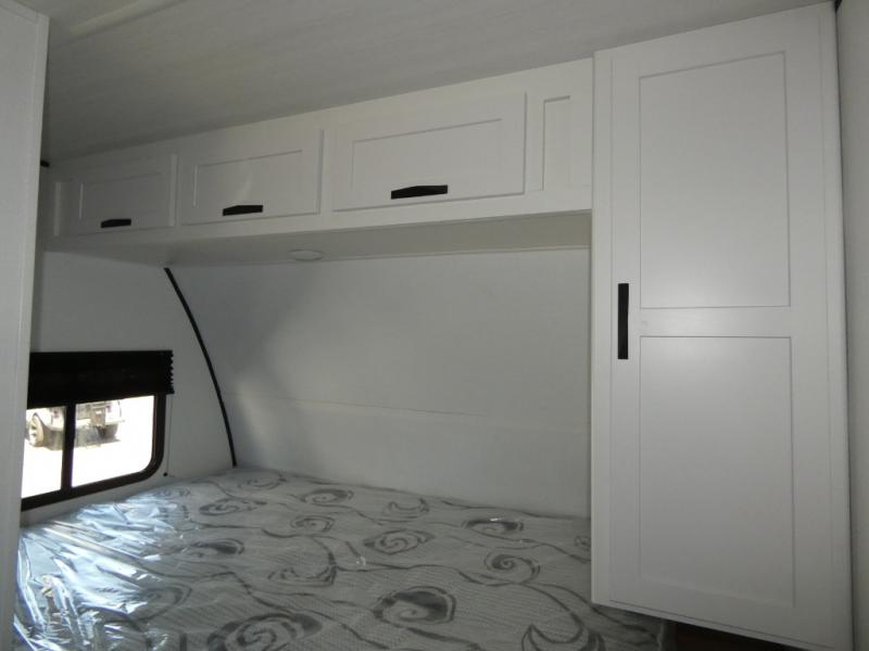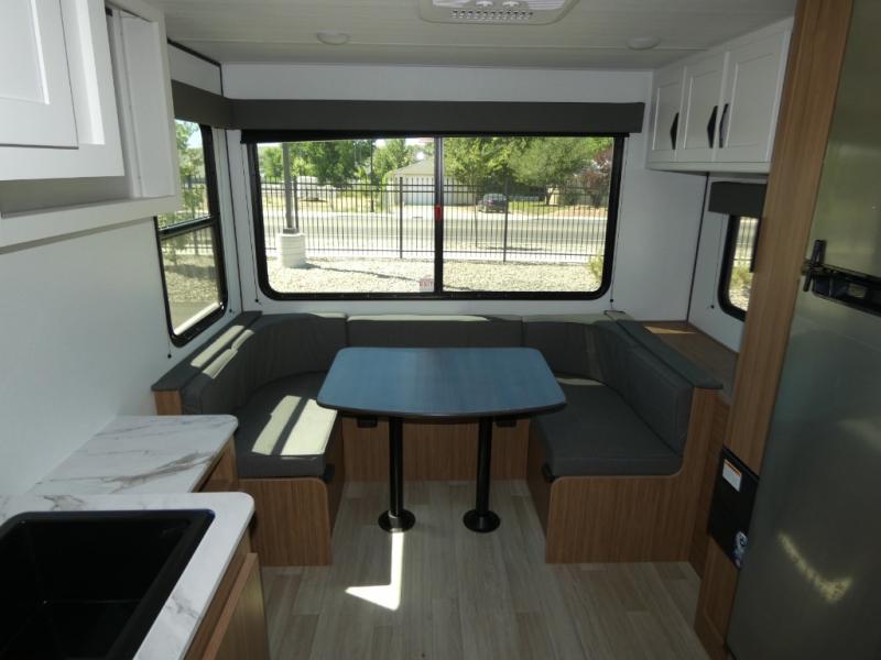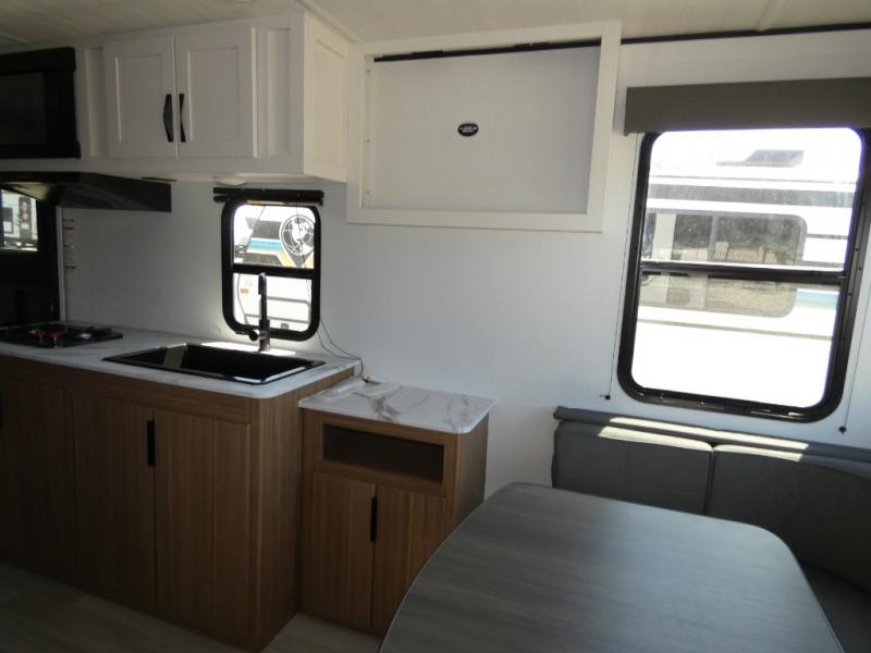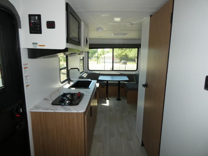 Pack your bags and hitch up this travel trailer for a fun weekend excursion! You can get a good night's sleep on the front queen bed with a wardrobe at the foot of the bed, and overhead cabinets above it for your items. You can also transform the U-shaped dinette with a counter next to it into an extra sleeping space. The chef of your group can make meals on the two burner range or in the microwave if you're on the go. There is also a large double door 12V refrigerator and pantry for food storage. Outside, you can relax underneath the patio awning and store all of your gear in the front exterior pass-through storage area!