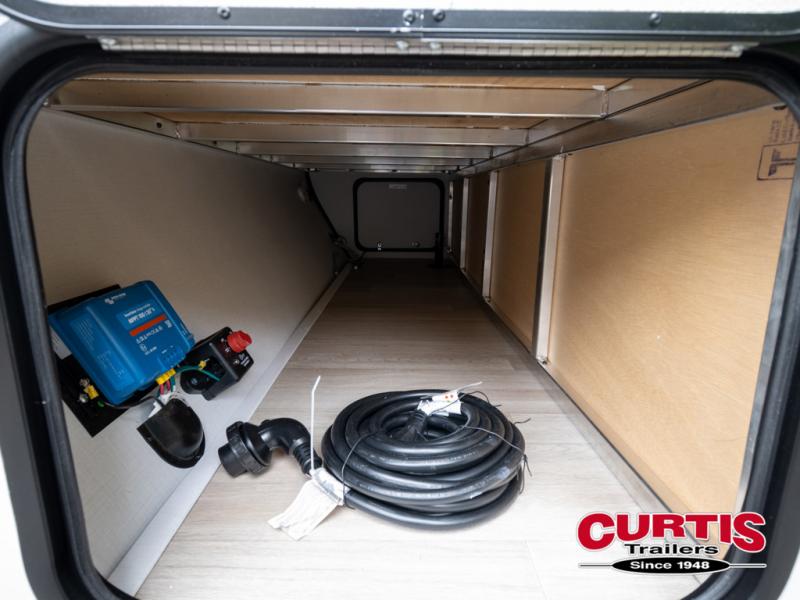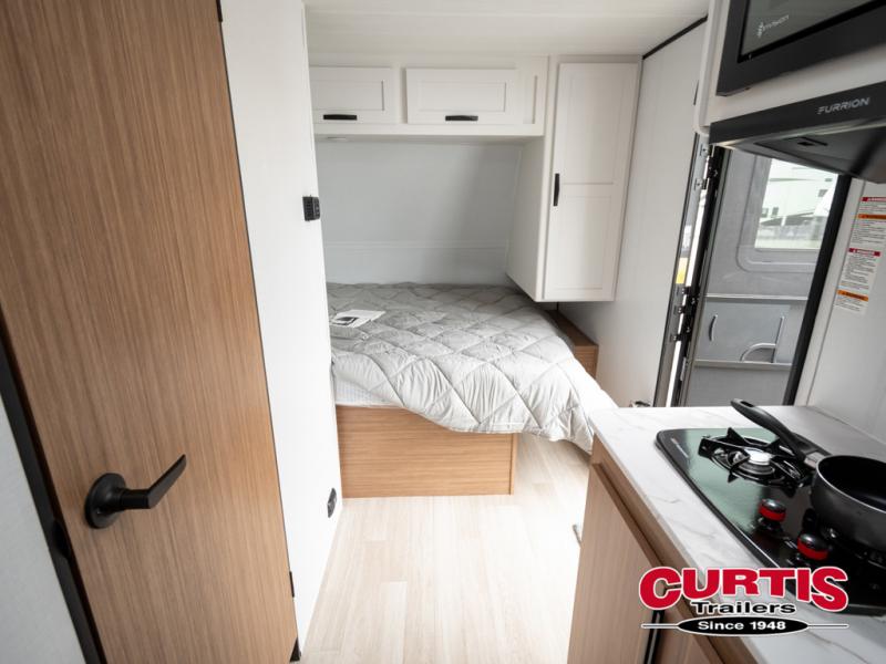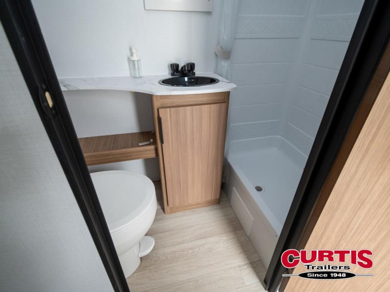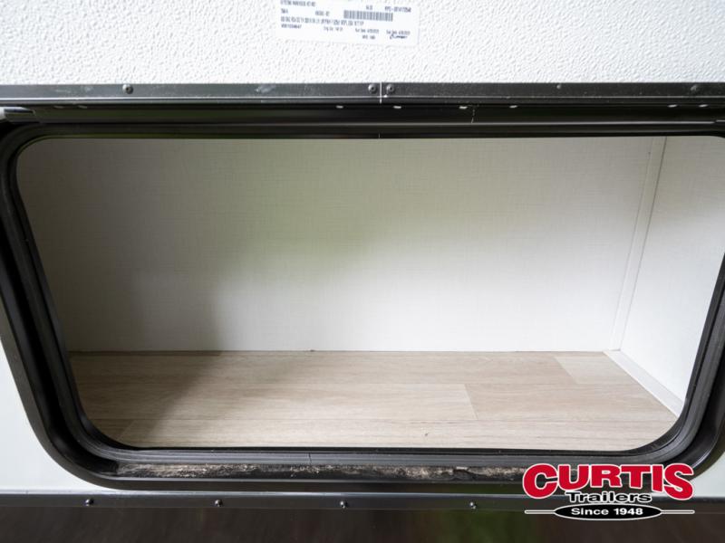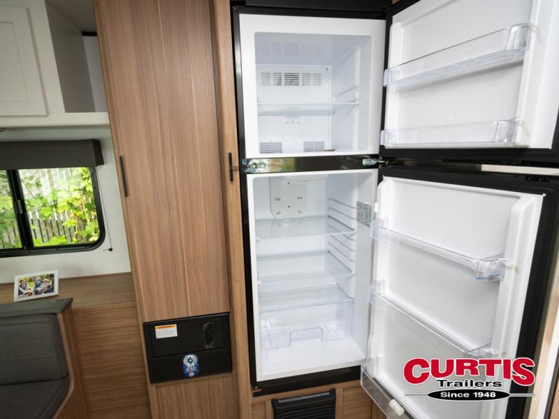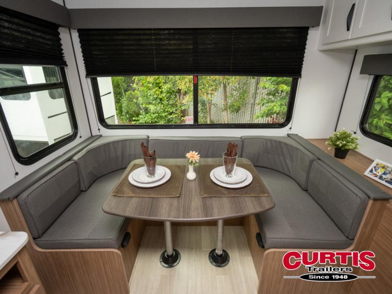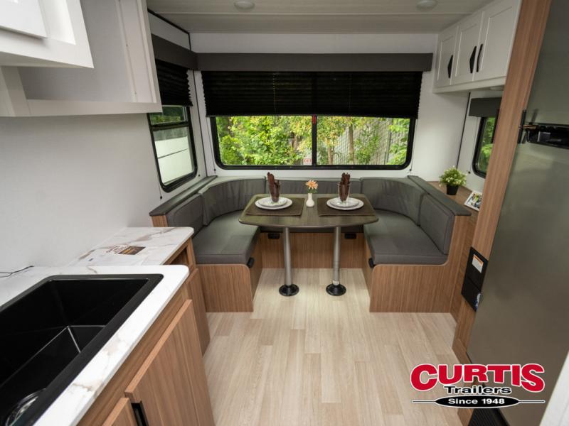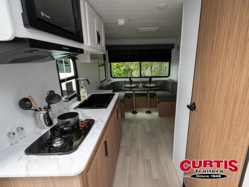 Pack your bags and hitch up this travel trailer for a fun weekend excursion! You can get a good night's sleep on the front queen bed with a wardrobe at the foot of the bed, and overhead cabinets above it for your items. You can also transform the U-shaped dinette with a counter next to it into an extra sleeping space. The chef of your group can make meals on the two burner range or in the microwave if you're on the go. There is also a large double door 12V refrigerator and pantry for food storage. Outside, you can relax underneath the patio awning and store all of your gear in the front exterior pass-through storage area!