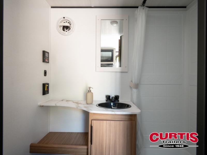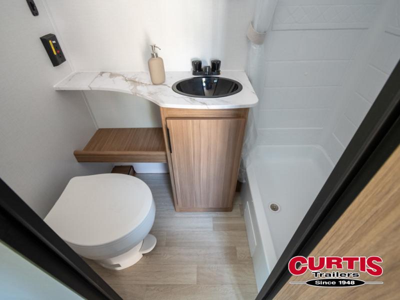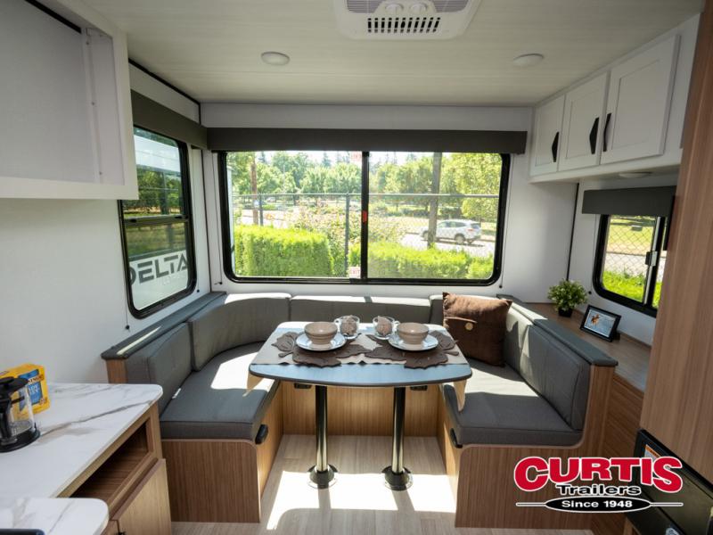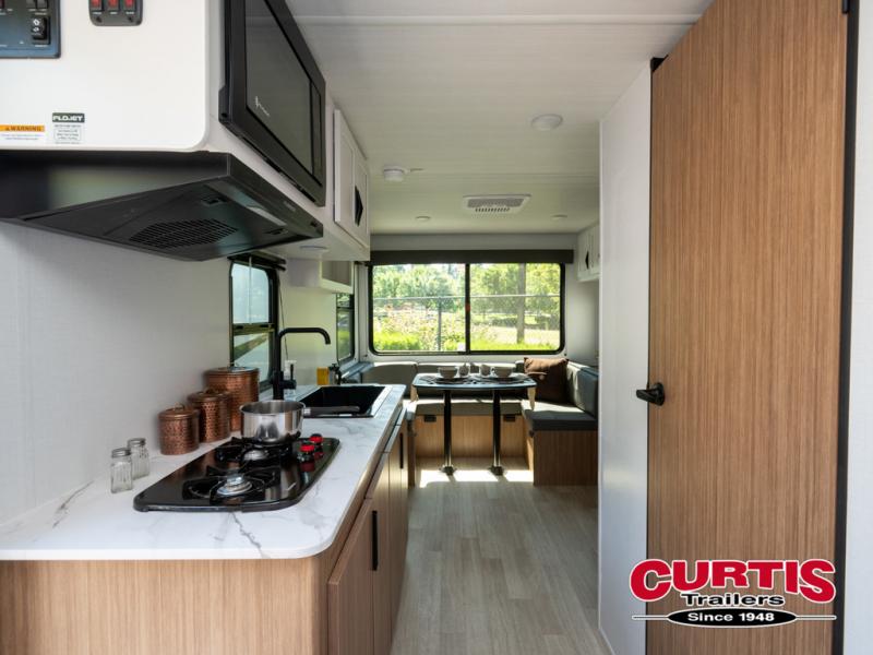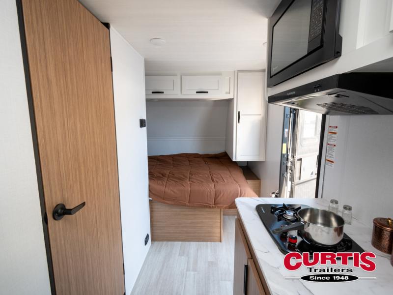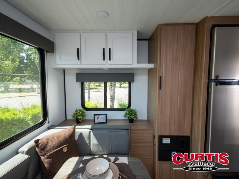 Pack your bags and hitch up this travel trailer for a fun weekend excursion! You can get a good night's sleep on the front queen bed with a wardrobe at the foot of the bed, and overhead cabinets above it for your items. You can also transform the U-shaped dinette with a counter next to it into an extra sleeping space. The chef of your group can make meals on the two burner range or in the microwave if you're on the go. There is also a large double door 12V refrigerator and pantry for food storage. Outside, you can relax underneath the patio awning and store all of your gear in the front exterior pass-through storage area!