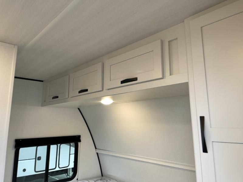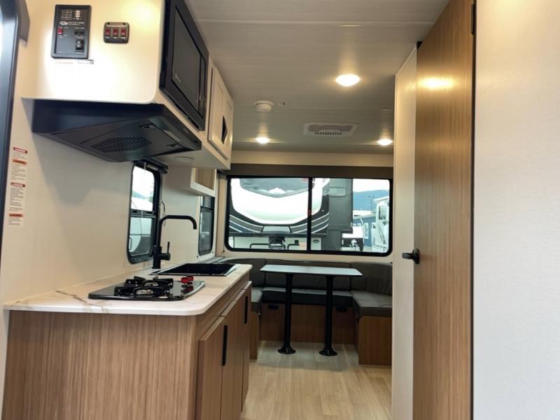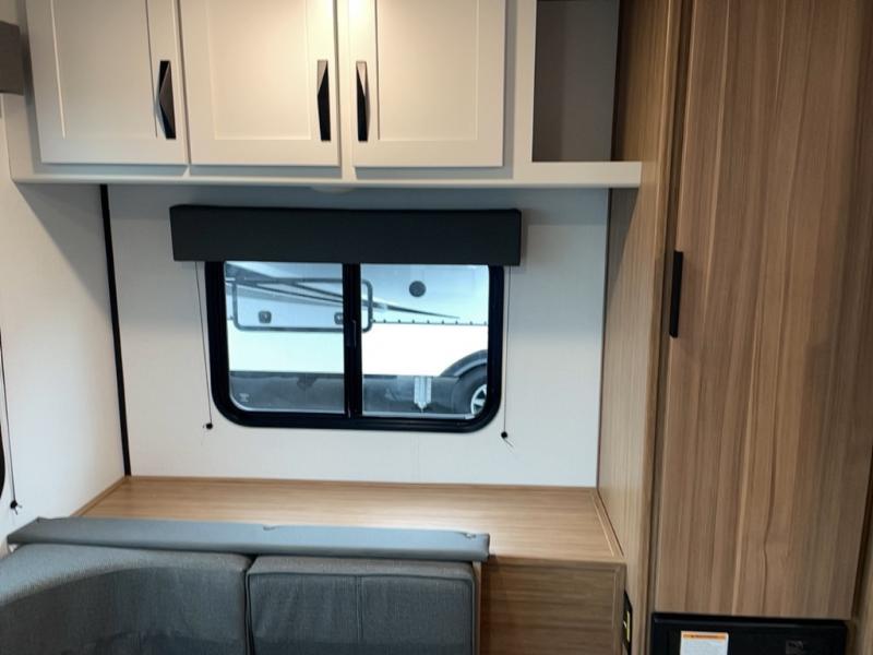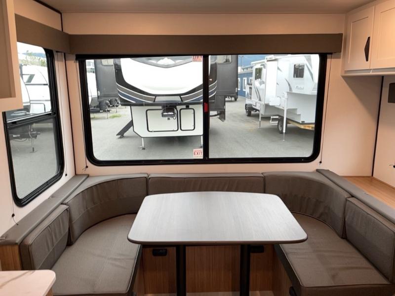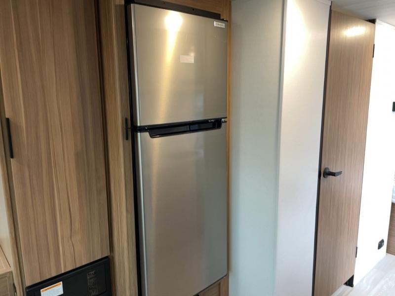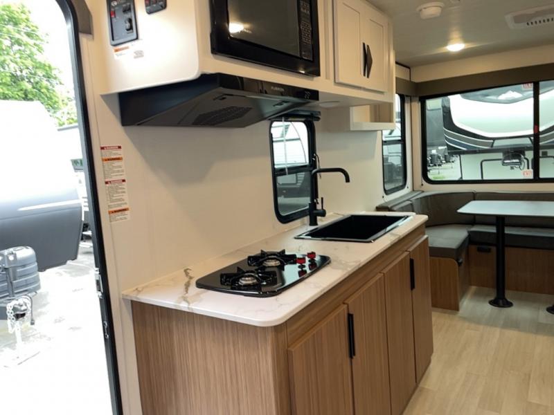 Pack your bags and hitch up this travel trailer for a fun weekend excursion! You can get a good night's sleep on the front queen bed with a wardrobe at the foot of the bed, and overhead cabinets above it for your items. You can also transform the U-shaped dinette with a counter next to it into an extra sleeping space. The chef of your group can make meals on the two burner range or in the microwave if you're on the go. There is also a large double door 12V refrigerator and pantry for food storage. Outside, you can relax underneath the patio awning and store all of your gear in the front exterior pass-through storage area!